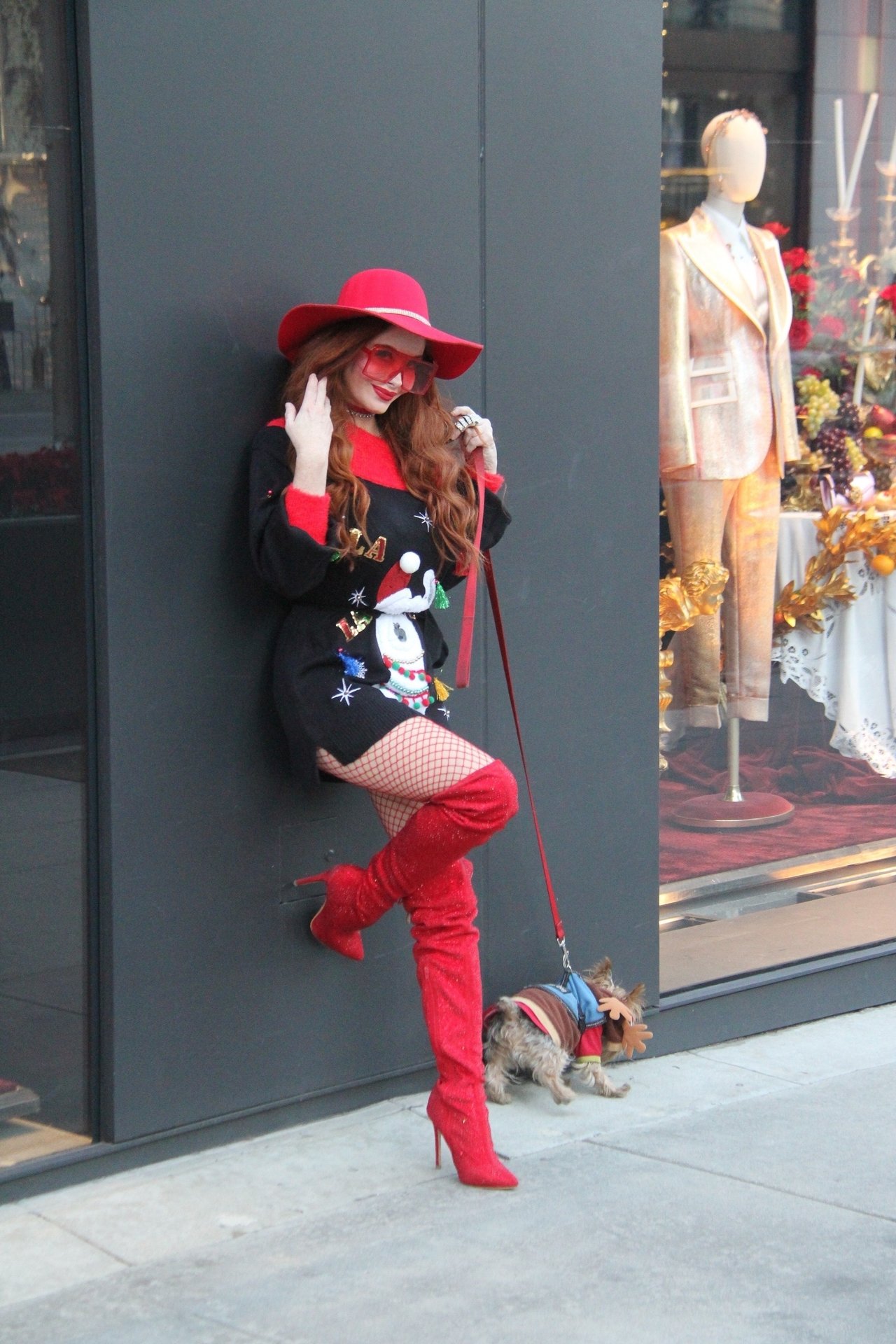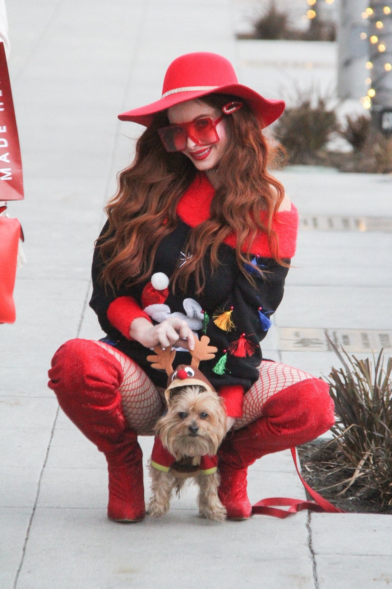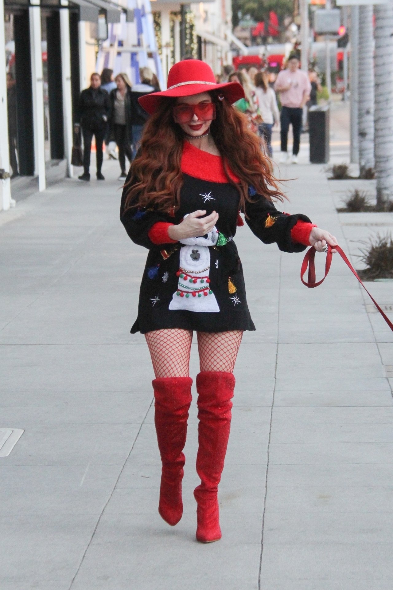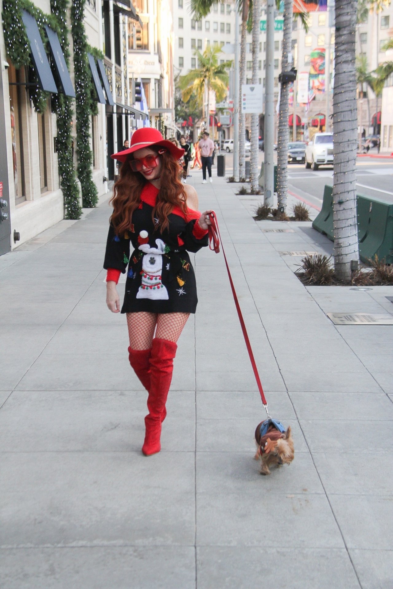 Phoebe Price shows off her ugly Christmas sweater while holiday shopping with her dog in Beverly Hills.