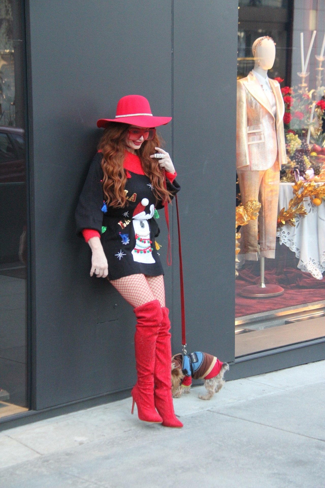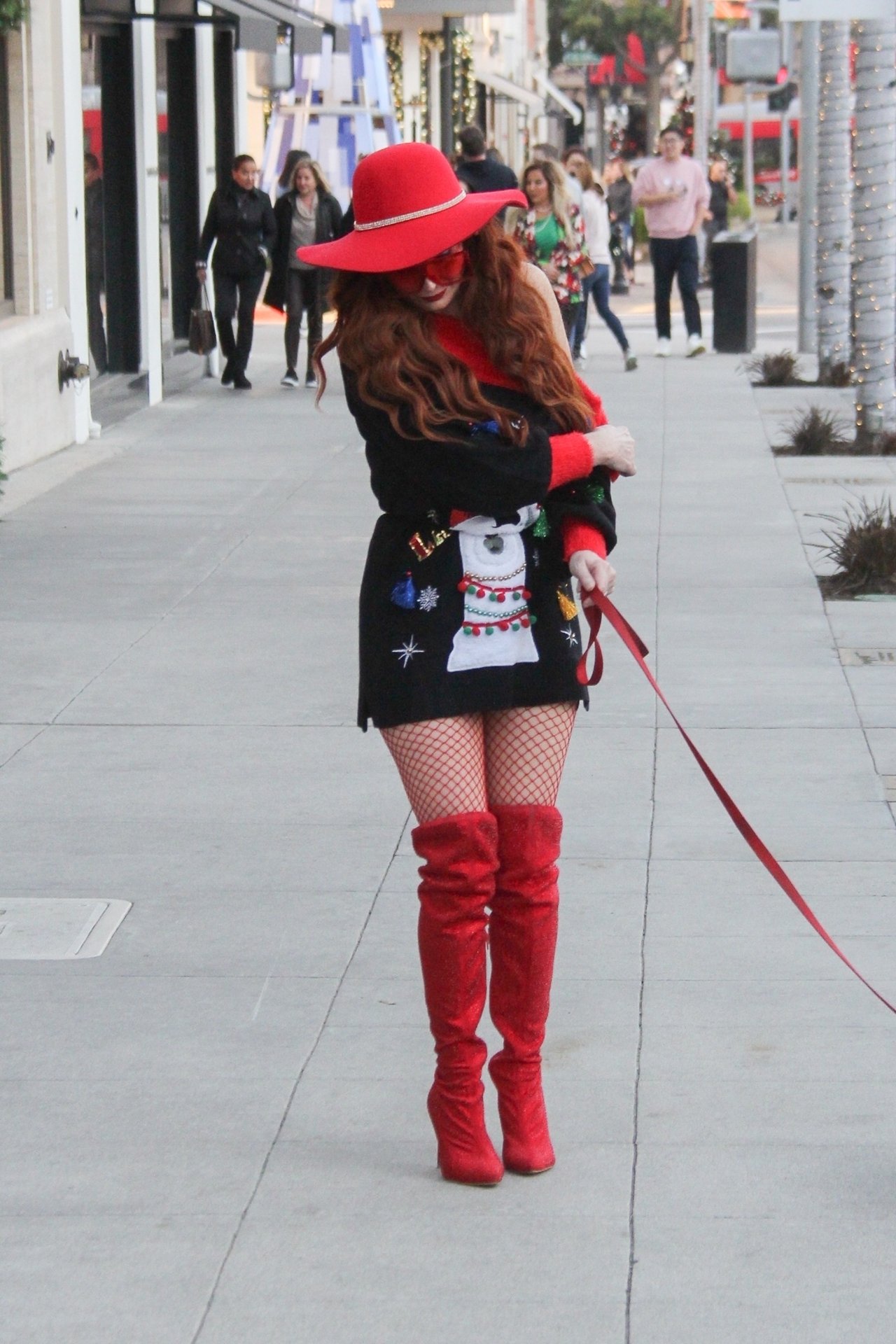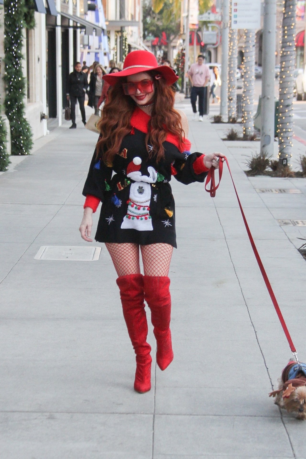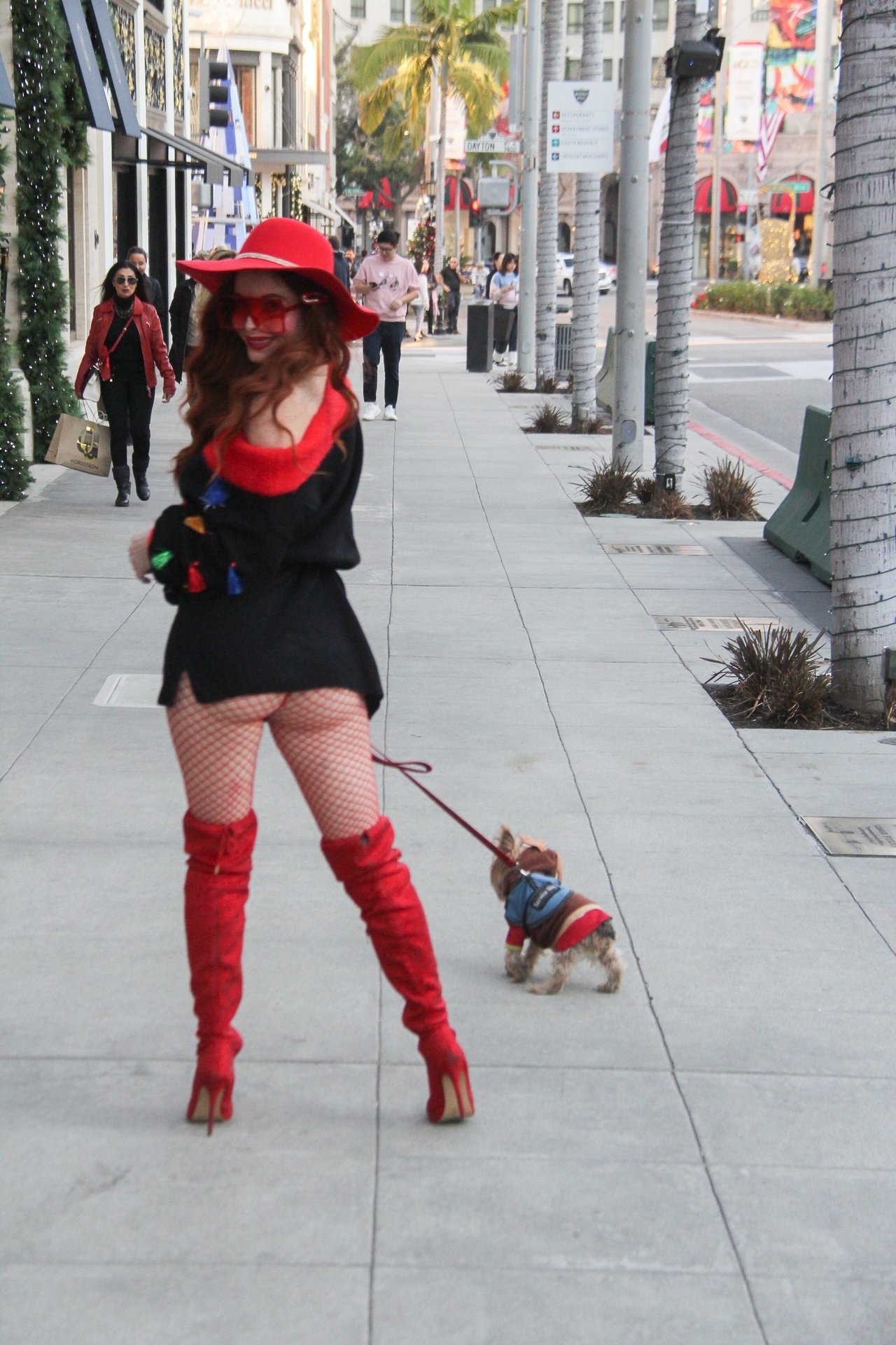 Phoebe Price shows off her ugly Christmas sweater while holiday shopping with her dog in Beverly Hills.