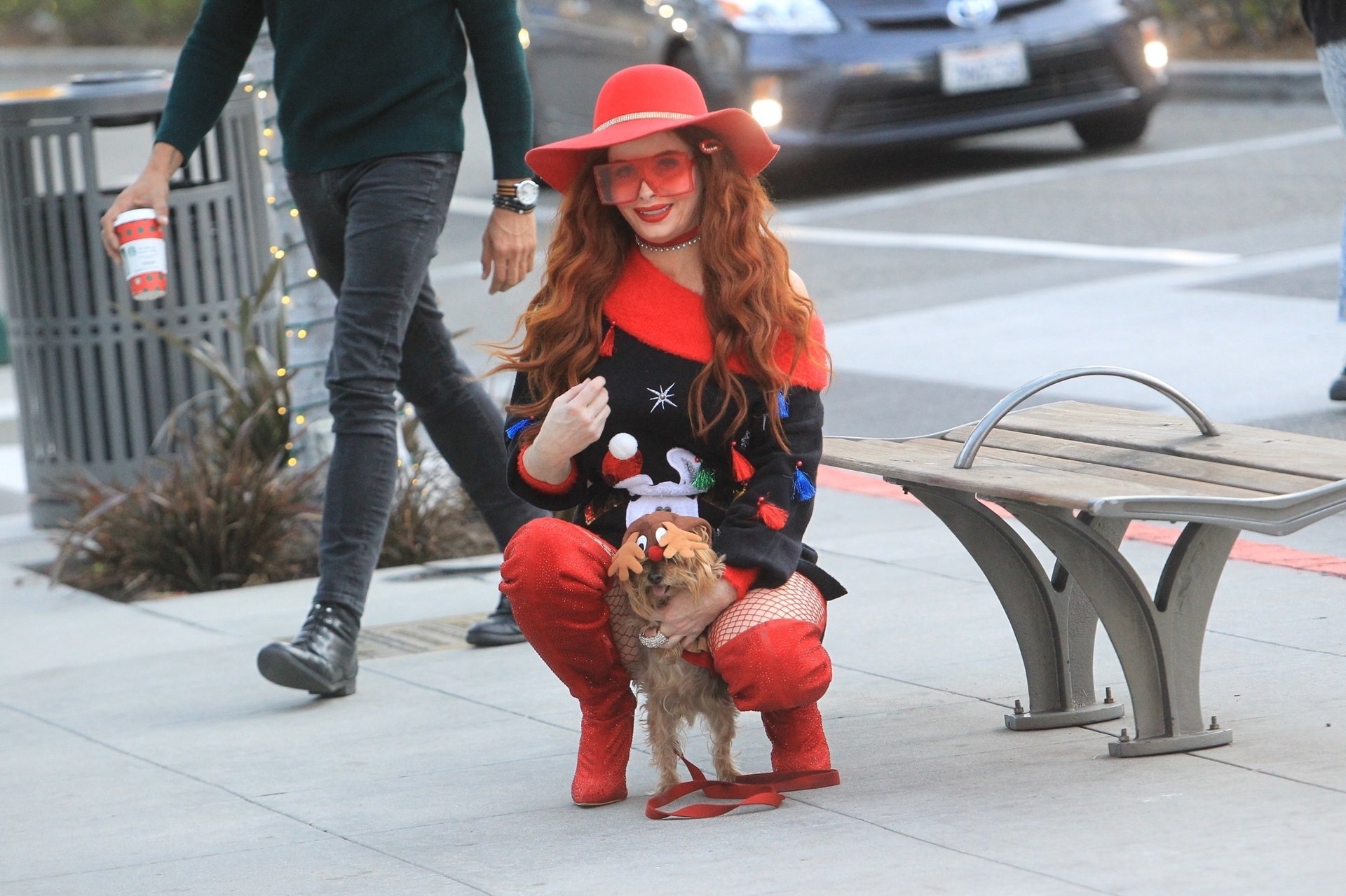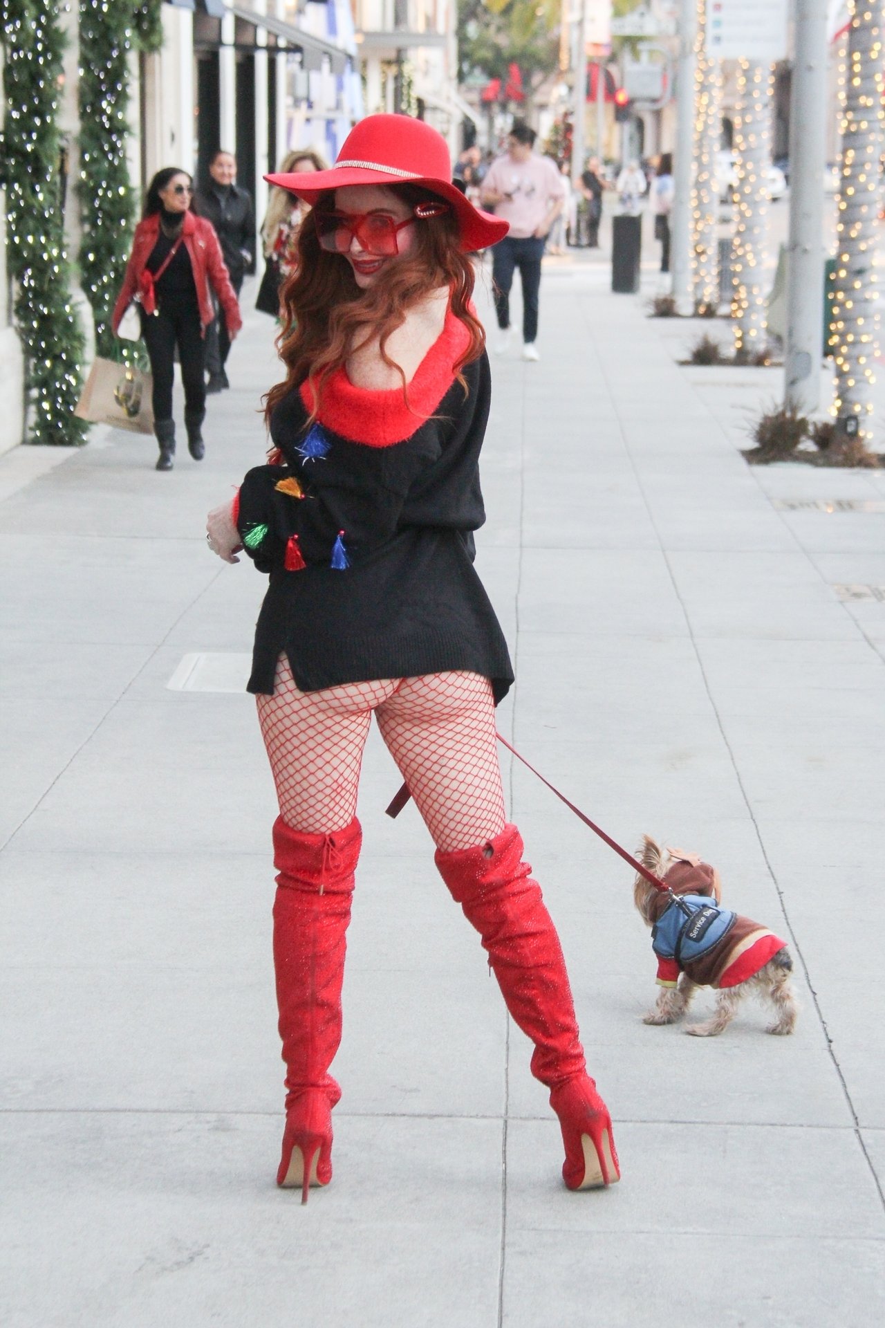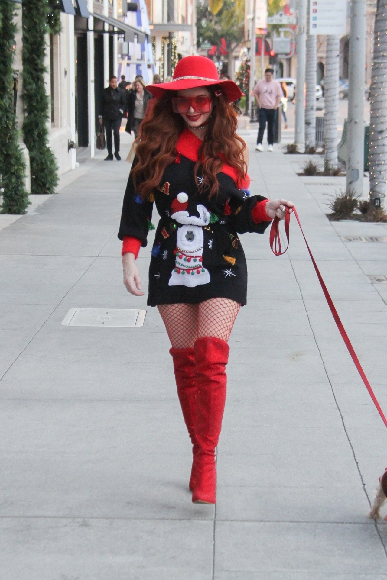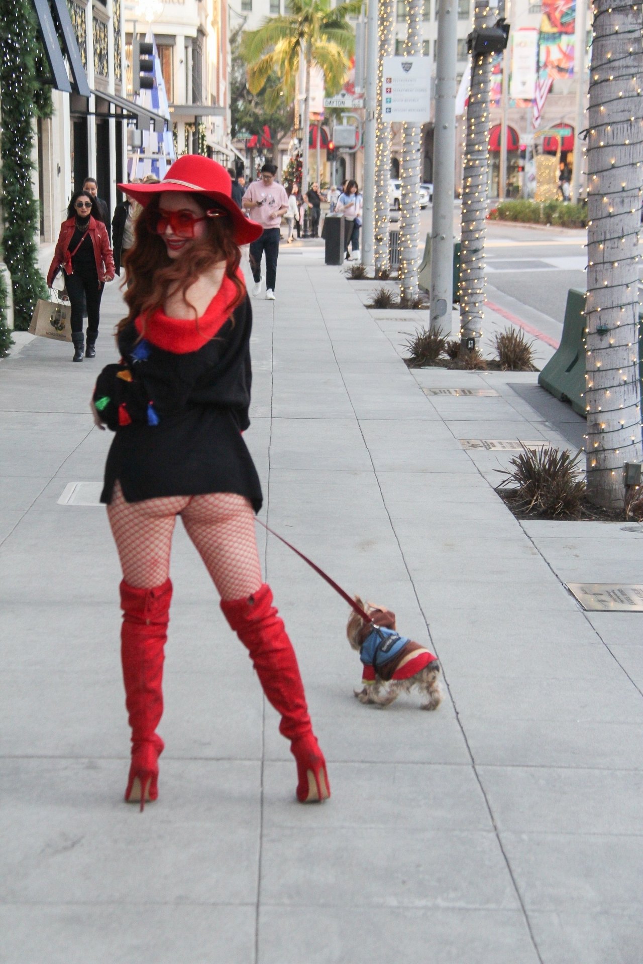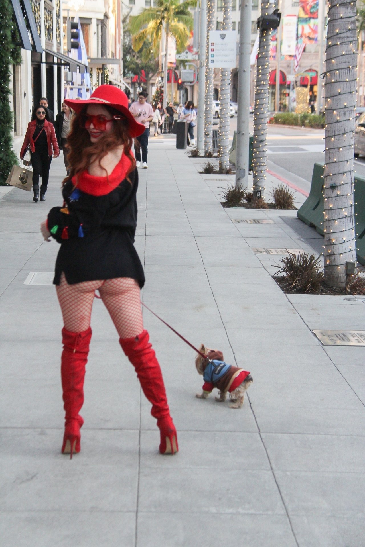 Phoebe Price shows off her ugly Christmas sweater while holiday shopping with her dog in Beverly Hills.