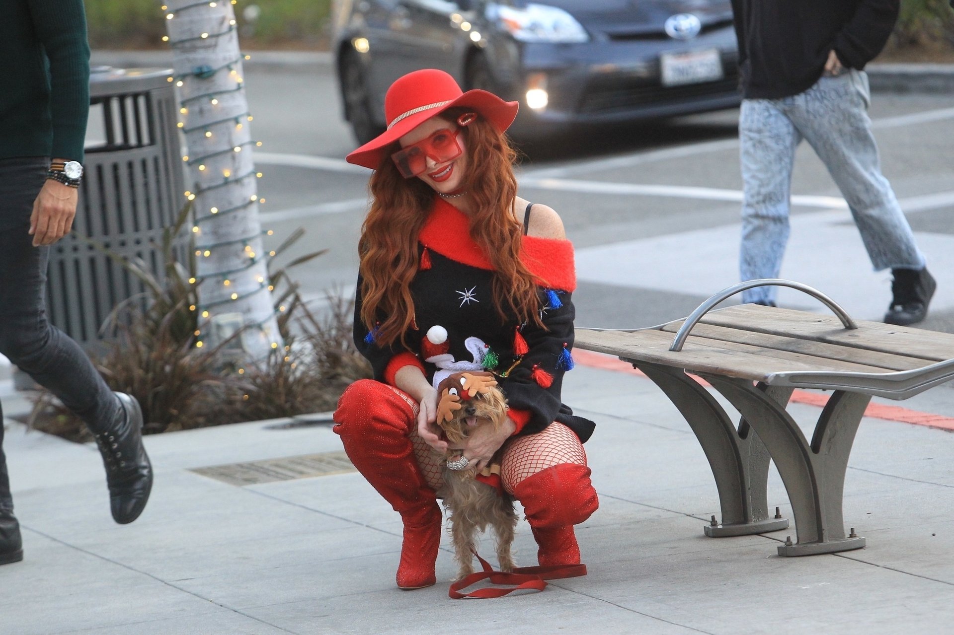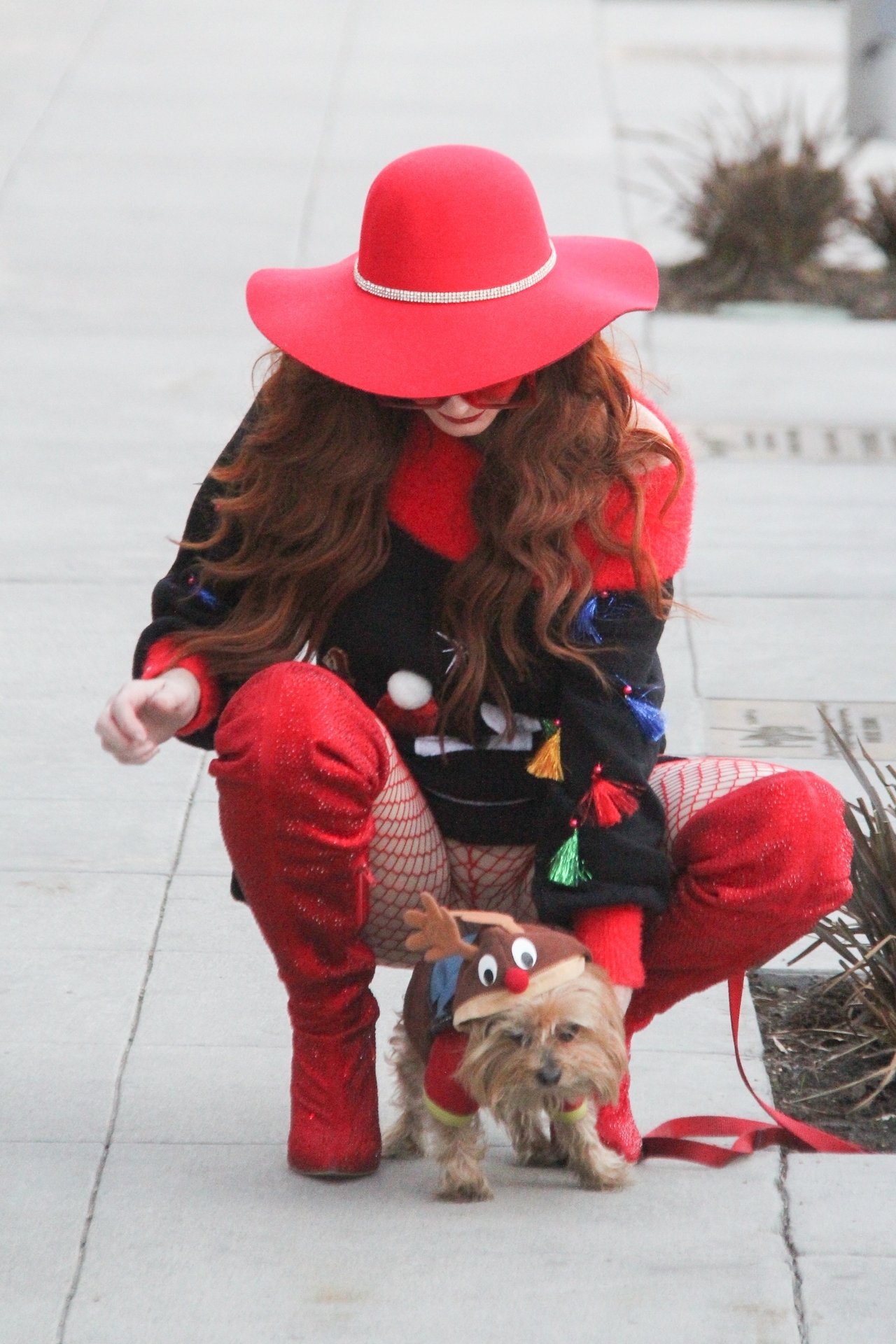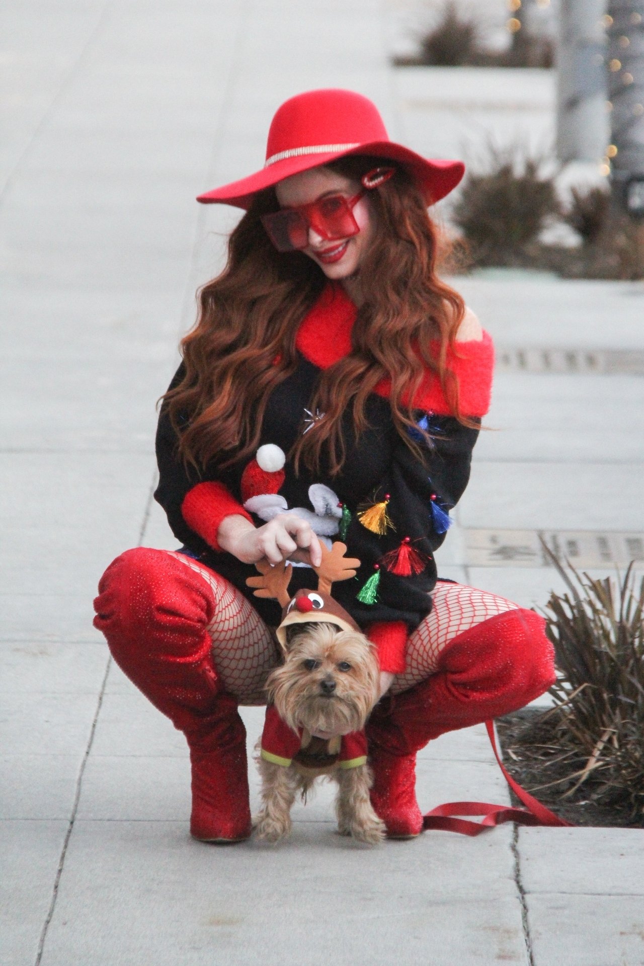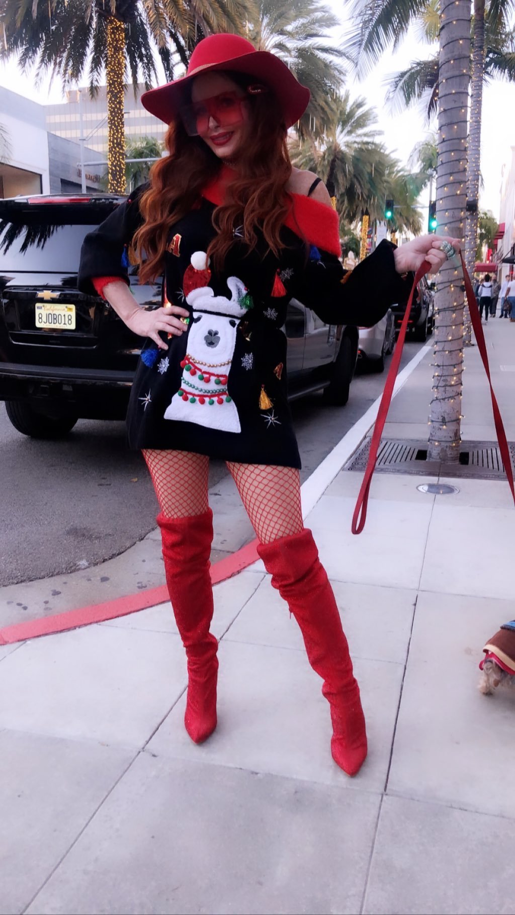 Phoebe Price shows off her ugly Christmas sweater while holiday shopping with her dog in Beverly Hills.
