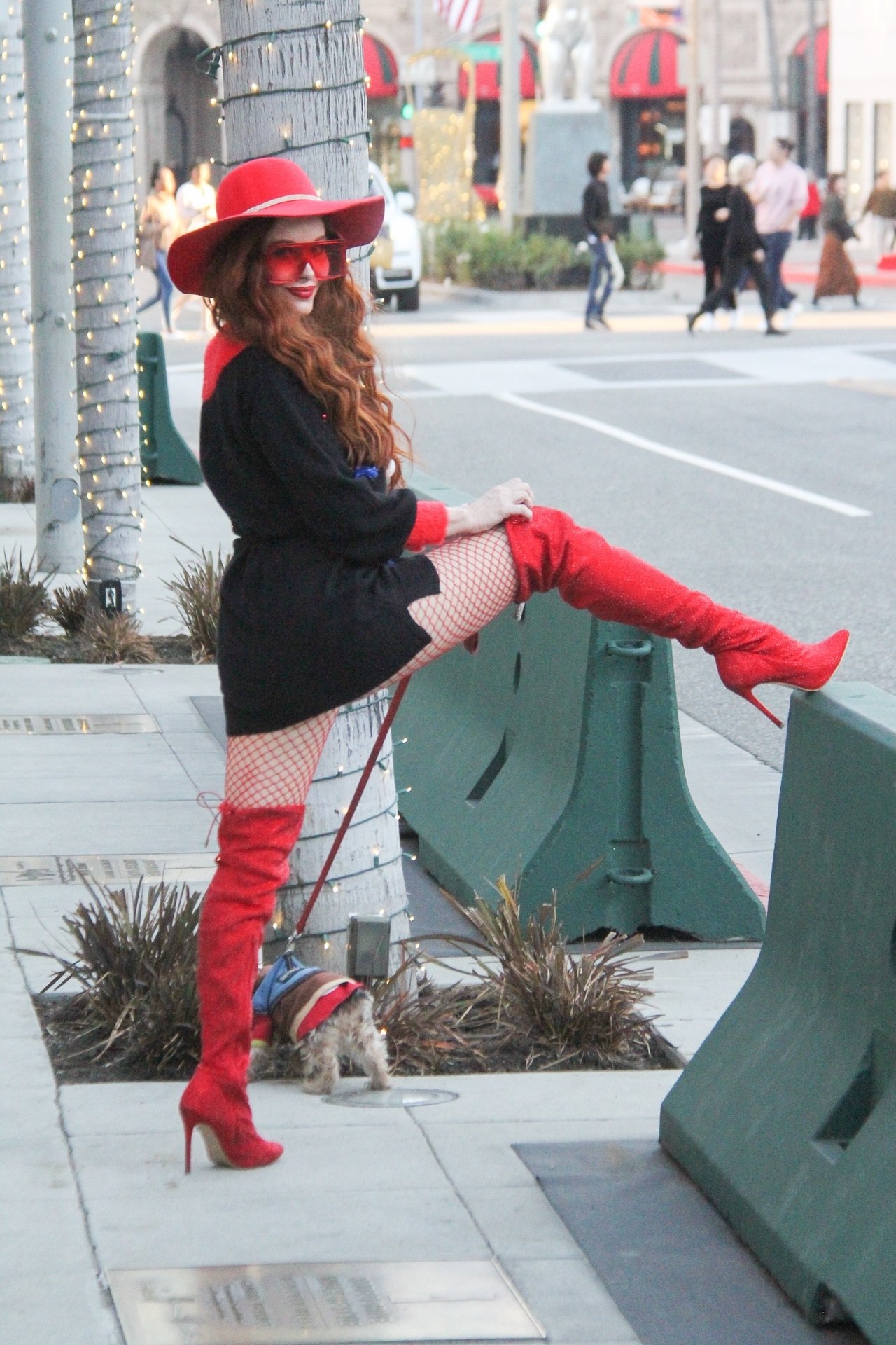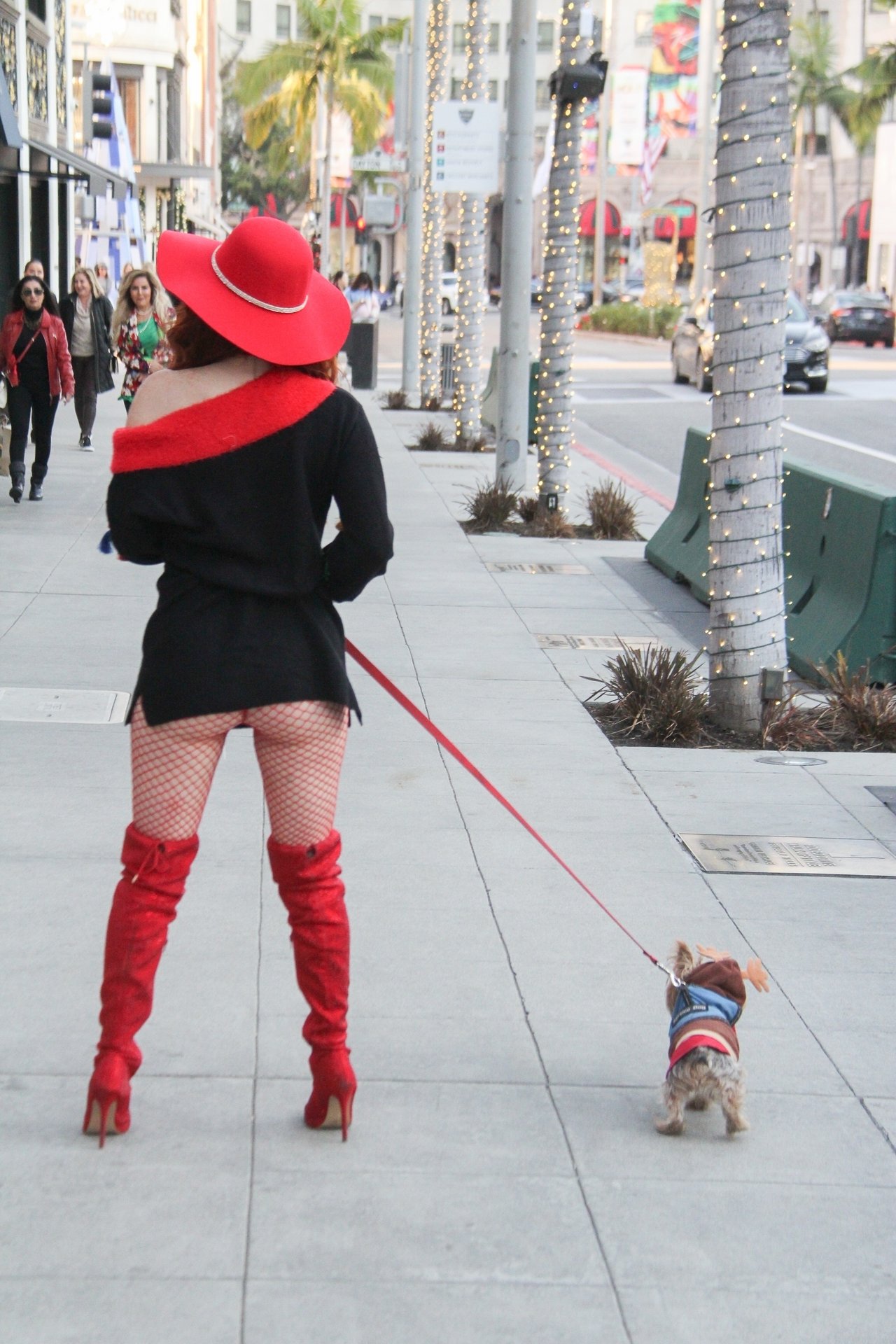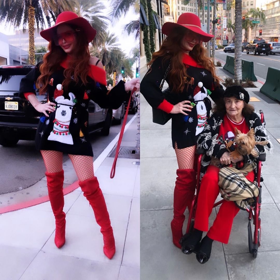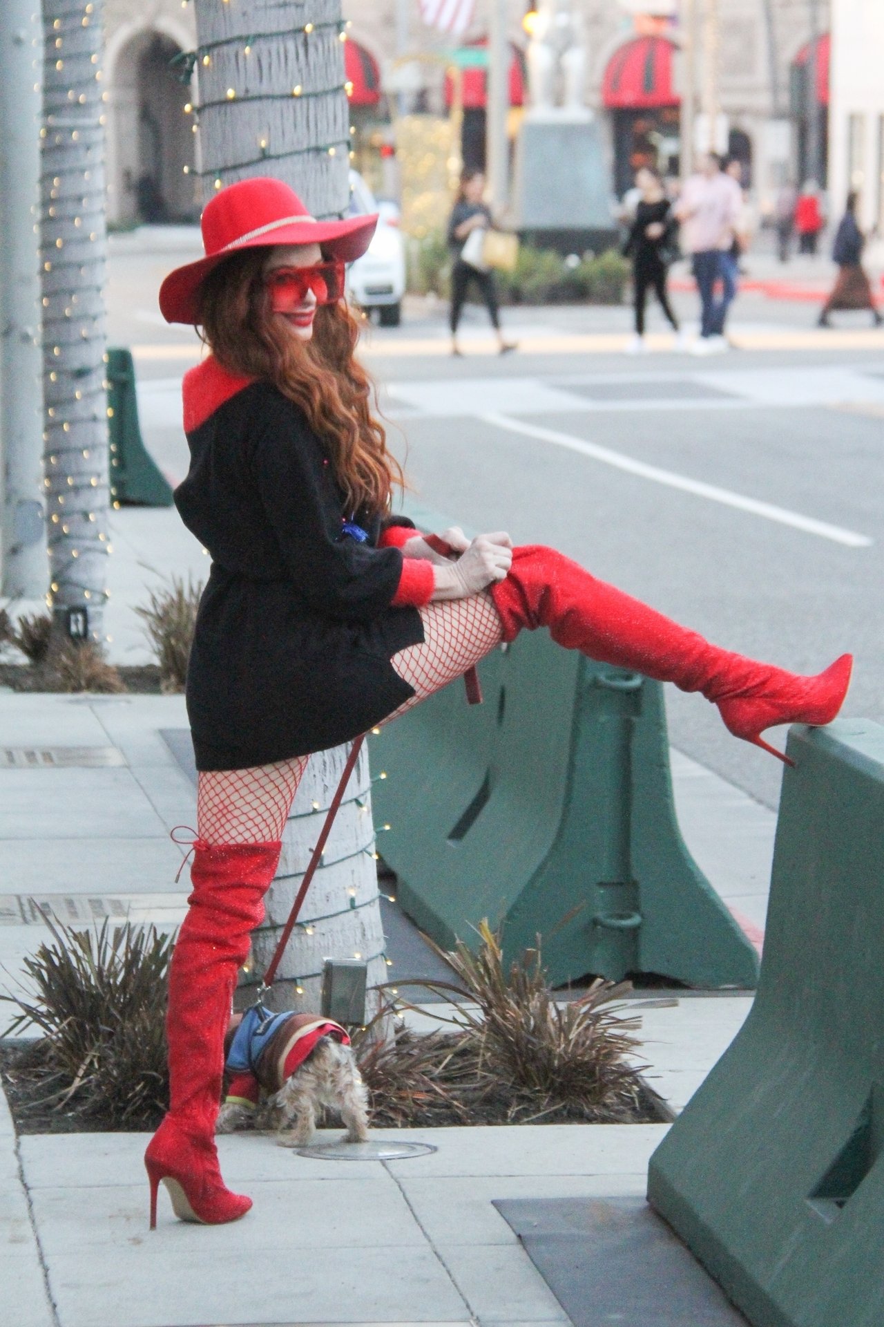 Phoebe Price shows off her ugly Christmas sweater while holiday shopping with her dog in Beverly Hills.