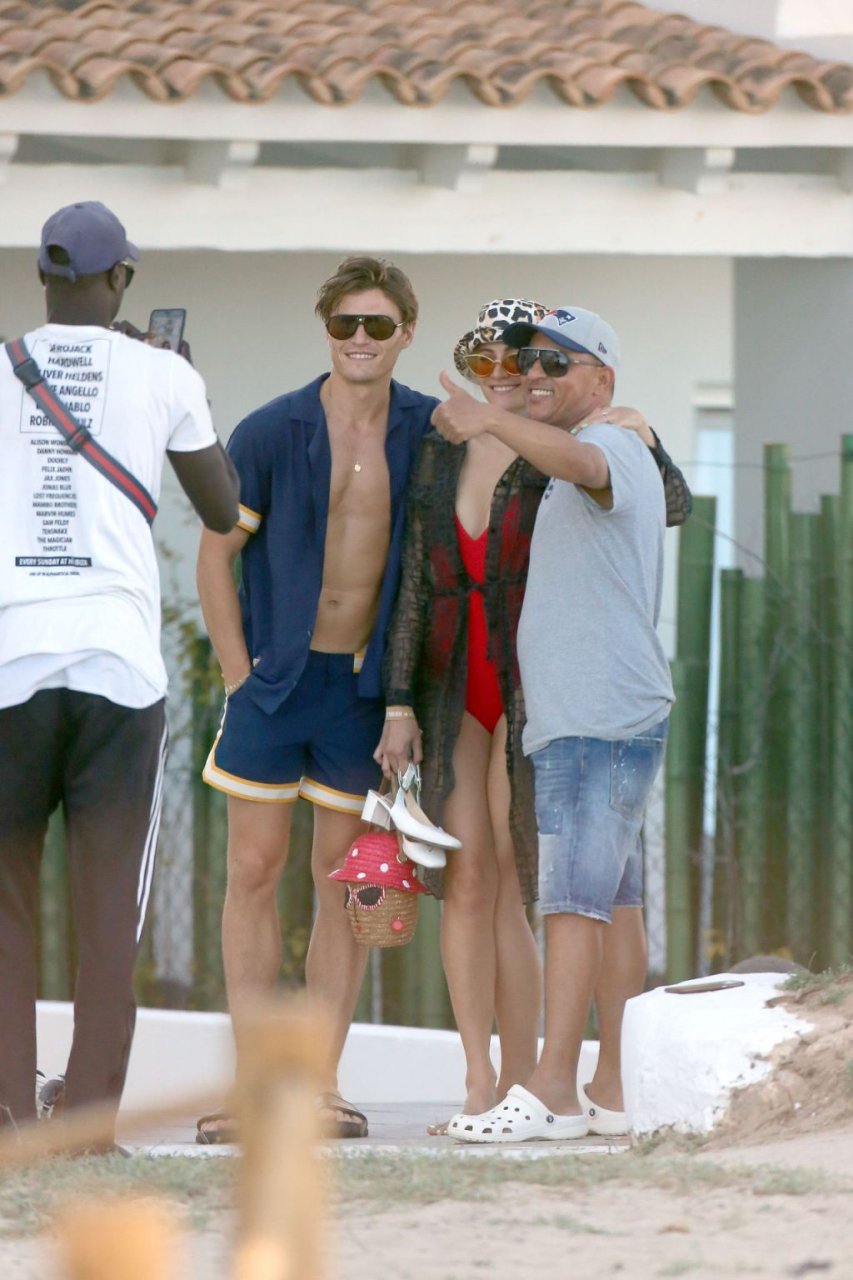 Пикси Лотт и ее парень Оливер Чешир были замечены на пляже в Ибице, 01.06.2019. Пикси была сфотографирована в красном купальнике с черным сетчатым халатом.