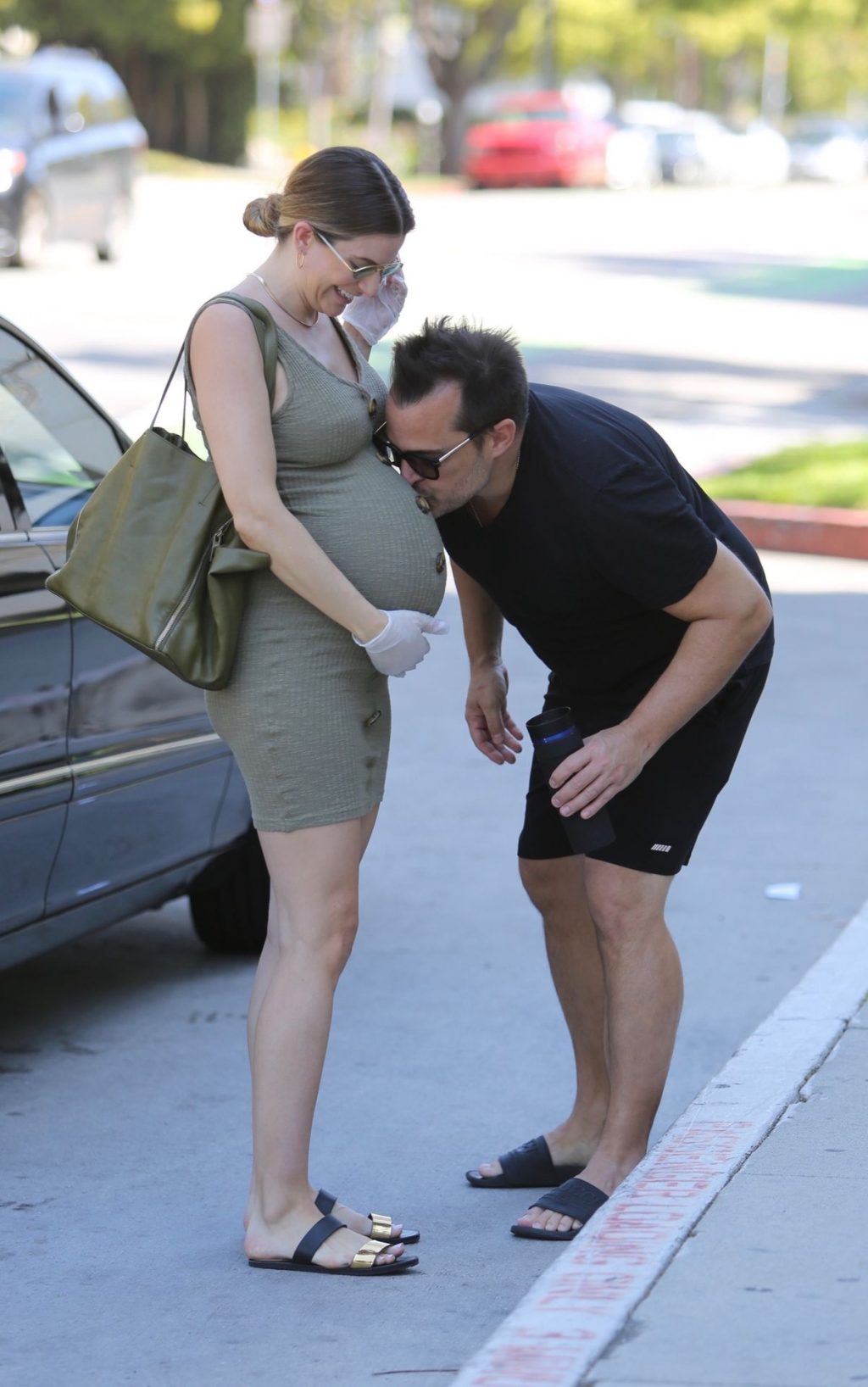 С приближением срока родов, сильно беременная на восьмом месяце Рэйчел МакКорд нарушает изоляцию, чтобы посетить врача в Лос-Анджелесе вместе с мужем Риком Ширмером, 29.04.2020.