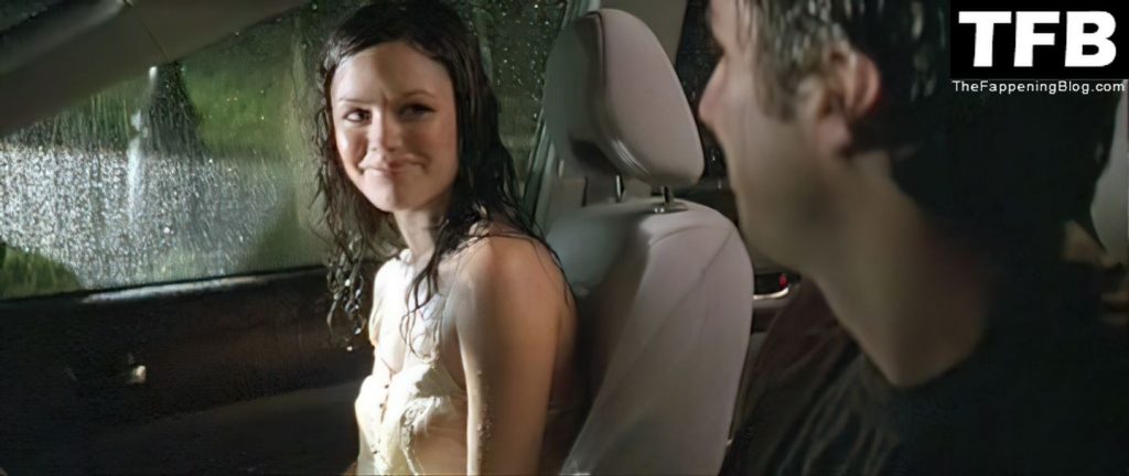 Рэйчел Билсон, известная по сериалу “О.С.”, выходит из дождя и садится в машину, надев слегка прозрачный мокрый белый топ, в то время как парень смущается, увидев её соски.