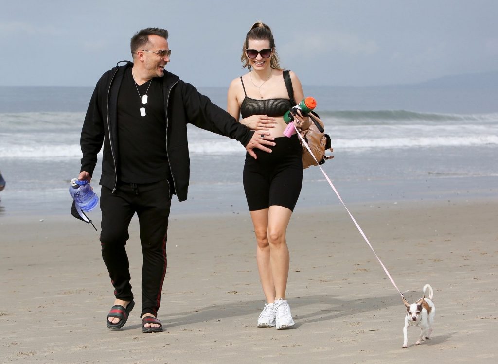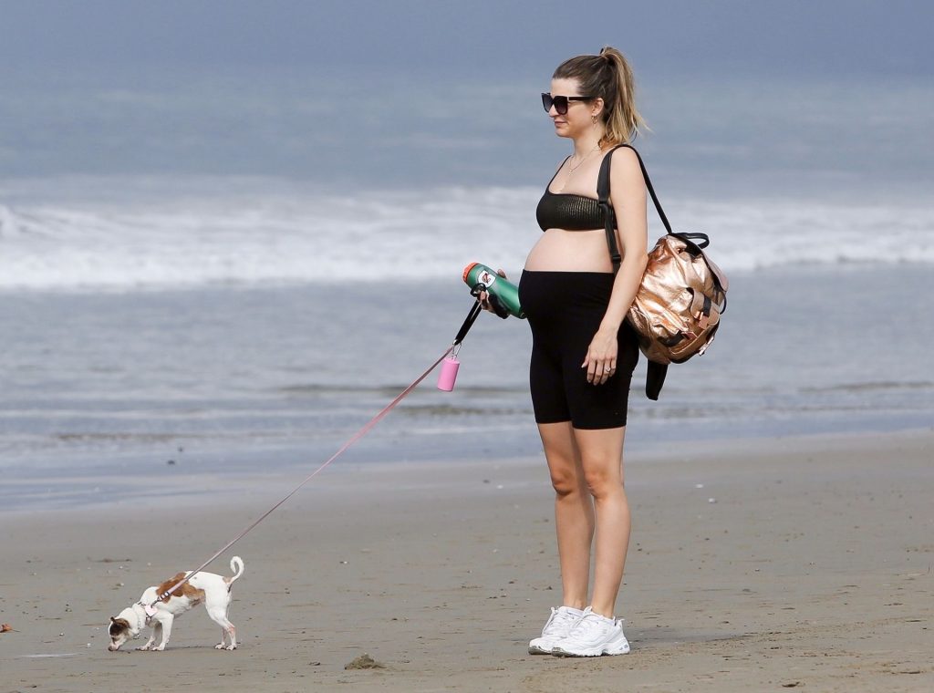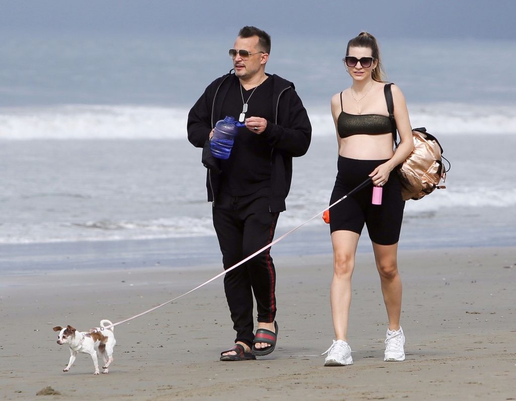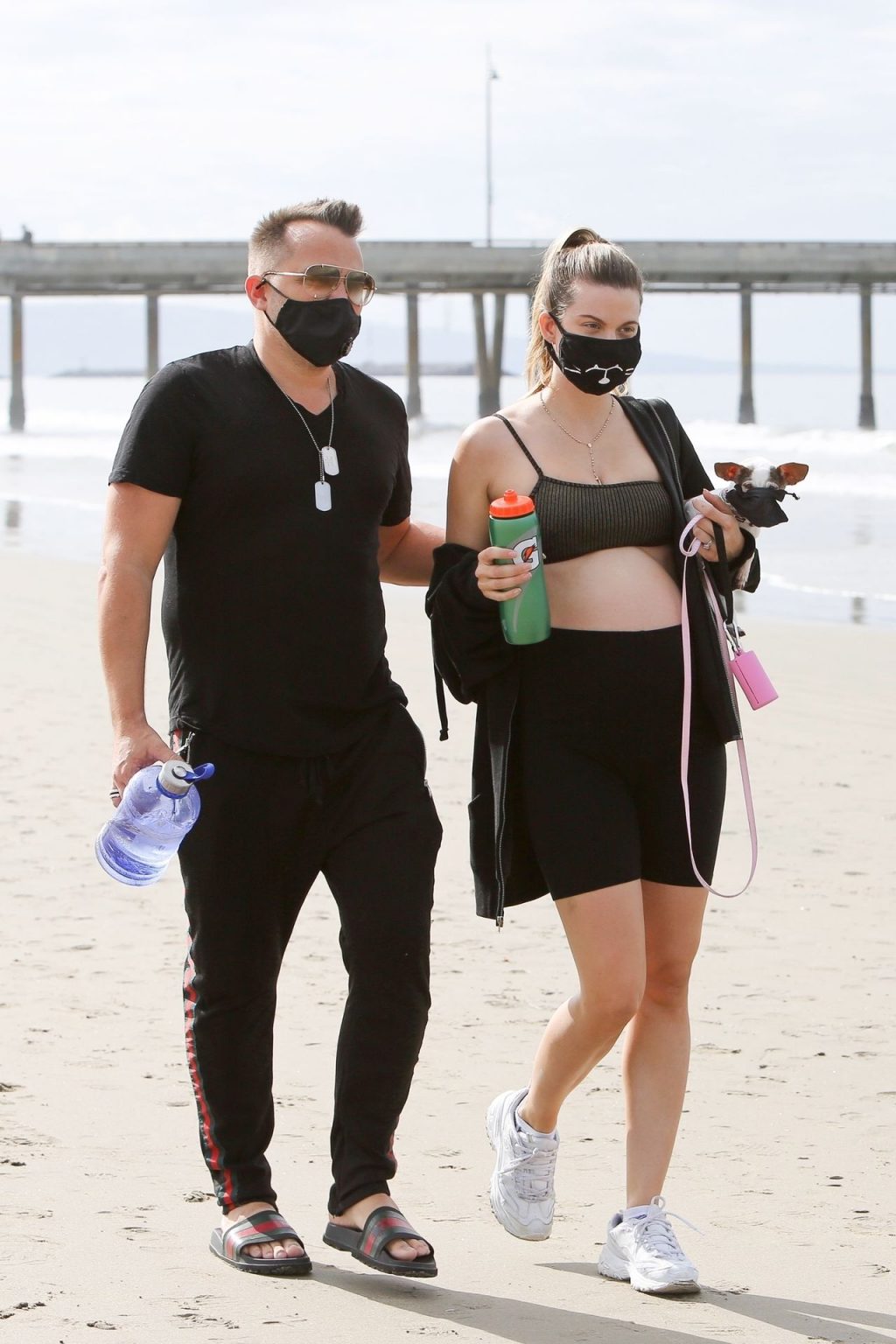 Рейчел МакКорд и её муж Рик Ширмер делают перерыв от изоляции и гуляют по пляжу в Лос-Анджелесе, 15.03.2020. Вскоре у них родится первый ребёнок, но поскольку в Лос-Анджелесе призывают соблюдать социальную дистанцию, пара решила выйти на улицу вместе со своей собакой. Они были одеты в одинаковые чёрные наряды: Рейчел в спортивных шортах, спортивном бюстгальтере и толстовке, а их образы дополнили защитными масками.