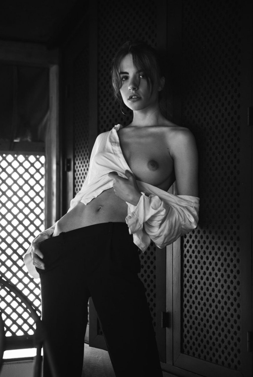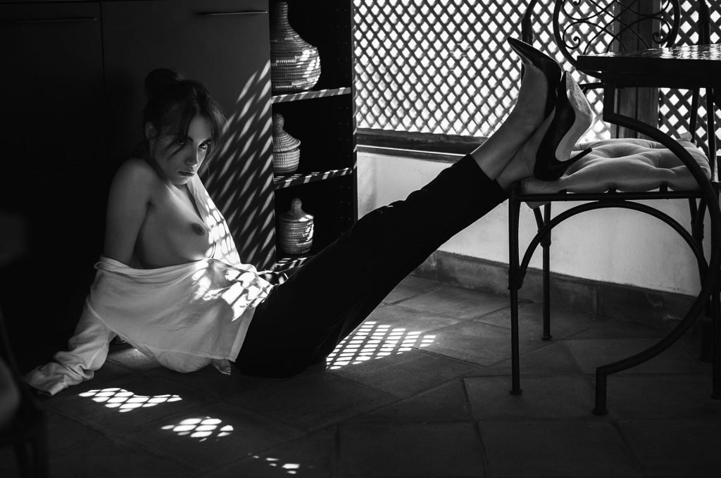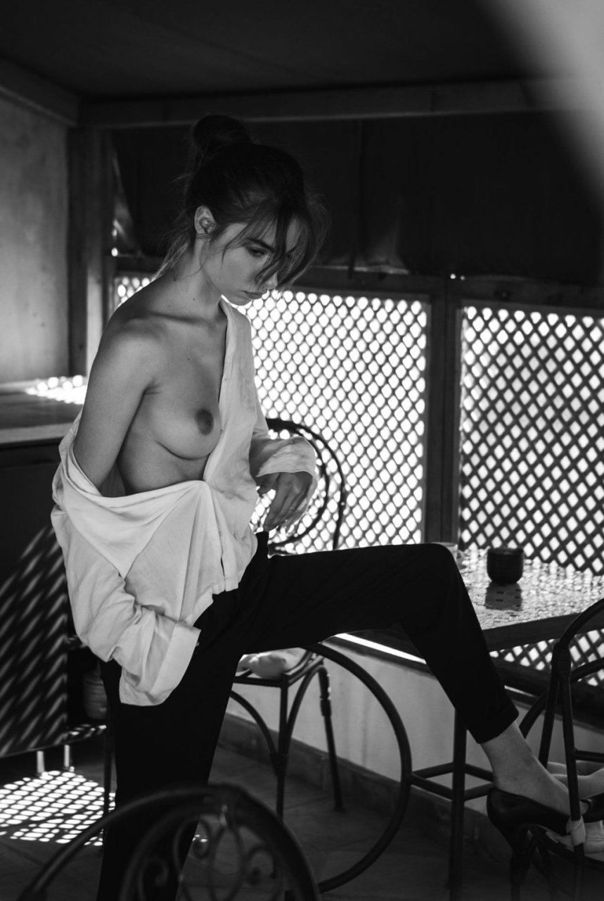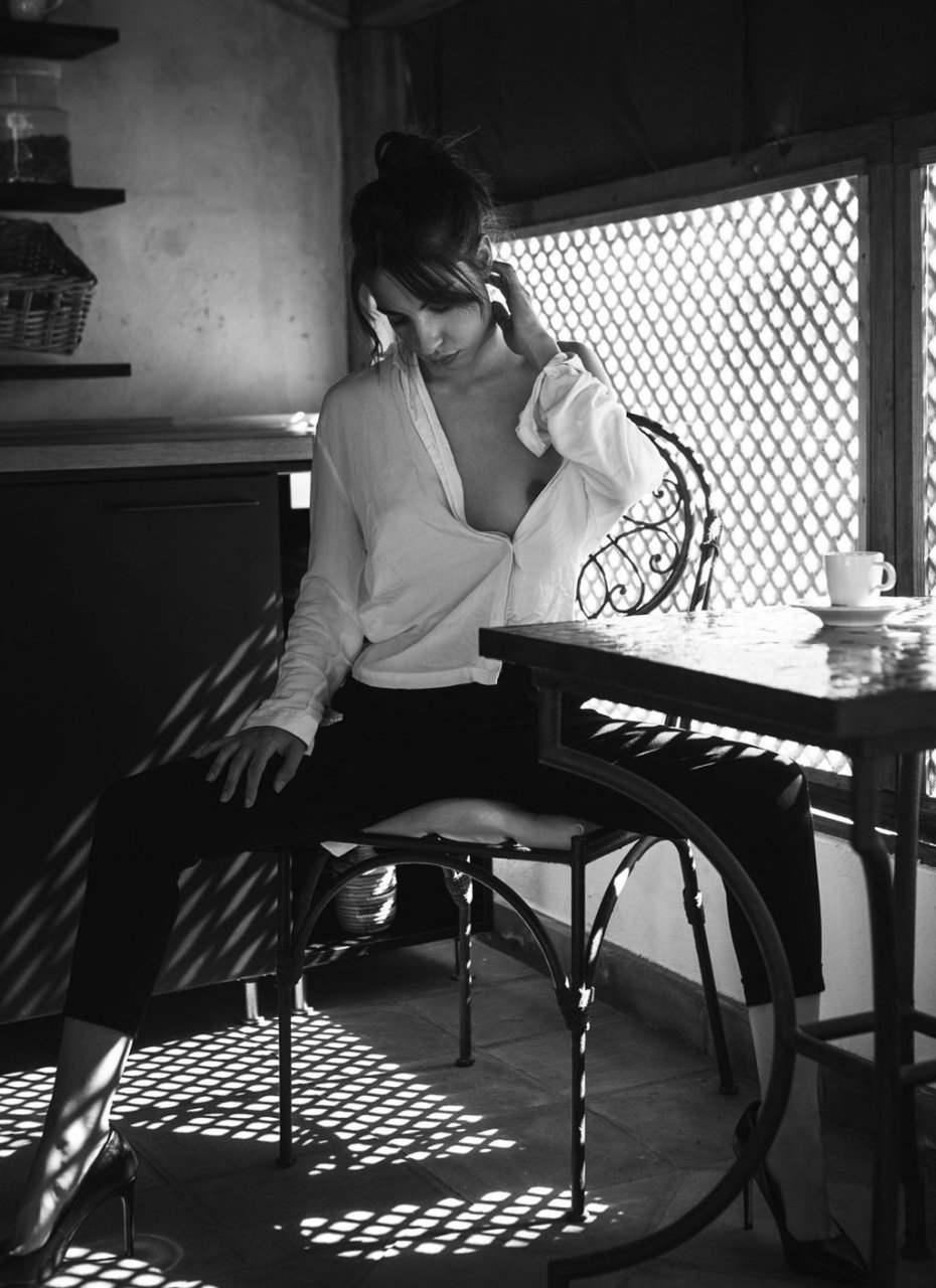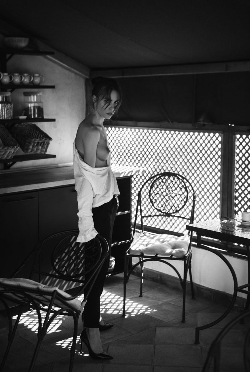 Модель Ребекка Баньоль привезла обнажённые черно-белые воспоминания из Испании с фотосессии Ханнеса Валенди (2019). Эта восхитительная женщина показала грудь в местном кафе.