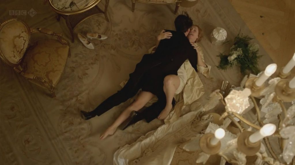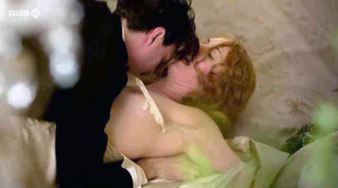 Ребекка Холл входит в комнату и снимает халат, обнажая грудь, пока служанка помогает ей сесть в ванну. Мы видим ее левую грудь, когда она лежит в ванне, и в комнату входит мужчина. Повернувшись спиной, он видит, как Ребекка встает топлесс, и мы снова видим обе ее груди.