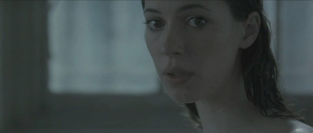Bella Heathcote is nude underneath a see-through white dress. Showing her nipples through before she and Rebecca Hall roll around on the floor together and lesbian kiss. Bella then opens Rebecca’s coat and bares her breasts, kissing Rebecca on the chest. A guy then gets involved for a threesome, Bella having sex on top of him as Rebecca leans over to kiss Bella at the same time.