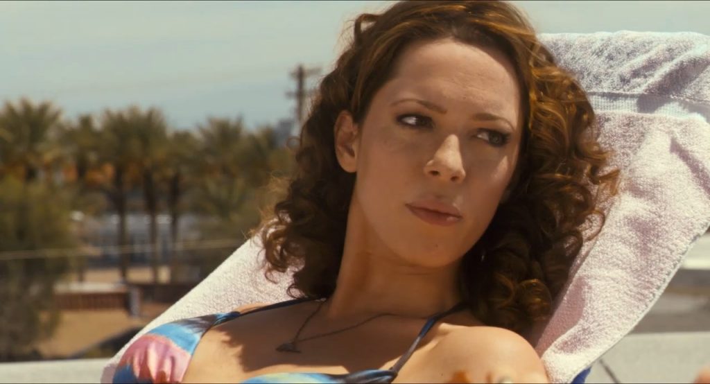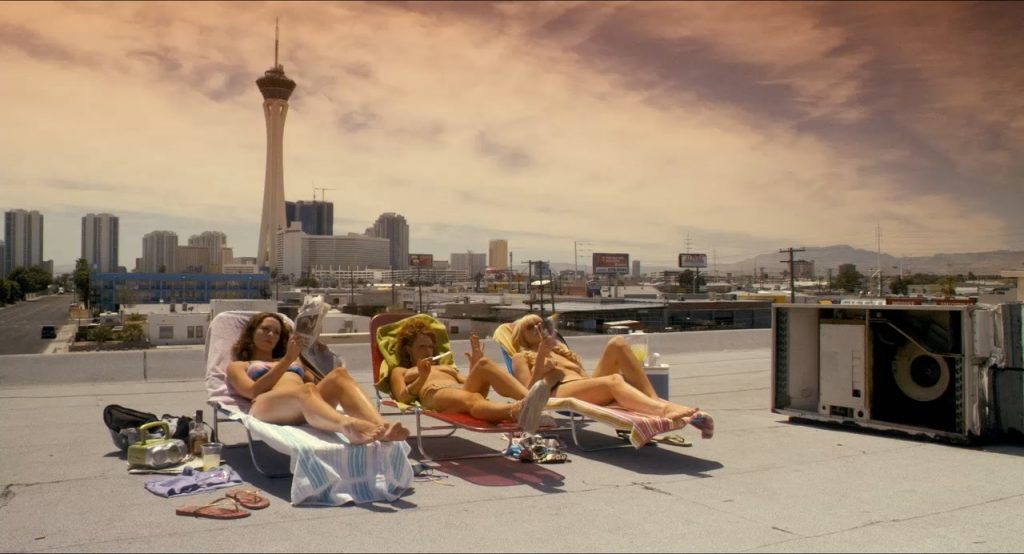 Laura Prepon is sunbathing topless on a rooftop beside Jo Newman, who also shows her breasts, and Rebecca Hall, who is wearing a bikini. Laura is on the right in a pair of sunglasses, Jo is in the middle, and Rebecca is on the left.
