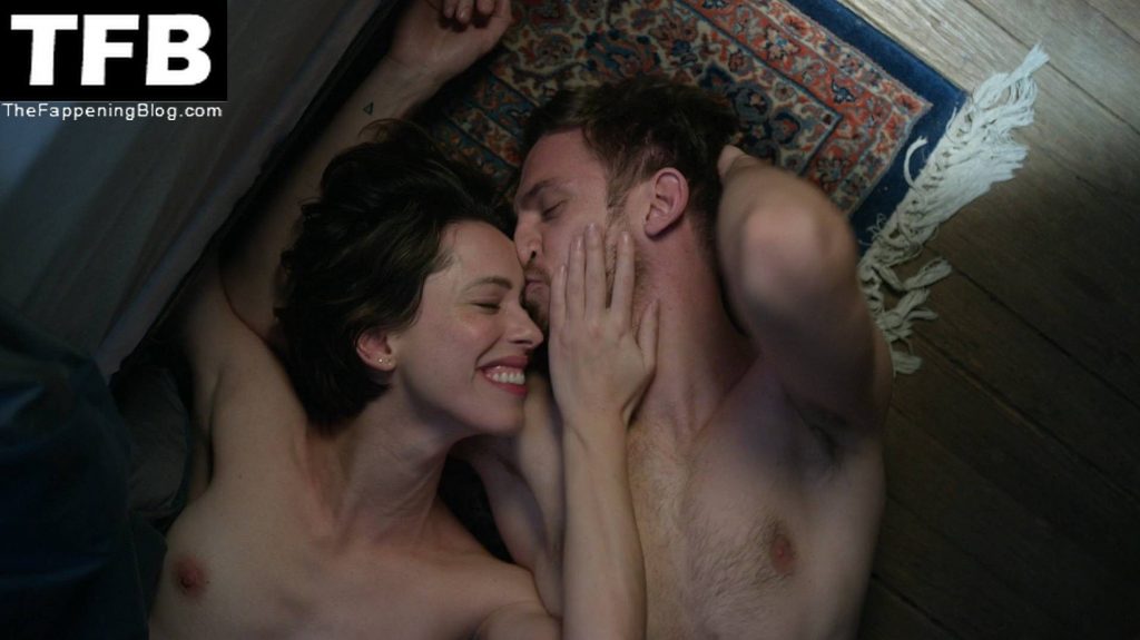 Rebecca Hall is lying topless on her back on the floor next to a bed, her right breast in view as a guy lies next to her and leans over to kiss her. From Permission.