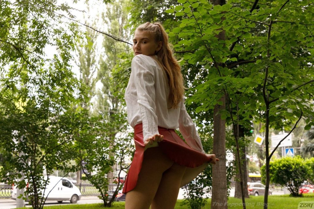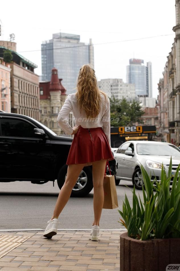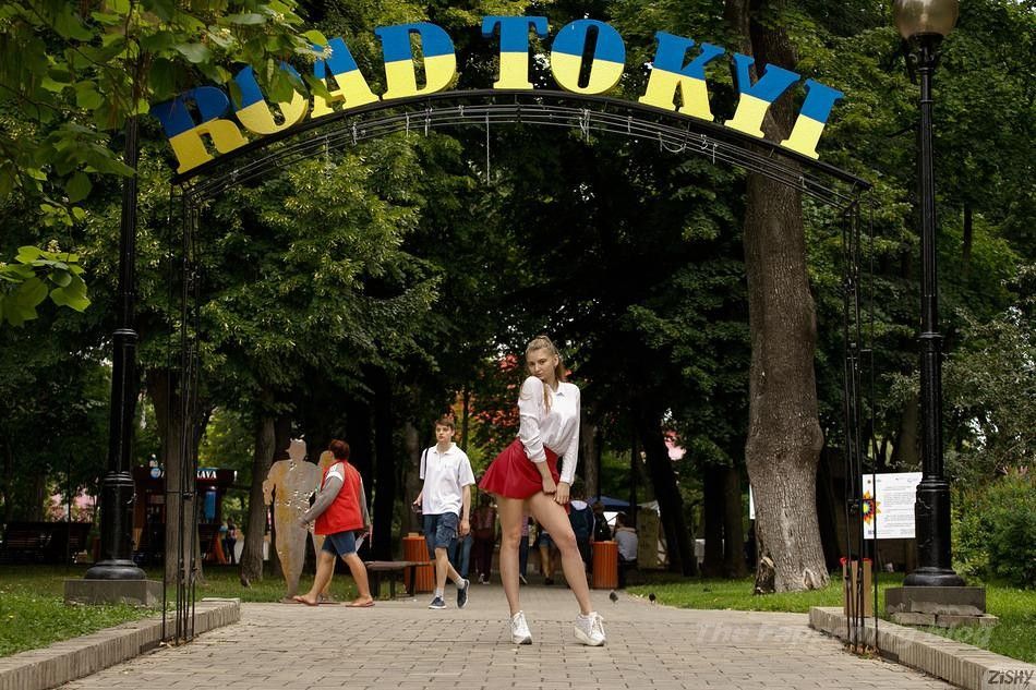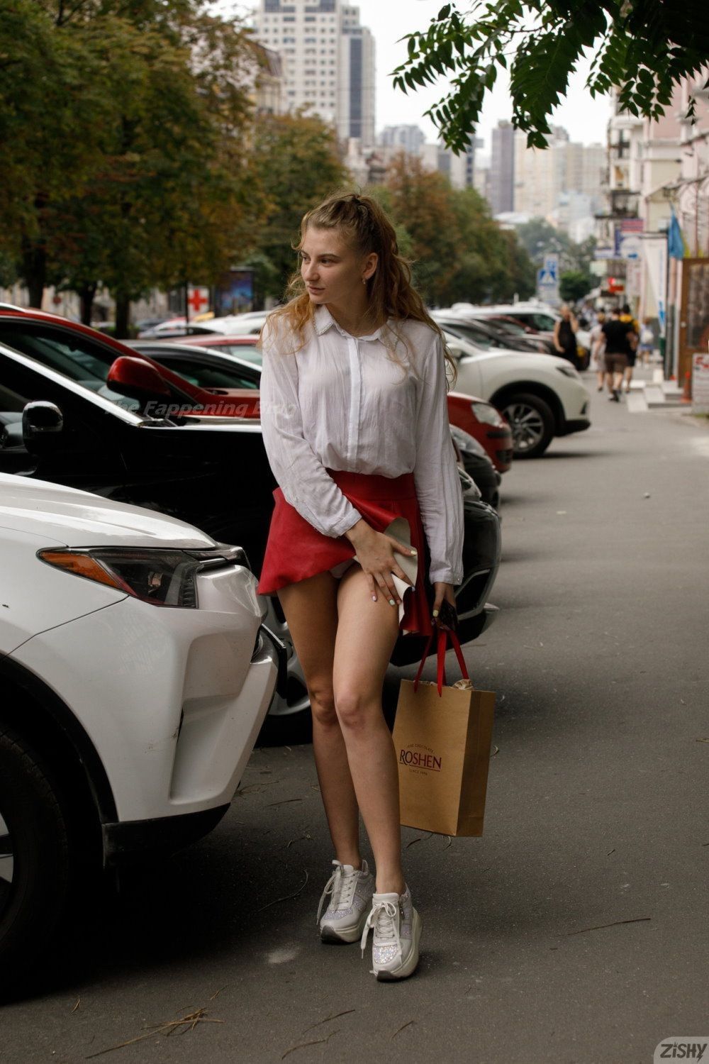 Пышногрудая модель Риган Будимир носит белую блузку и красную юбку, дразня фотографа Zishy в общественном парке в Киеве, Украина (2021), показывая декольте и трусики. Она идет по улице и принимает душ в отеле, демонстрируя нам свои большие натуральные груди!