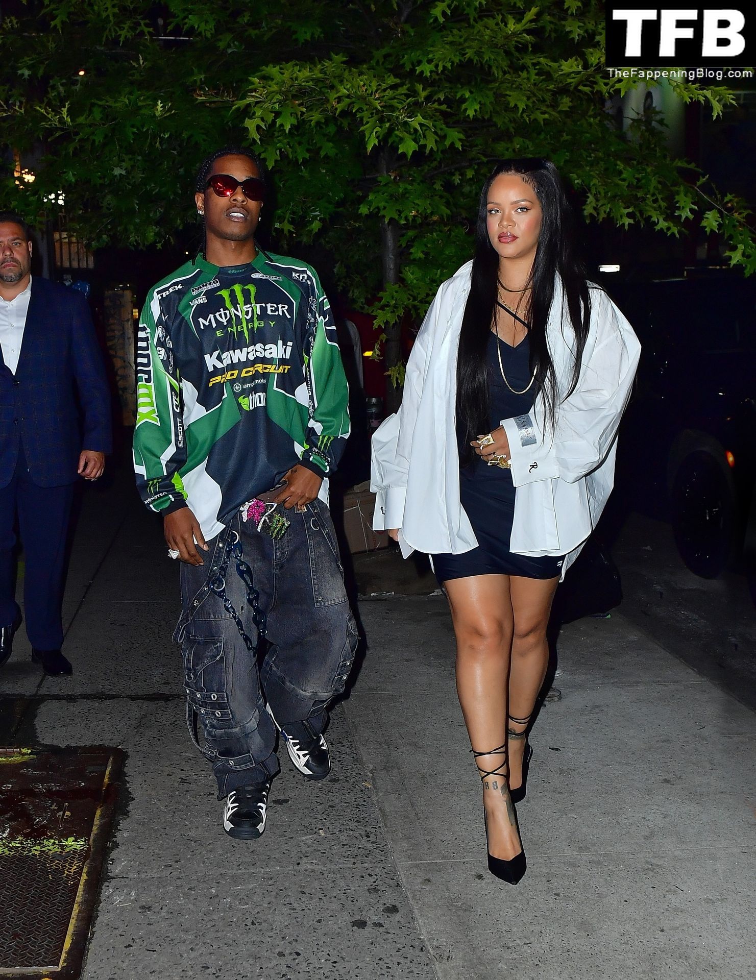 Рианна и ASAP Rocky вышли на ужин в Нью-Йорке, 08/11/2022. Рианна была в облегающем платье, демонстрирующем её ноги, с белой оверсайз курткой сверху.
