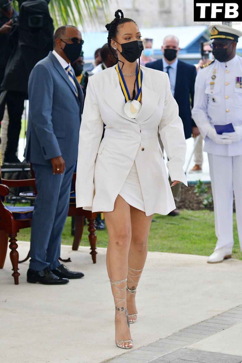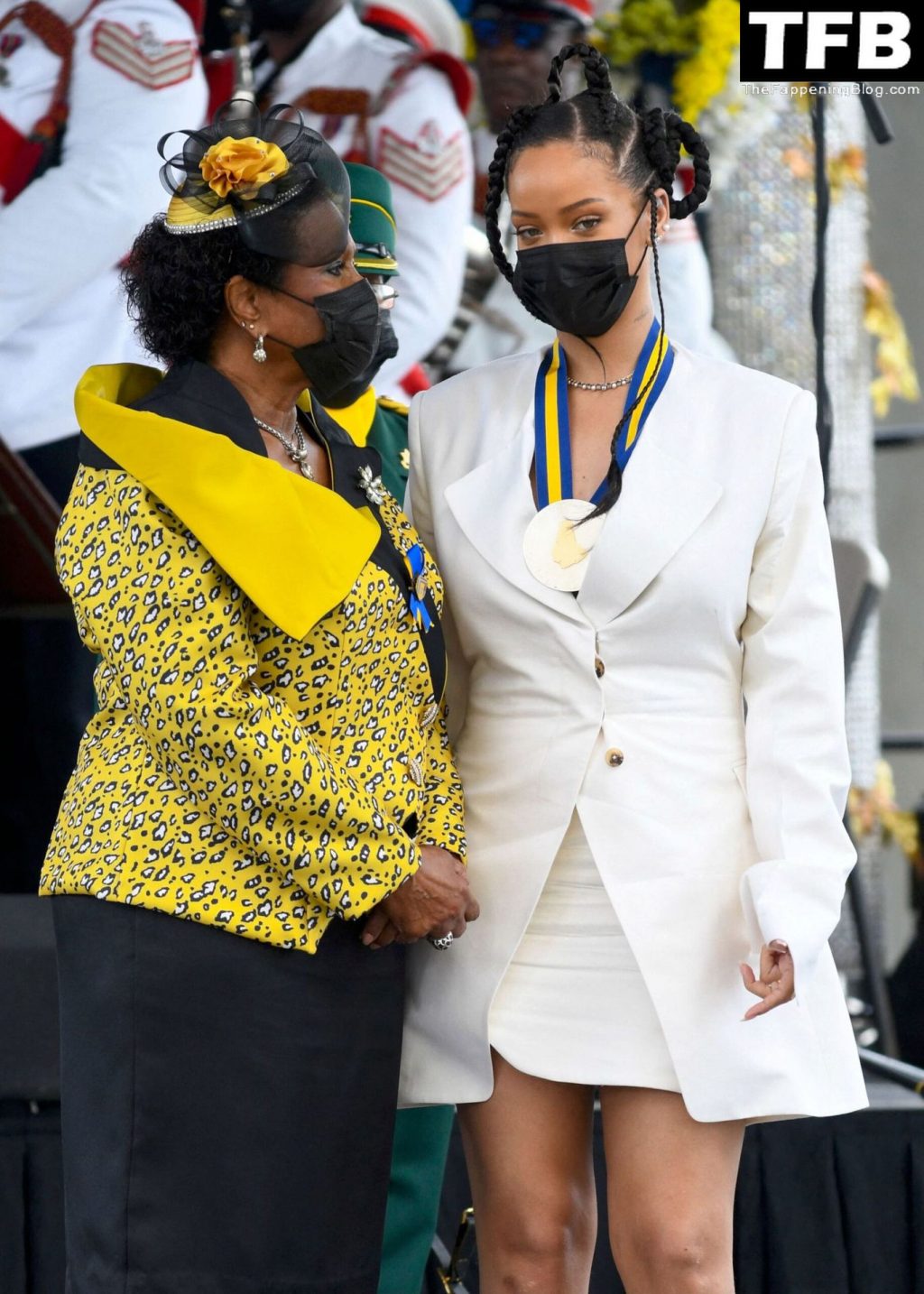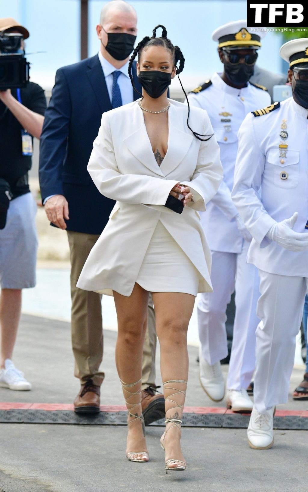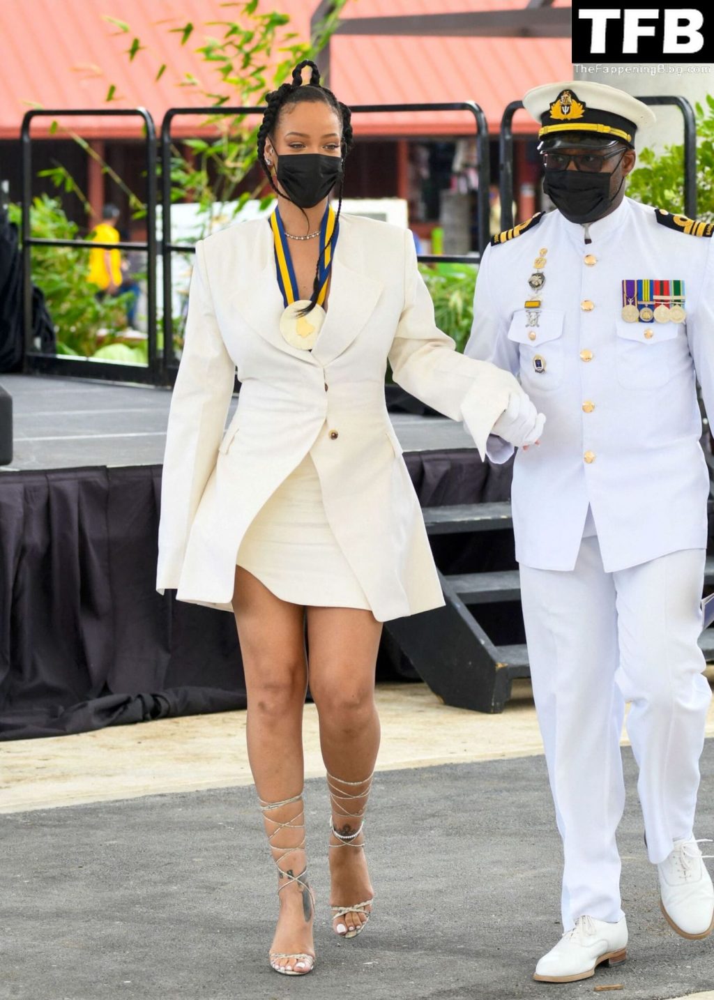 Звезда The Fappening Рианна выглядит потрясающе в глубокодекольтированном белом мини-платье и пиджаке, принимая знак Национального героя на празднованиях Республики Барбадос в Бриджтауне, 30.11.2021.