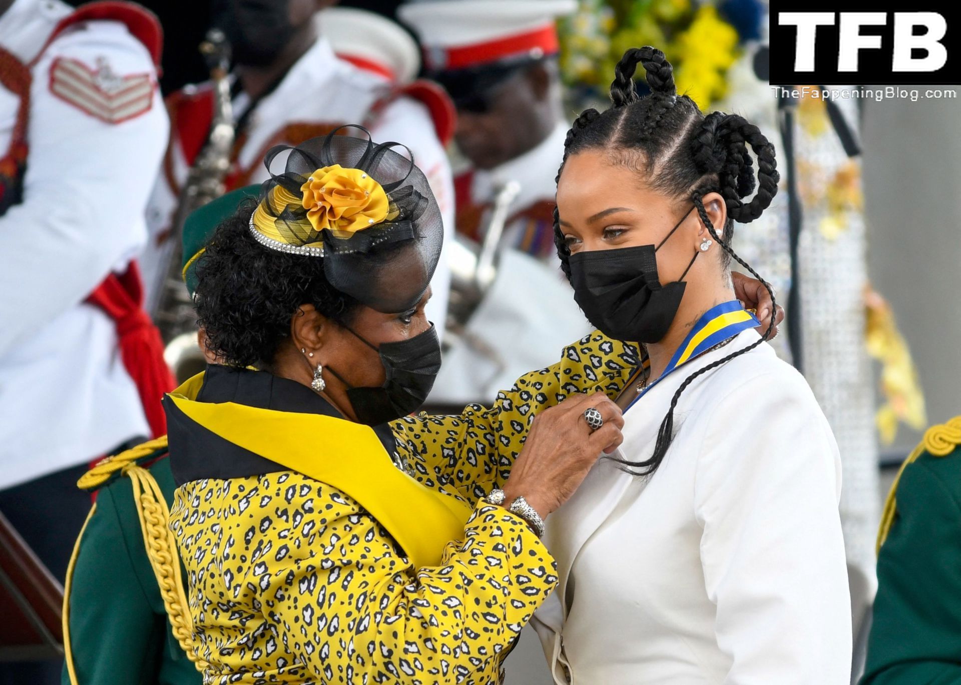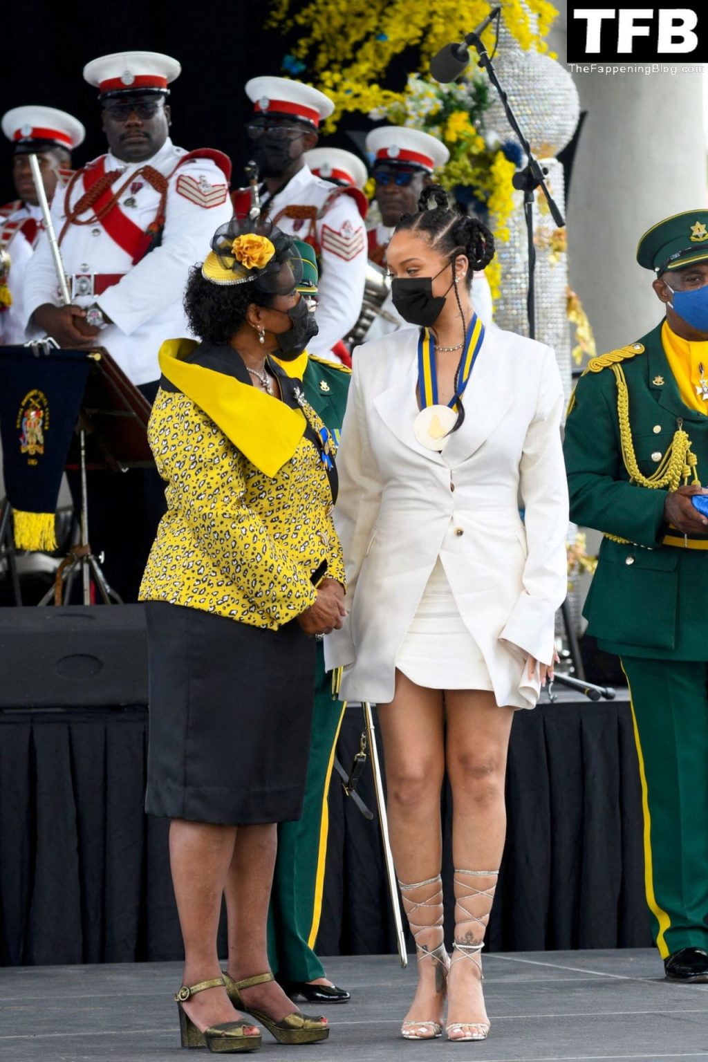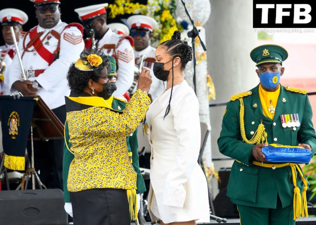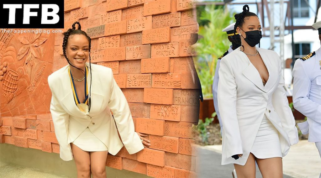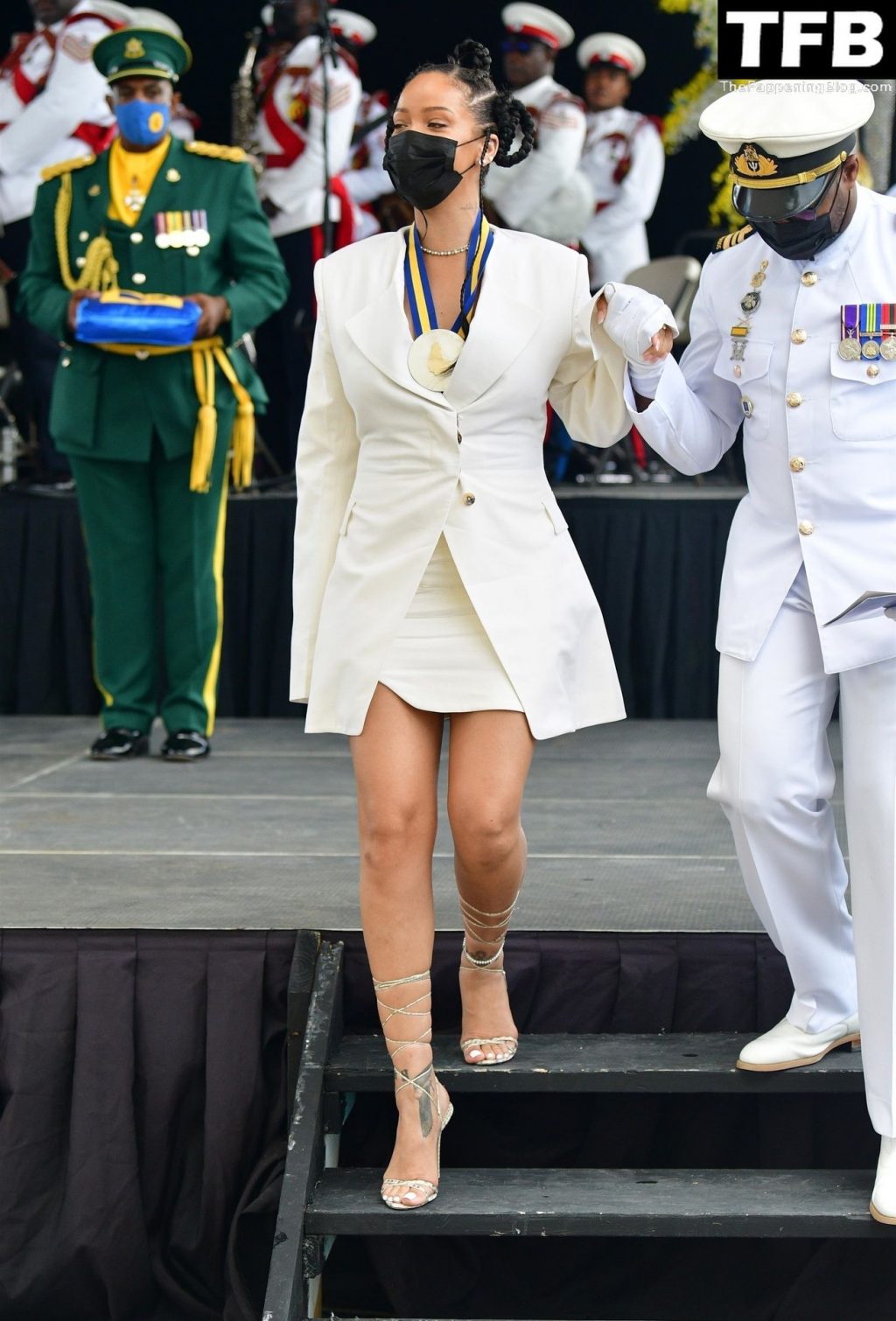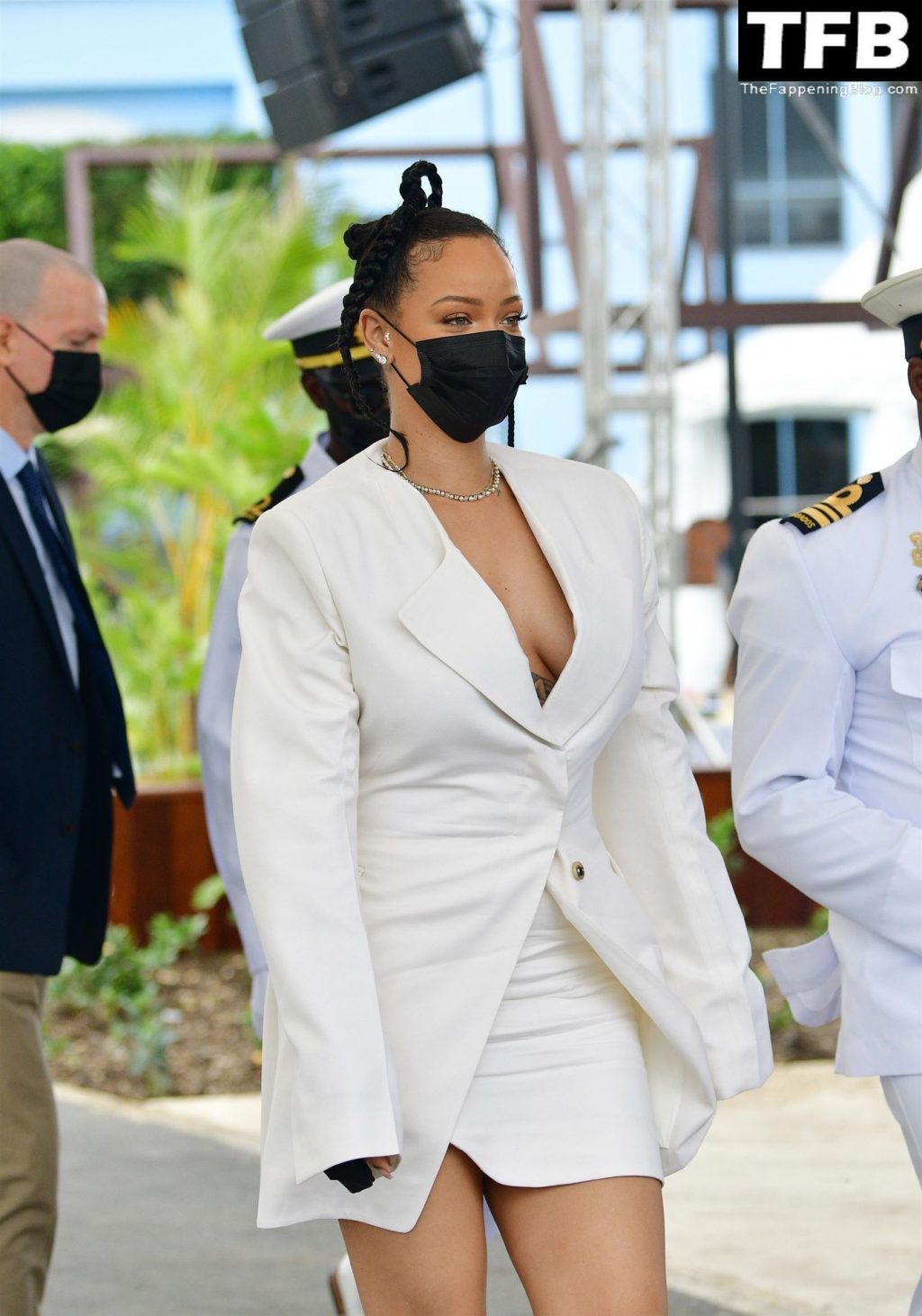 Звезда The Fappening Рианна выглядит потрясающе в глубокодекольтированном белом мини-платье и пиджаке, принимая знак Национального героя на празднованиях Республики Барбадос в Бриджтауне, 30.11.2021.