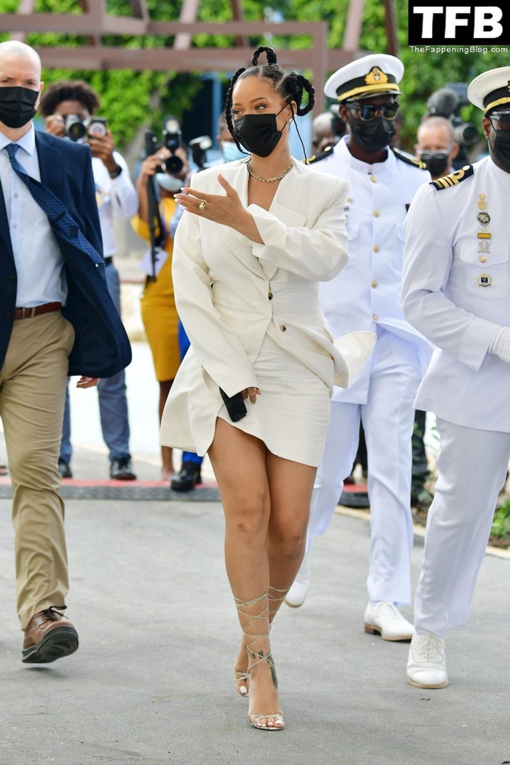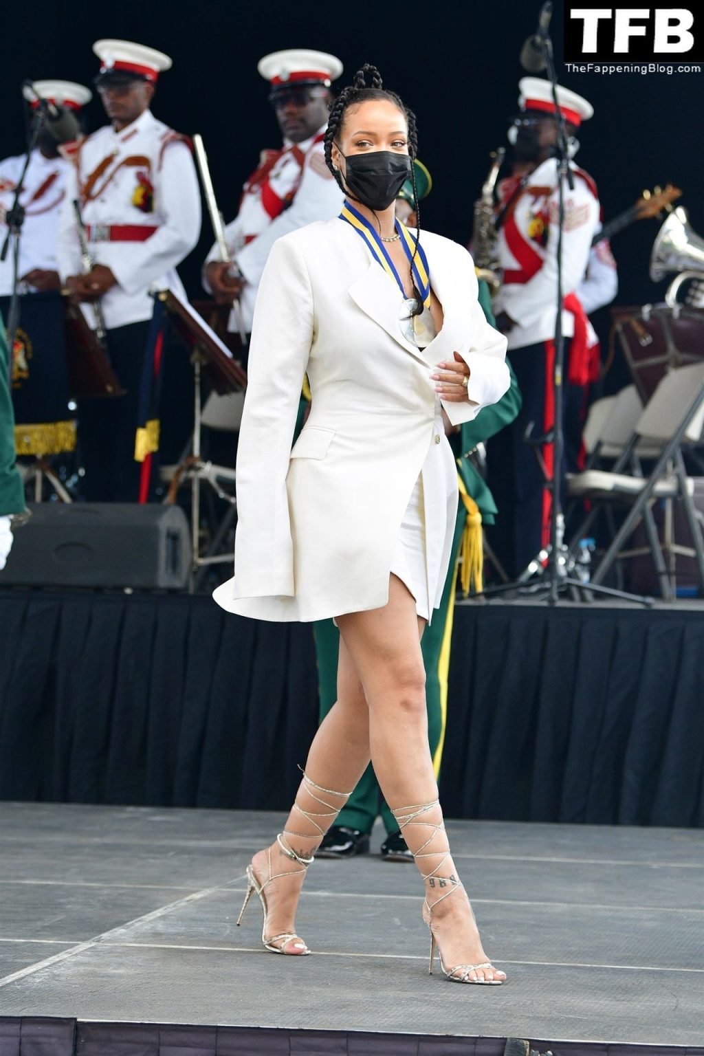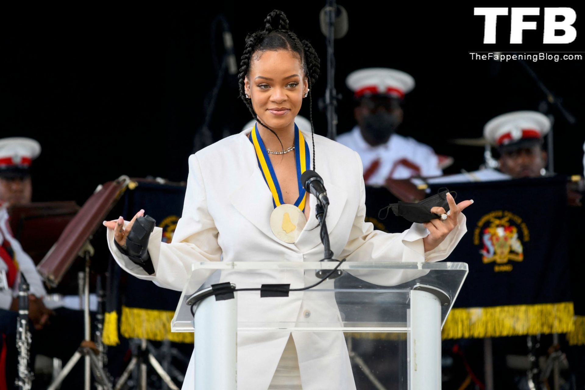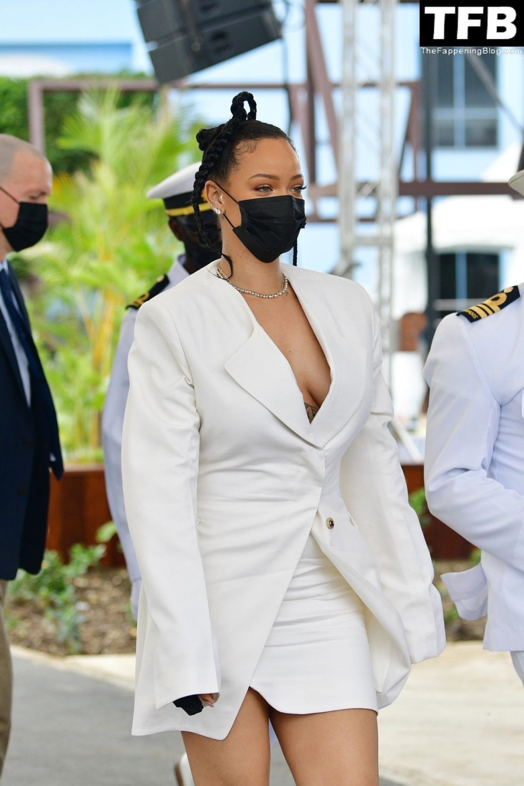 Звезда The Fappening Рианна выглядит потрясающе в глубокодекольтированном белом мини-платье и пиджаке, принимая знак Национального героя на празднованиях Республики Барбадос в Бриджтауне, 30.11.2021.