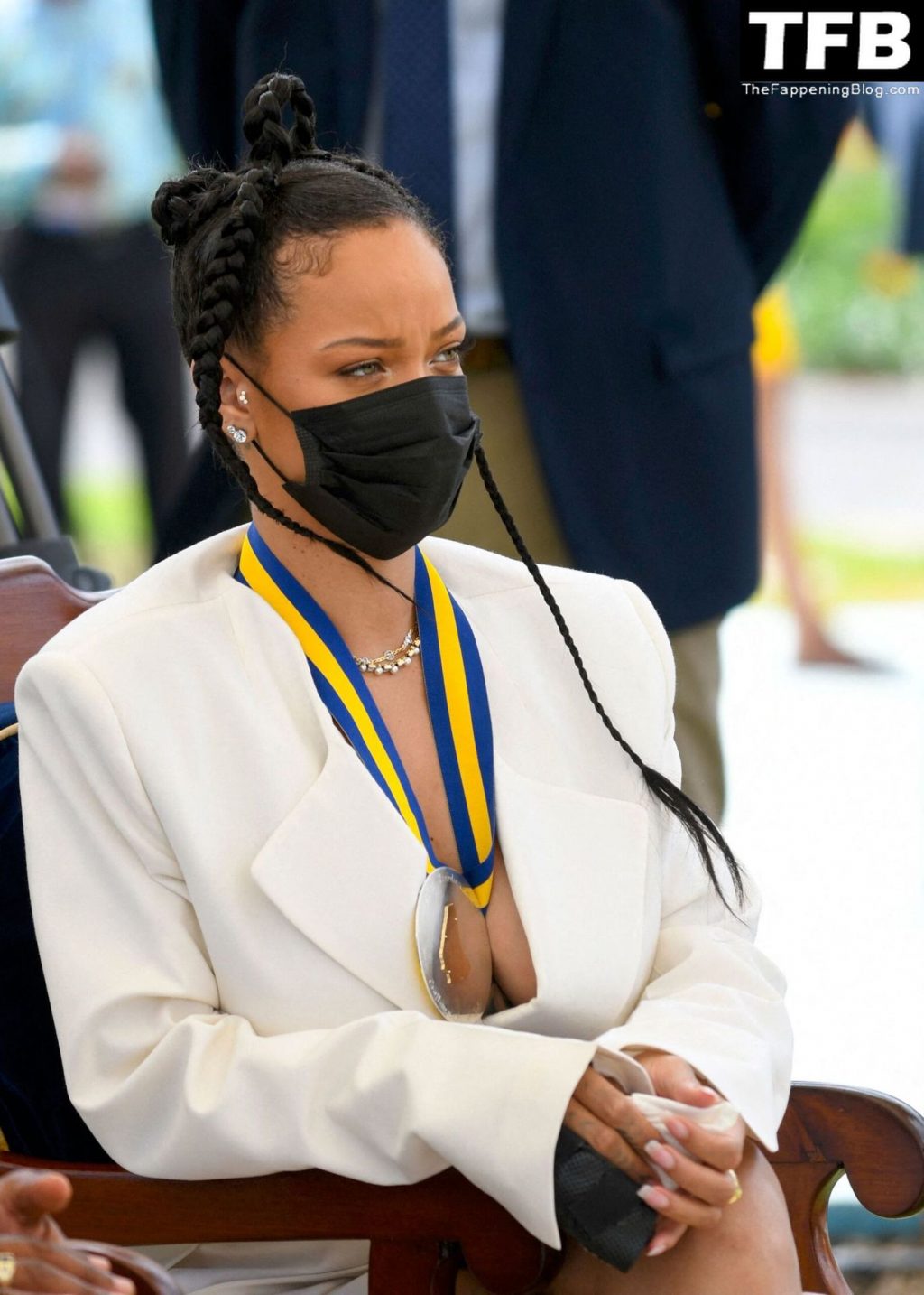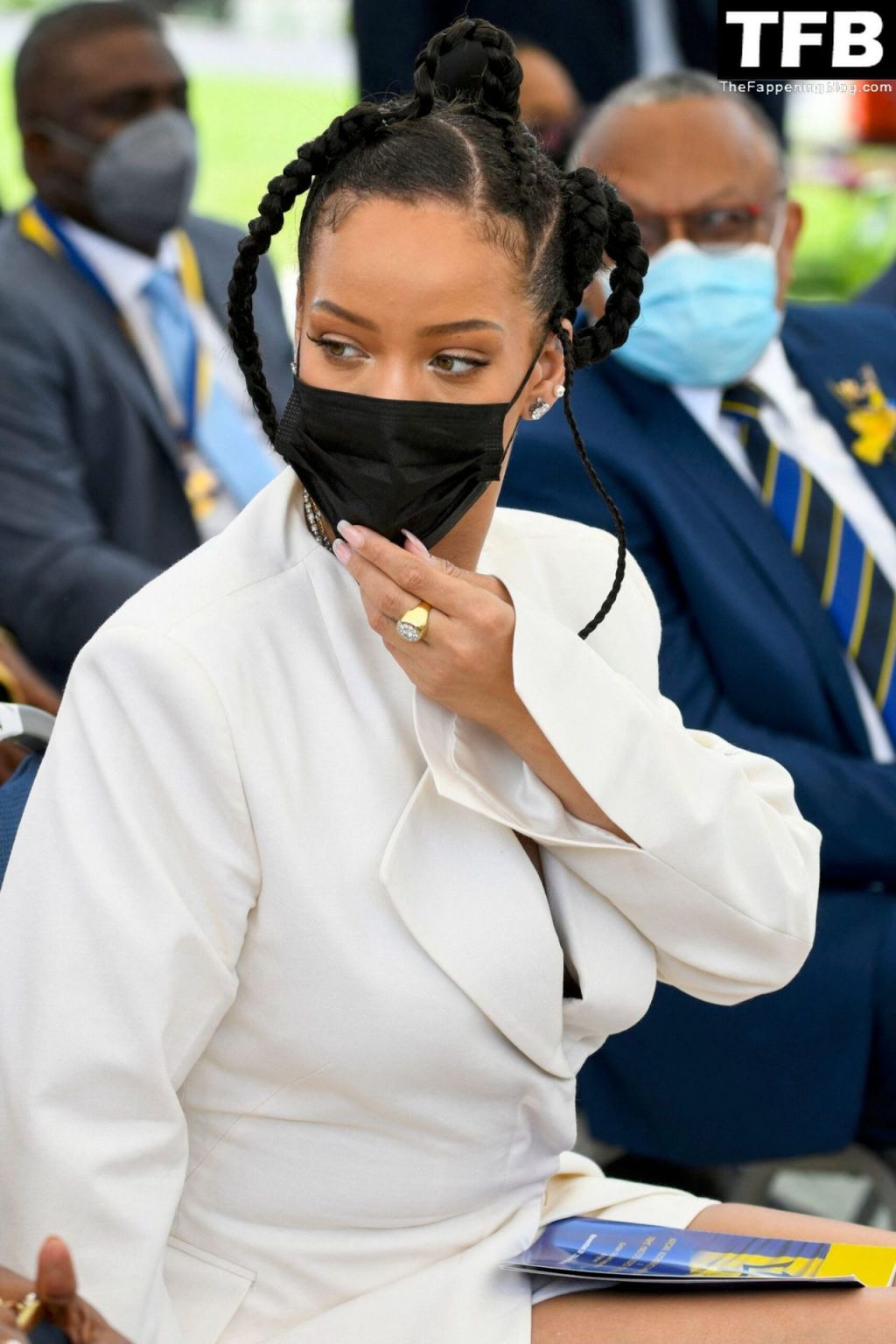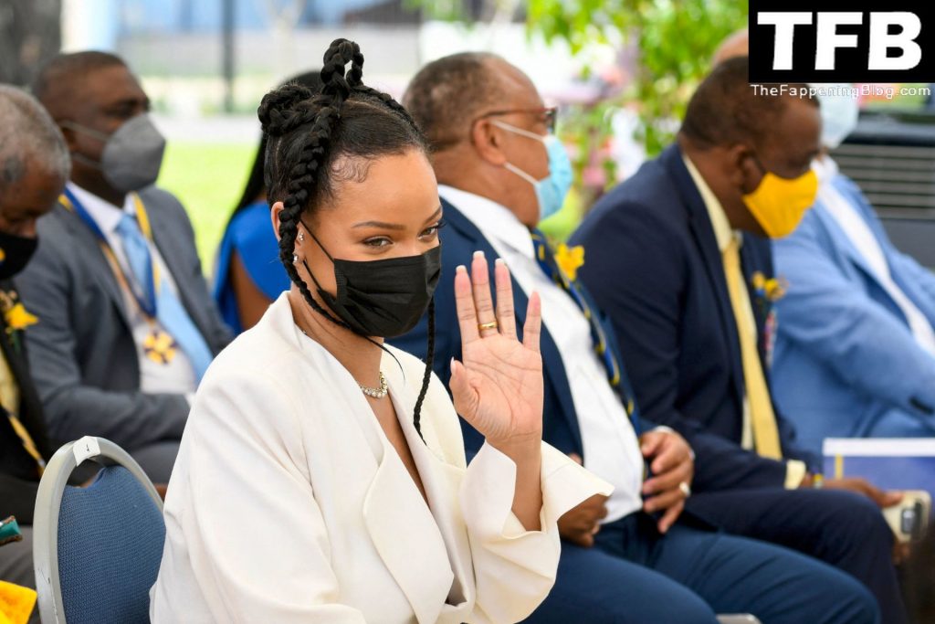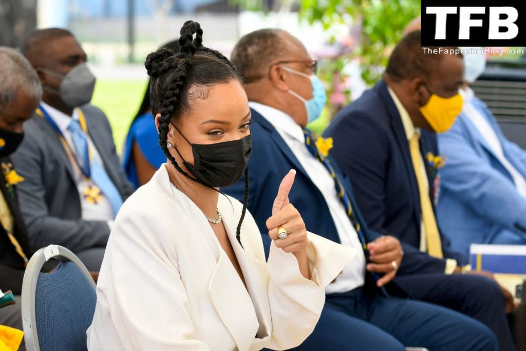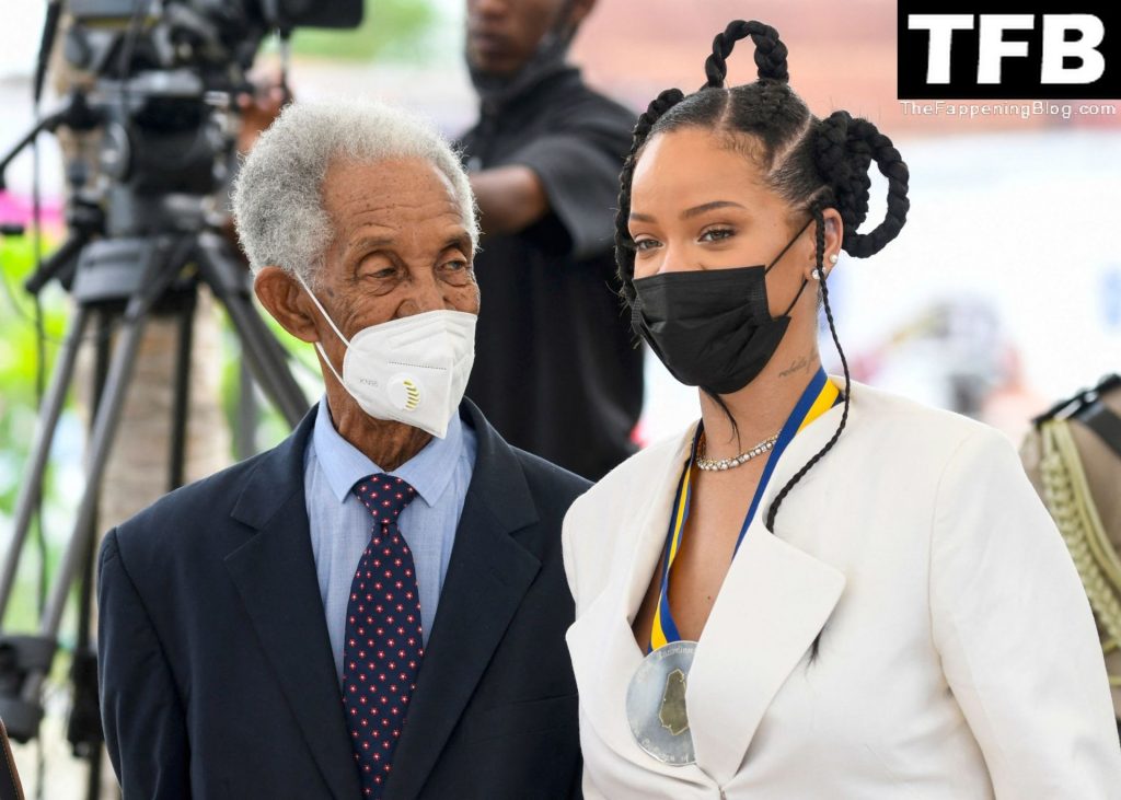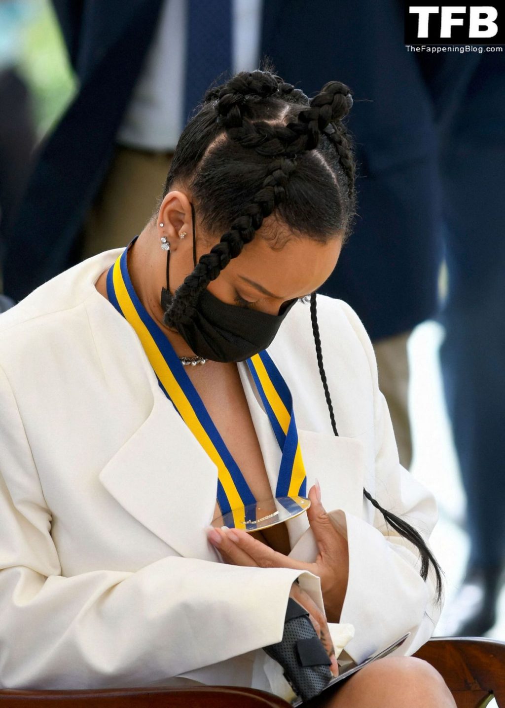 Звезда The Fappening Рианна выглядит потрясающе в глубокодекольтированном белом мини-платье и пиджаке, принимая знак Национального героя на празднованиях Республики Барбадос в Бриджтауне, 30.11.2021.