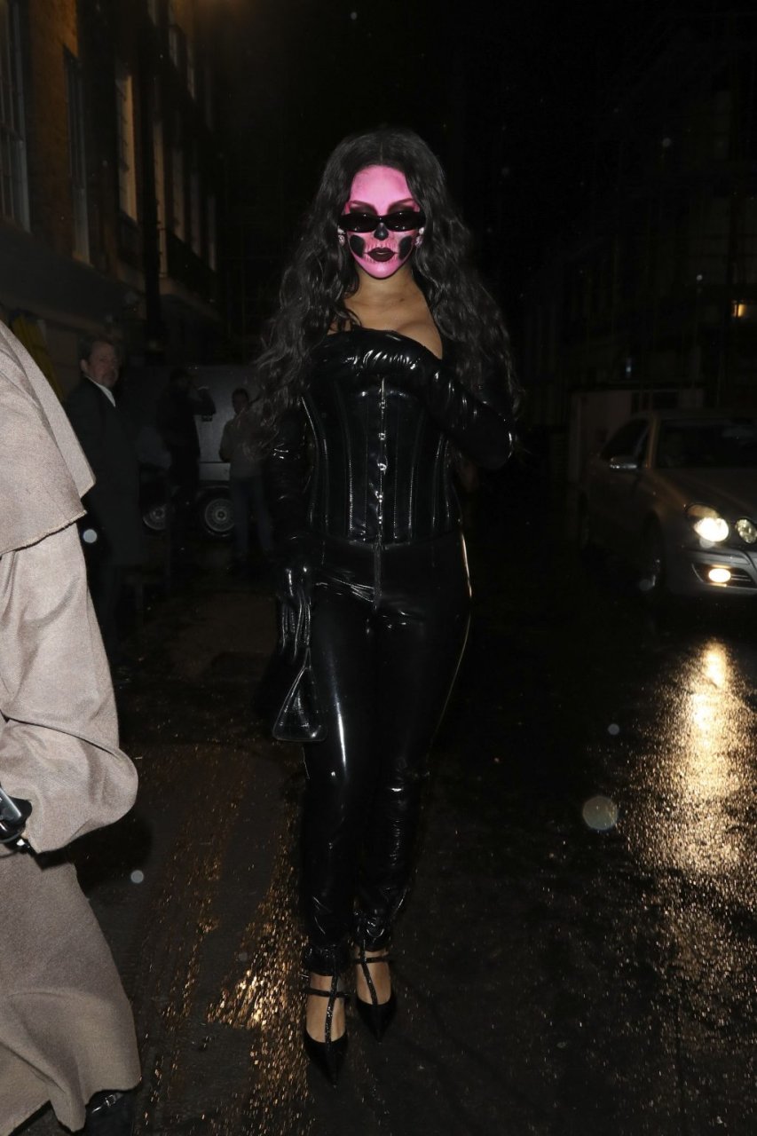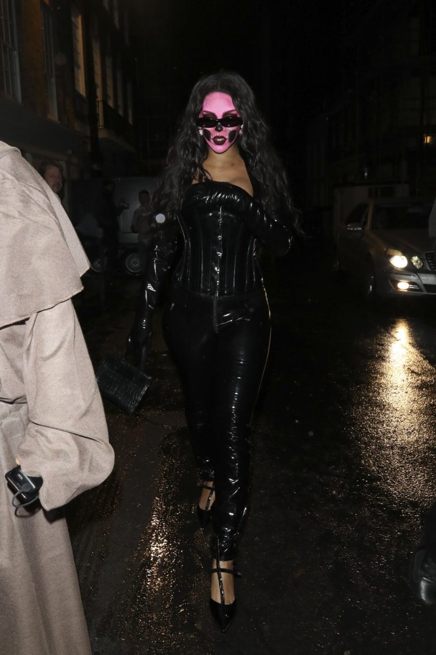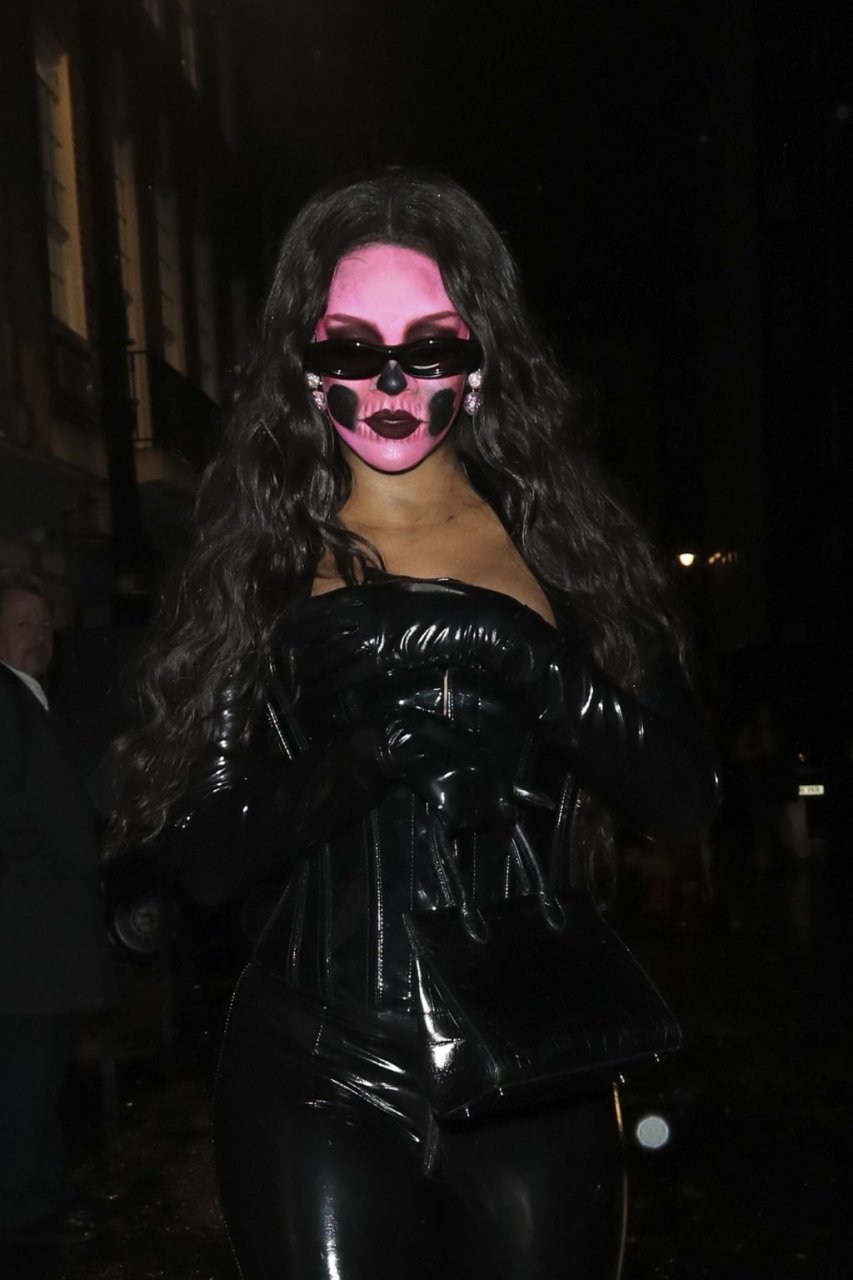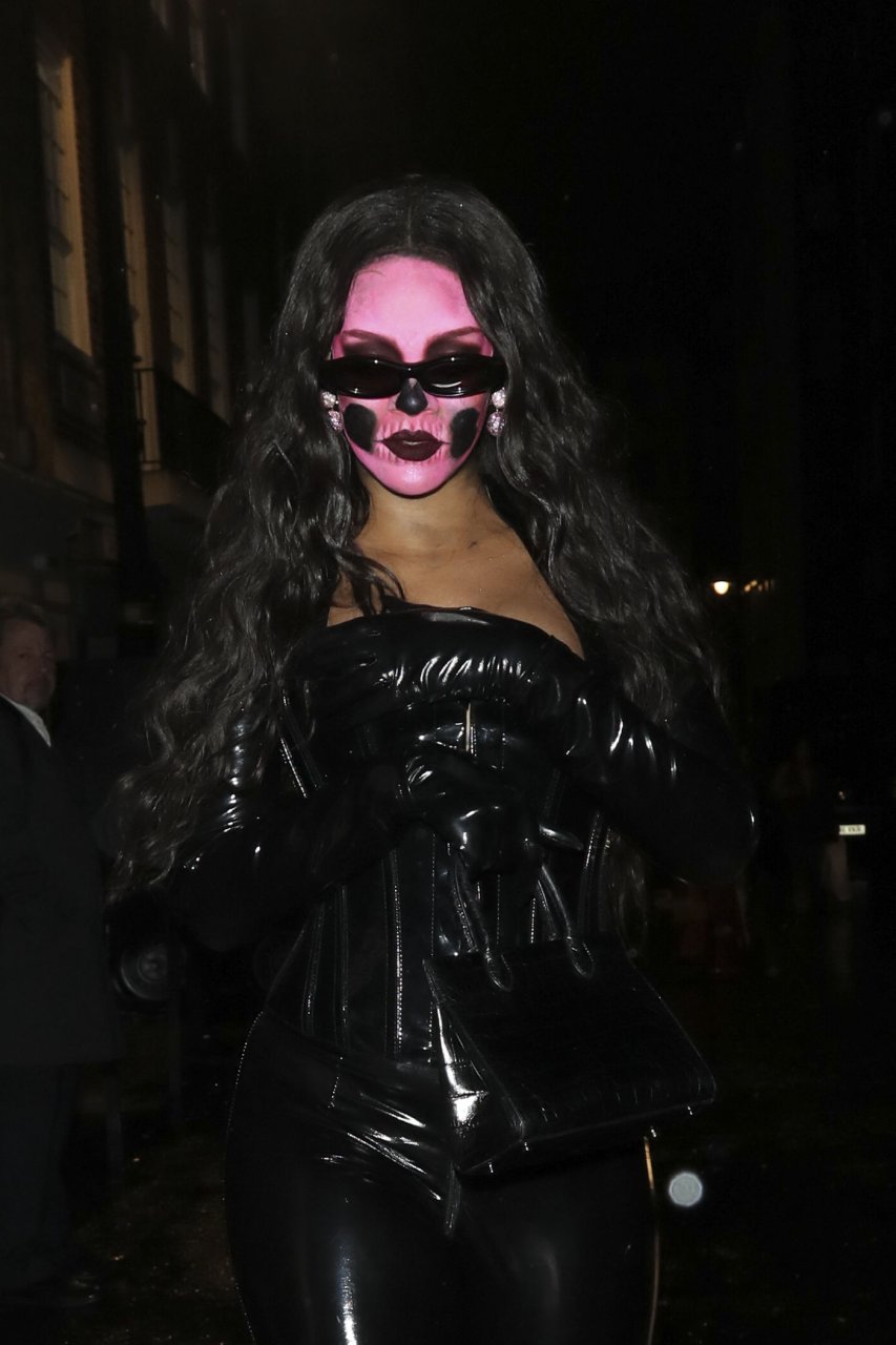 Рианна предстала в эффектном образе с пышным бюстом на Хэллоуинской вечеринке в Лондоне, 31.10.2018. Барбадосская певица продемонстрировала свои изгибы в черном бюстье из лакированной кожи и колготках, с розовым макияжем в виде черепа на лице и шпильках с шипами.