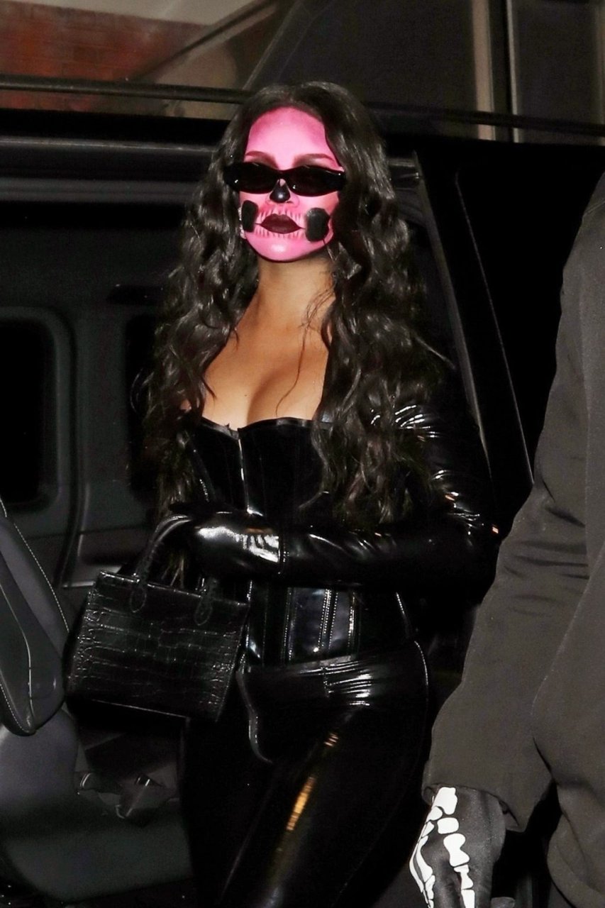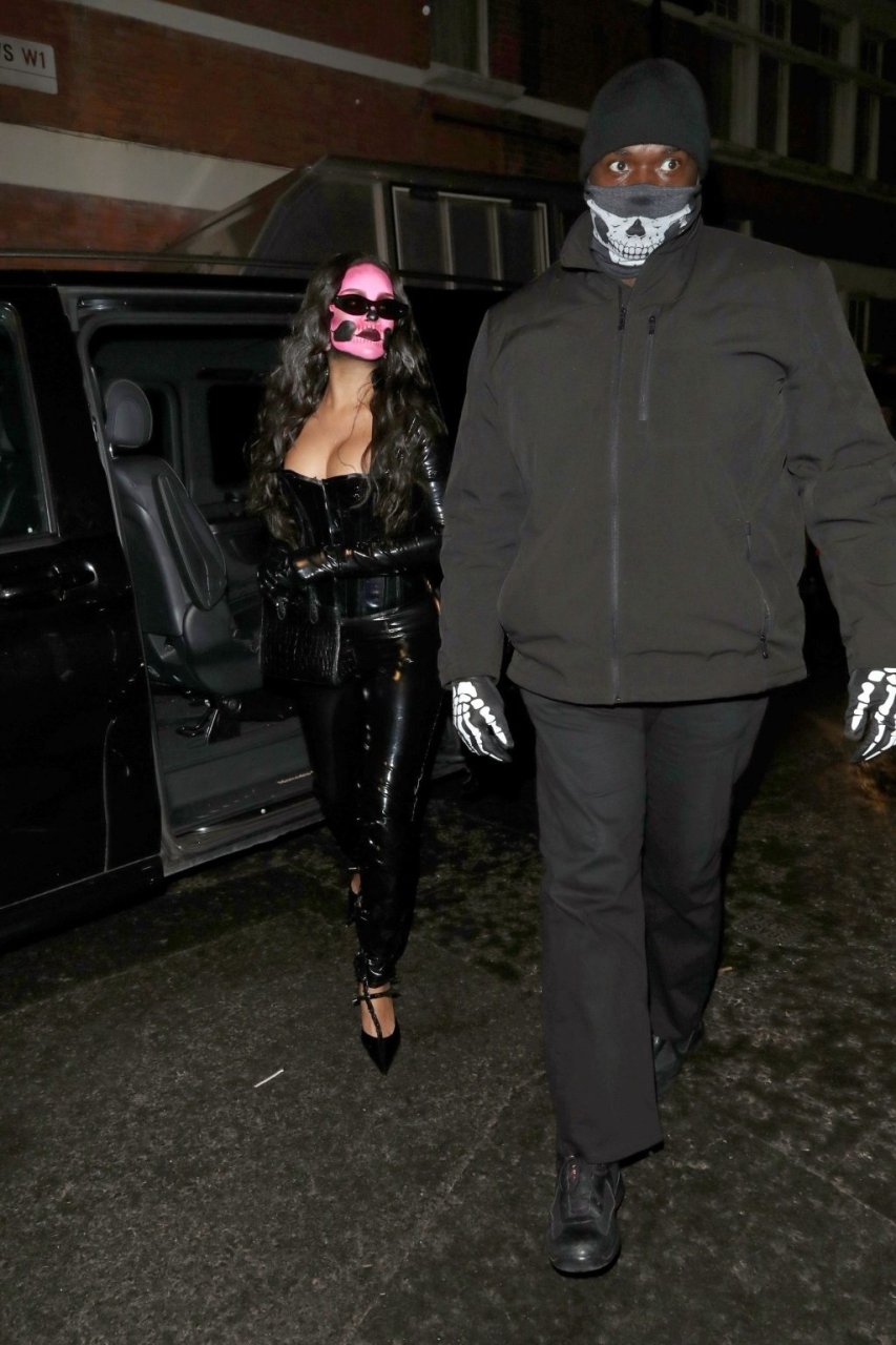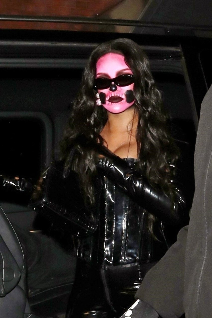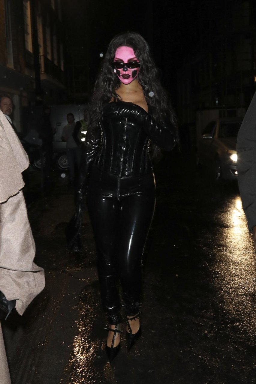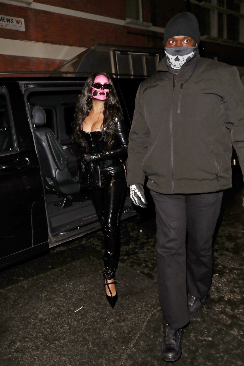 Рианна предстала в эффектном образе с пышным бюстом на Хэллоуинской вечеринке в Лондоне, 31.10.2018. Барбадосская певица продемонстрировала свои изгибы в черном бюстье из лакированной кожи и колготках, с розовым макияжем в виде черепа на лице и шпильках с шипами.