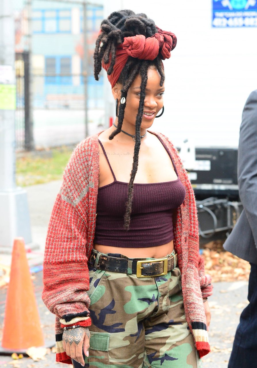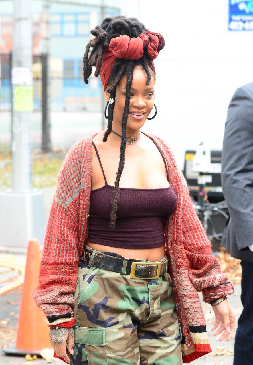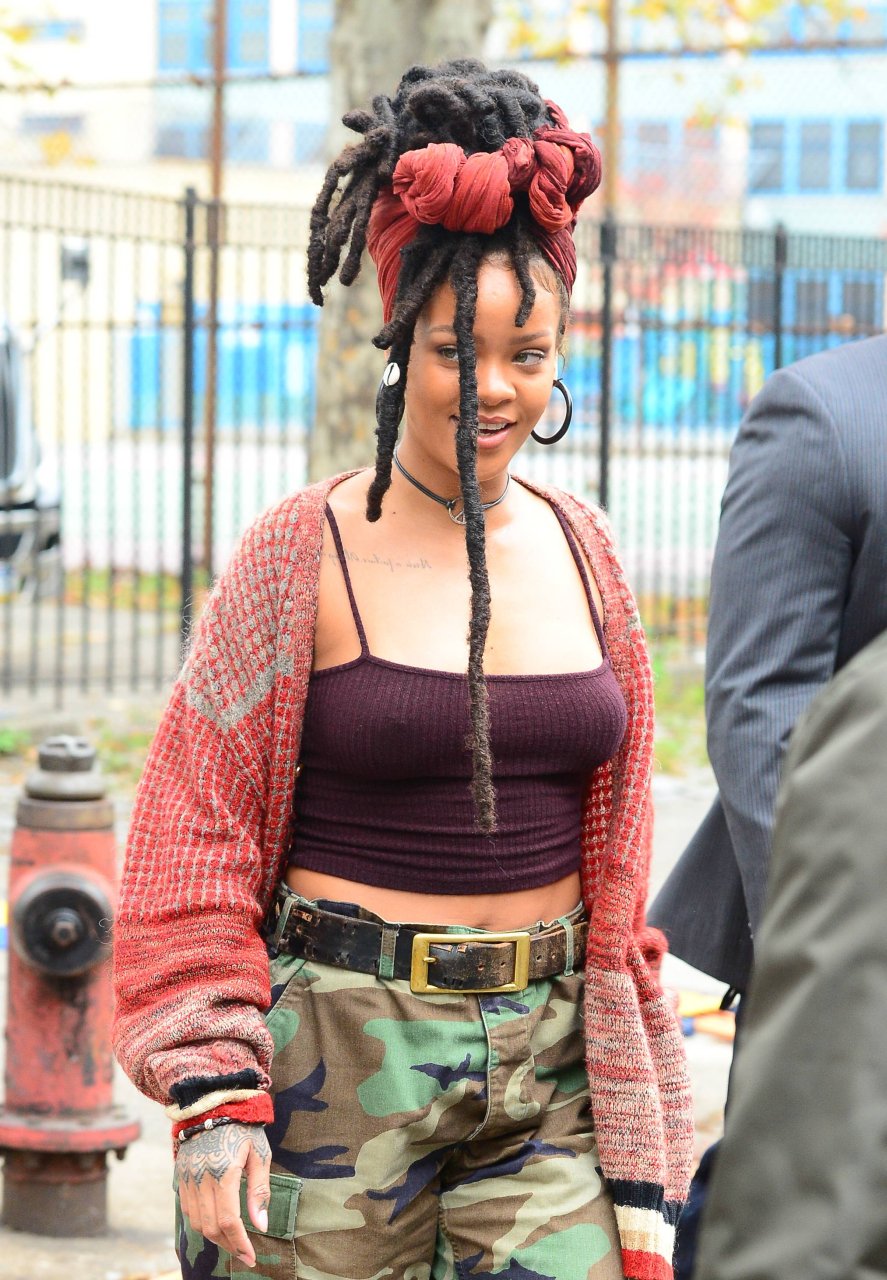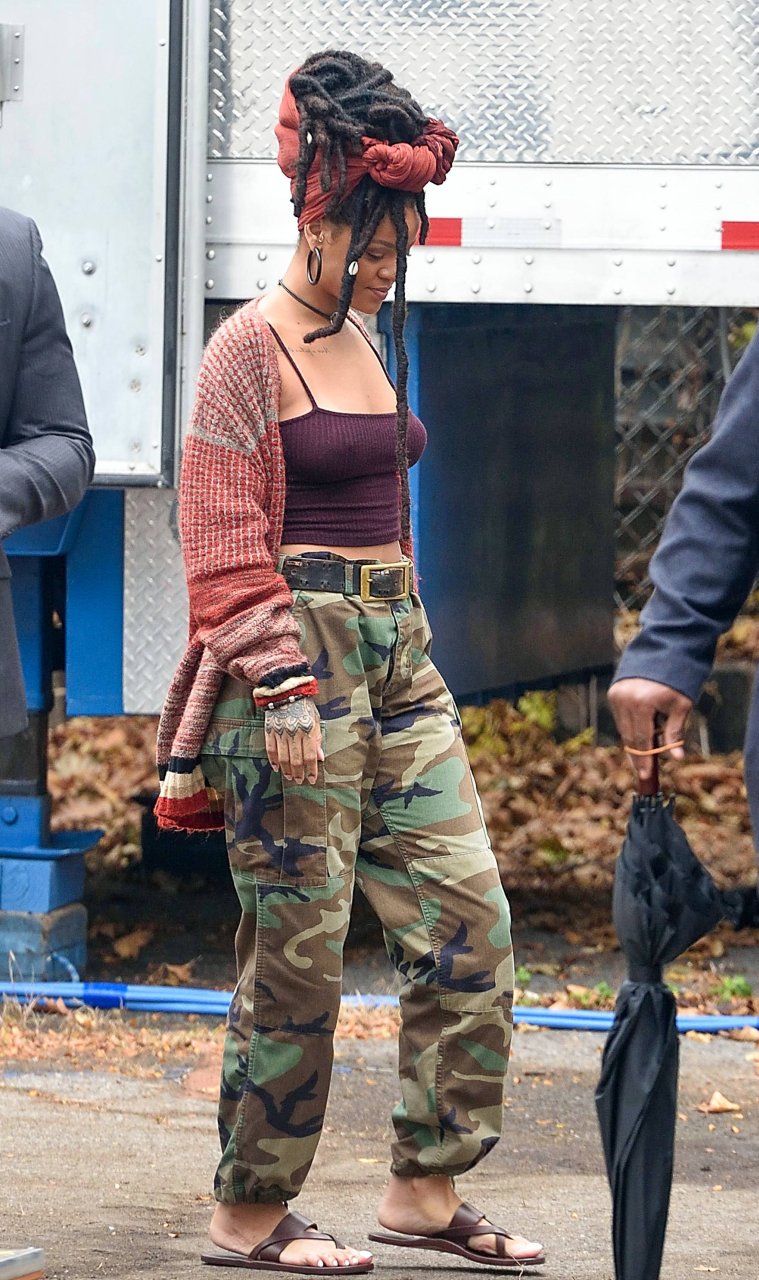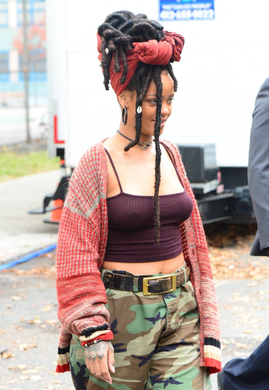 Рианна носит маленький фиолетовый топ без бюстгальтера на съемочной площадке фильма «Океаны 8» в Нью-Йорке, 11/03/16. Черная Горгона. Рианна — американская певица и дизайнер моды. Возраст: 28 (20 февраля 1988).