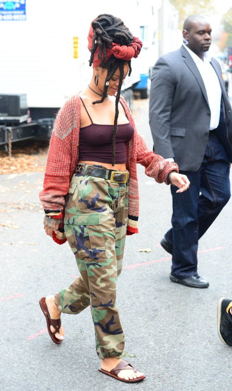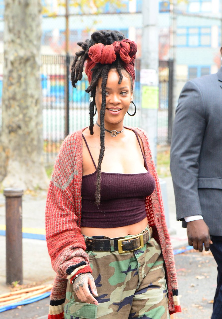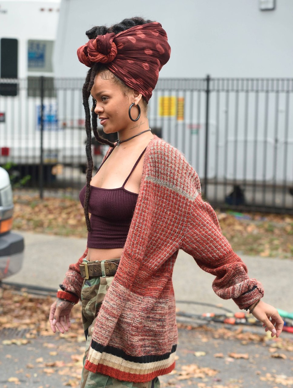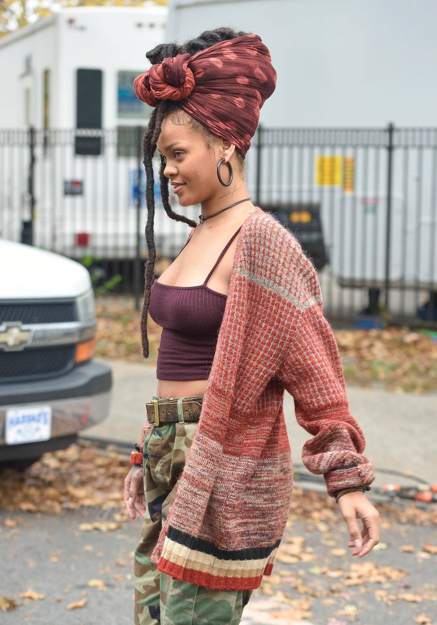 Рианна носит маленький фиолетовый топ без бюстгальтера на съемочной площадке фильма «Океаны 8» в Нью-Йорке, 11/03/16. Черная Горгона. Рианна — американская певица и дизайнер моды. Возраст: 28 (20 февраля 1988).