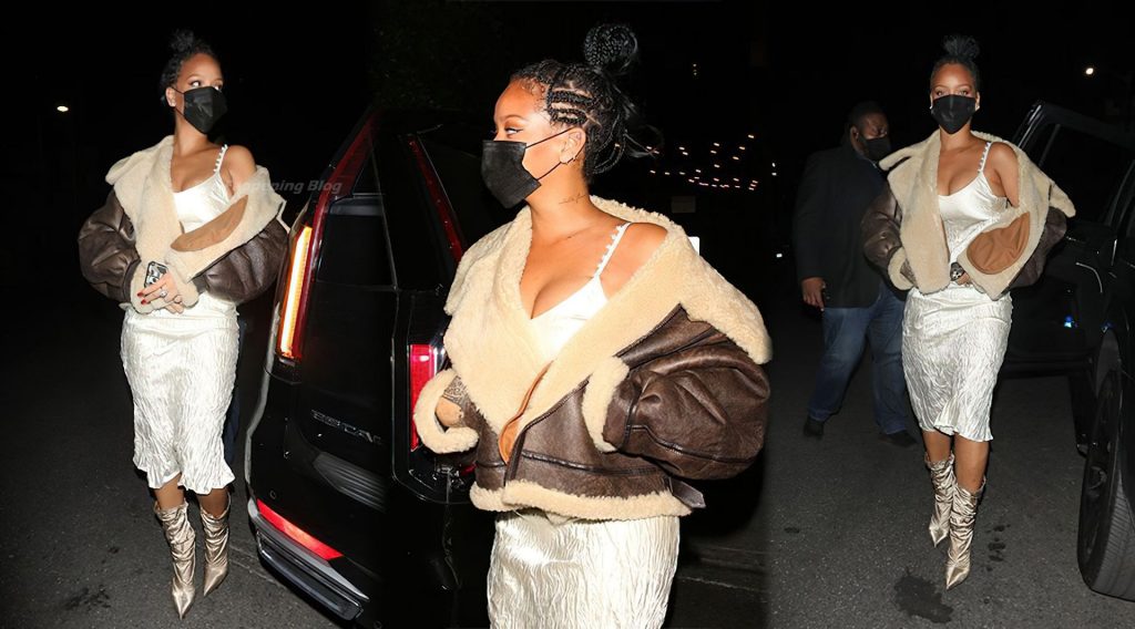 Звезда Фаппенинга и певица Рианна демонстрирует декольте, прибывая в ресторан Лос-Анджелеса в облегающем платье из слоновой кости из сатина и куртке-авиаторе.