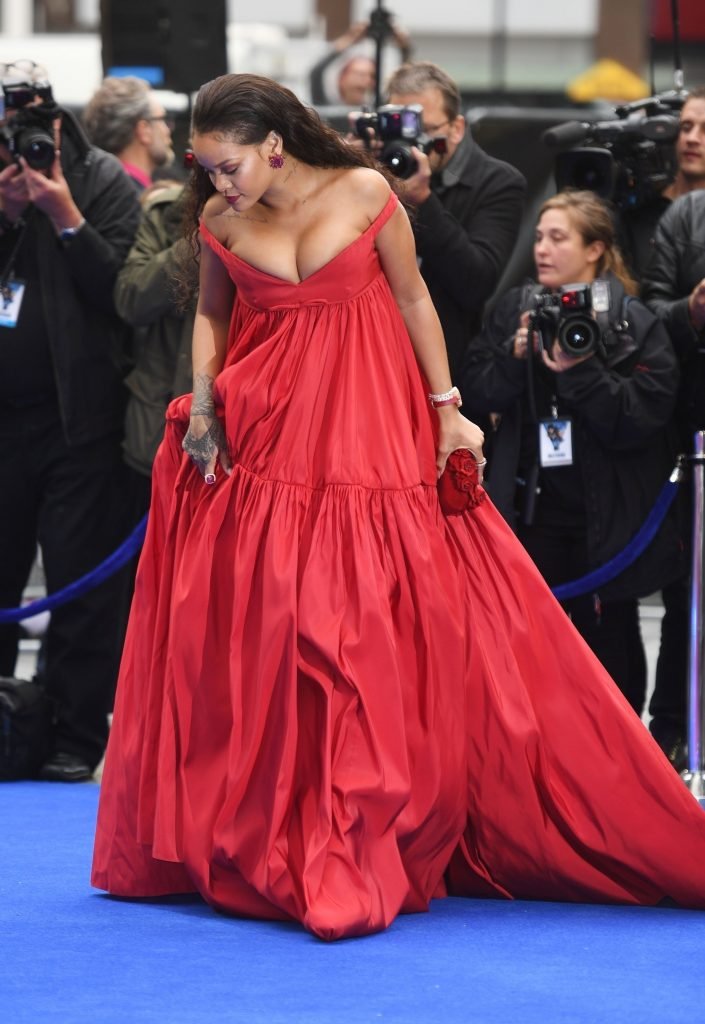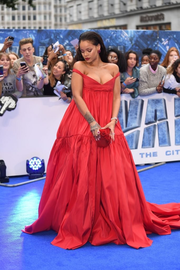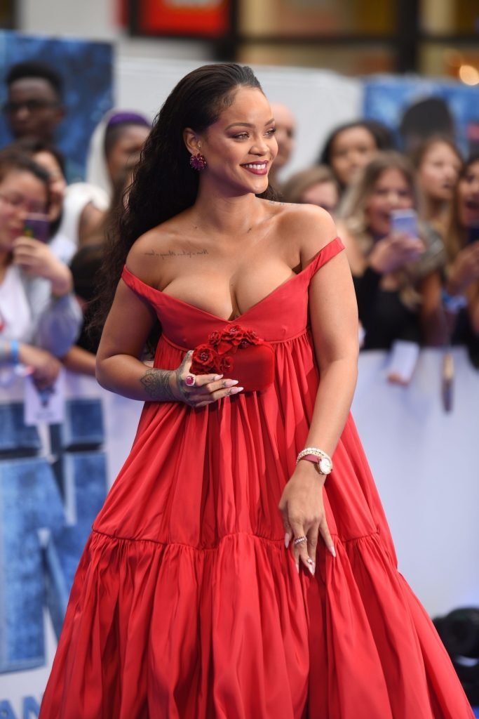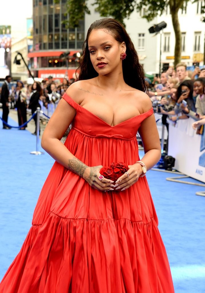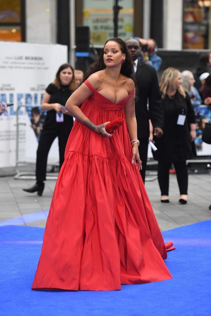 Певица Рианна демонстрирует своё большое декольте на премьере фильма «Валериан и город тысячи планет» в Лондоне, 24.07.2017.