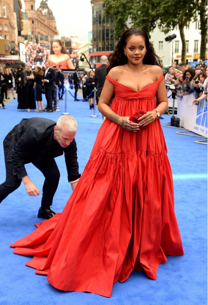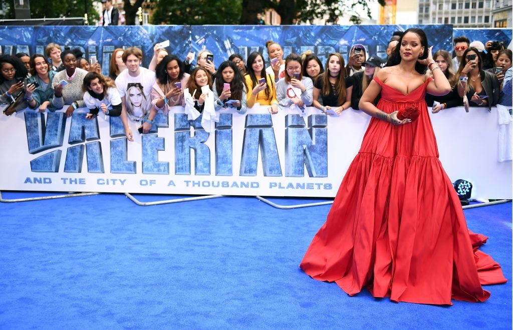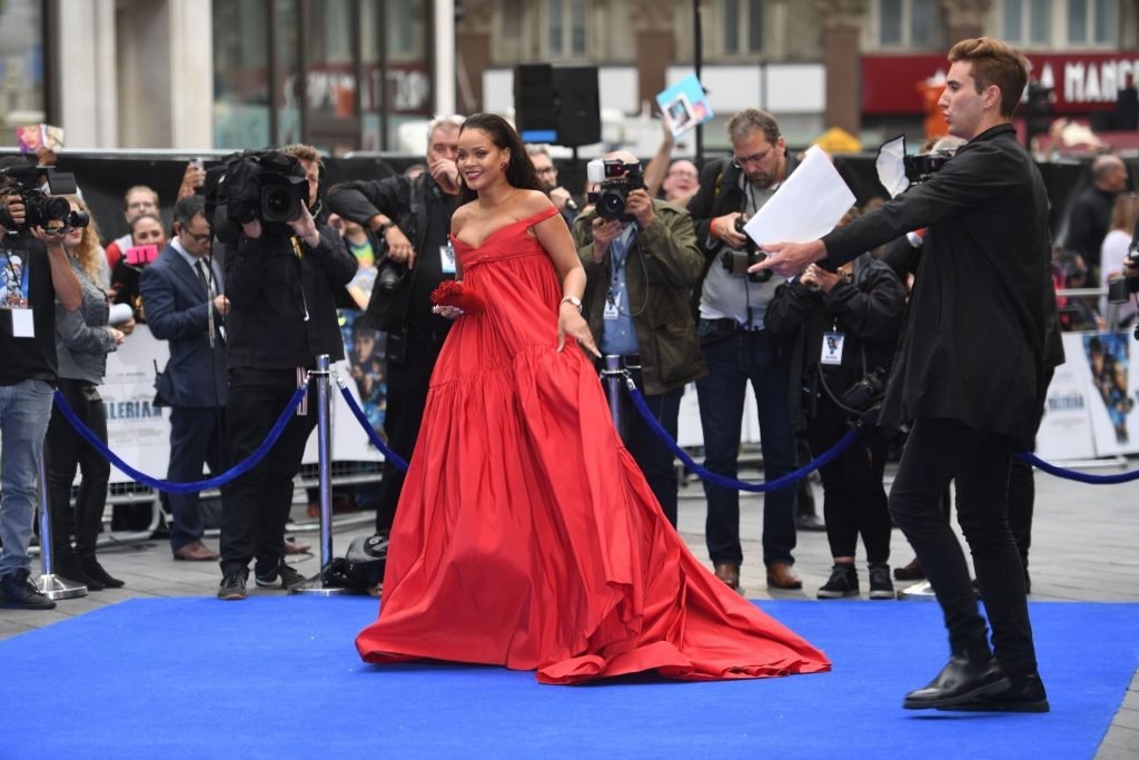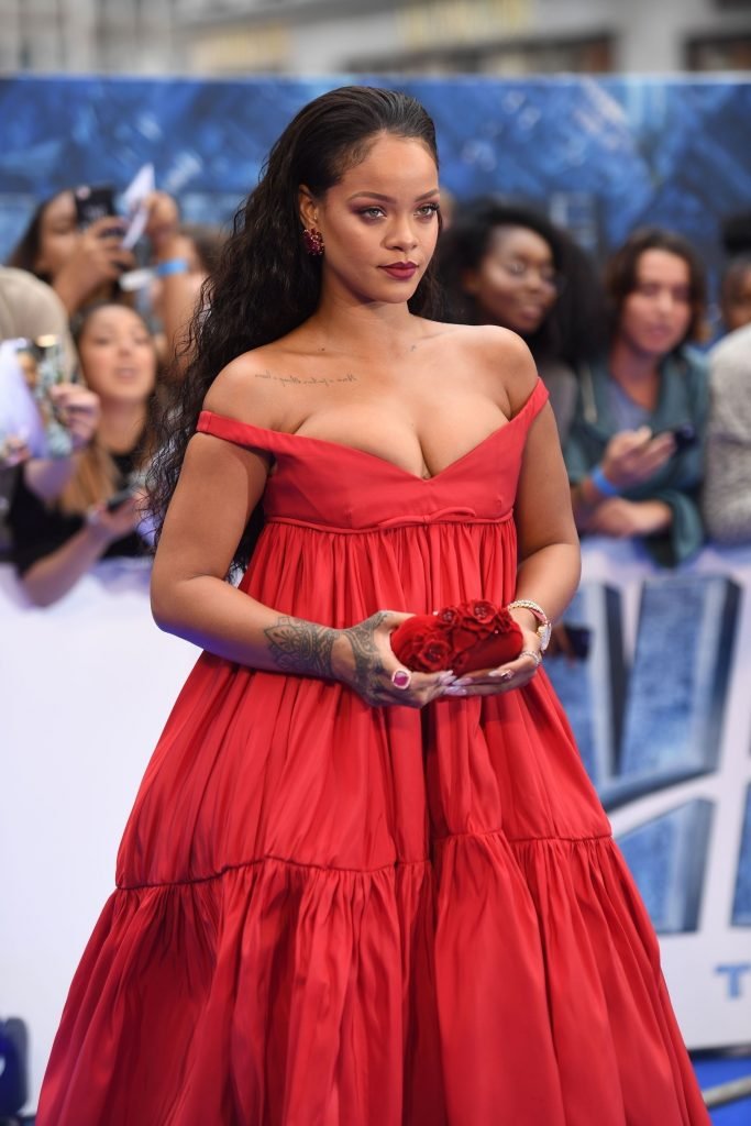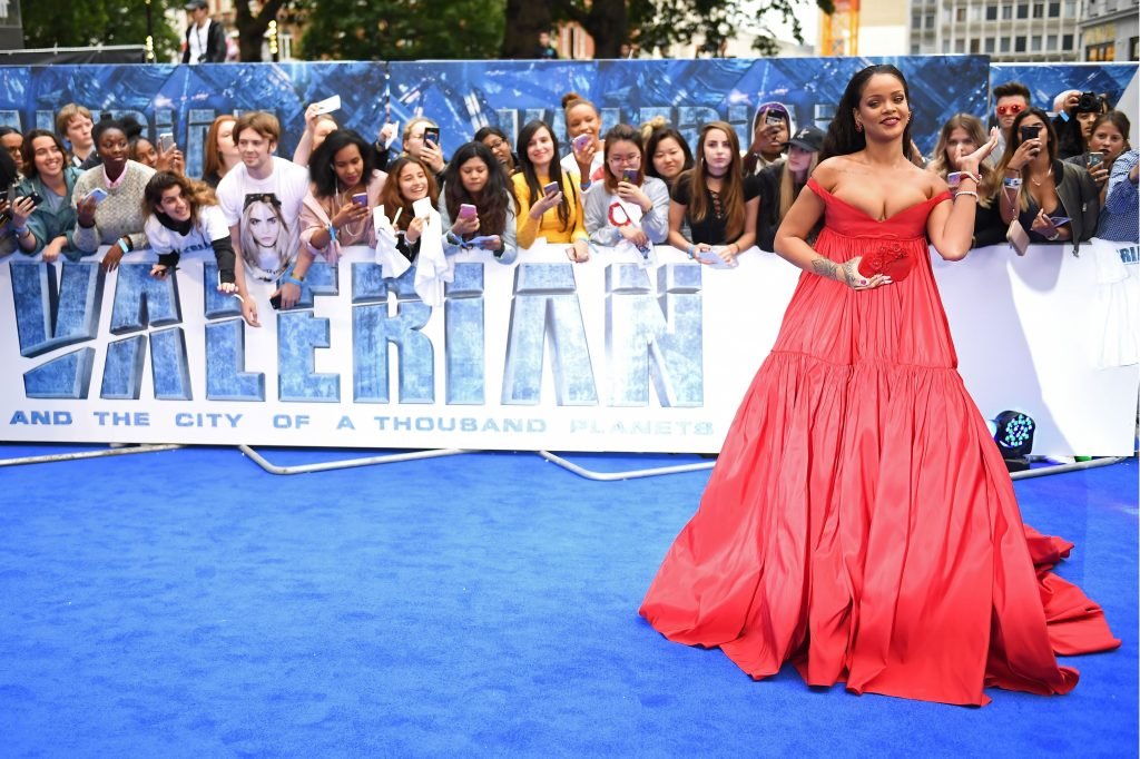 Певица Рианна демонстрирует своё большое декольте на премьере фильма «Валериан и город тысячи планет» в Лондоне, 24.07.2017.