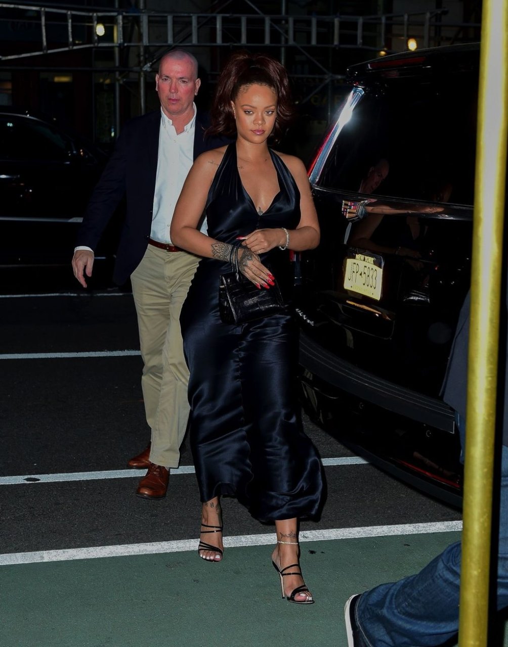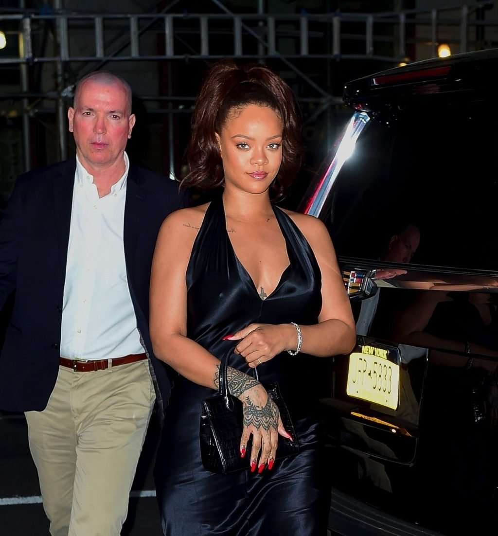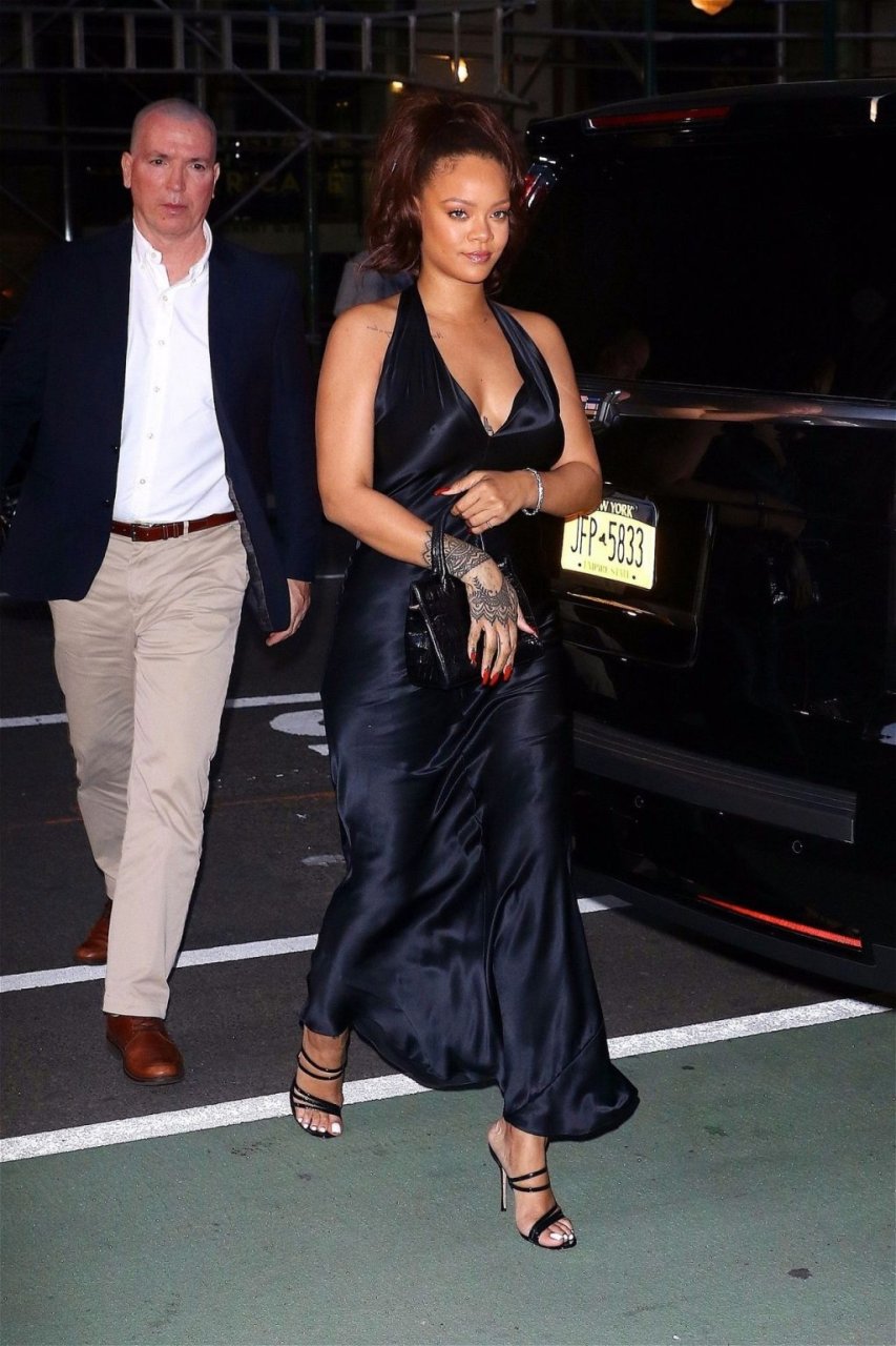 Певица Рианна появилась в шелковом черном платье на частной вечеринке в Нью-Йорке, 11.06.2019.