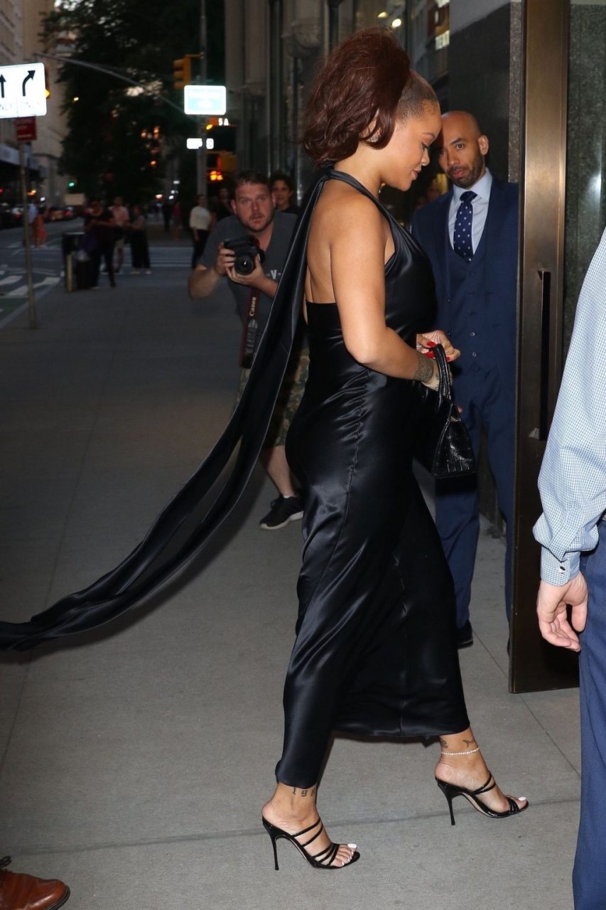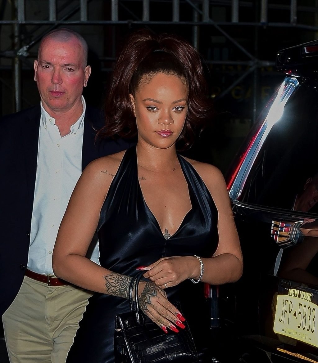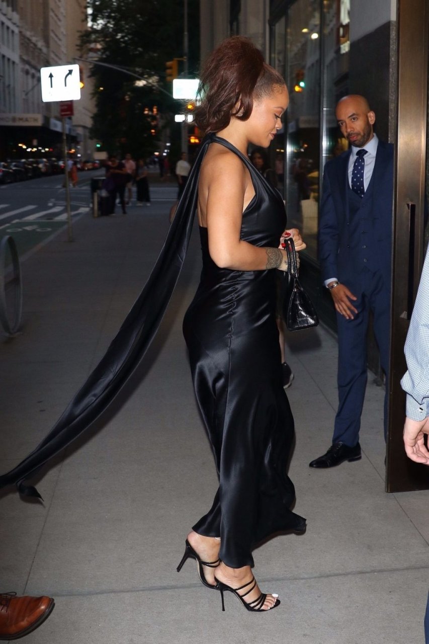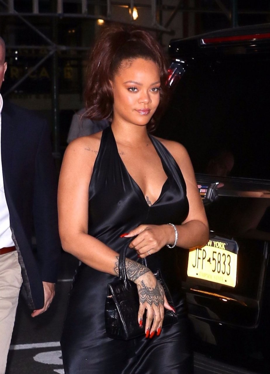 Певица Рианна появилась в шелковом черном платье на частной вечеринке в Нью-Йорке, 11.06.2019.