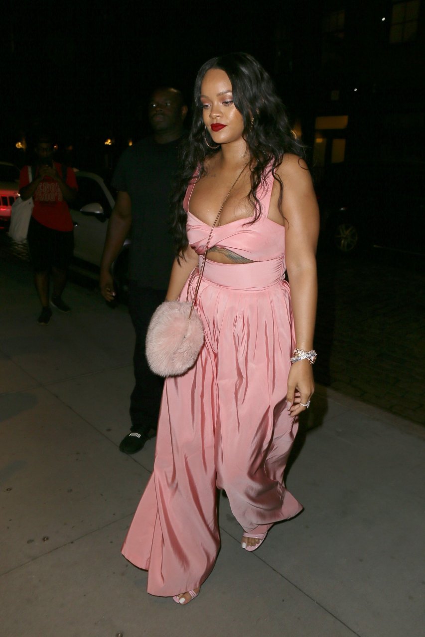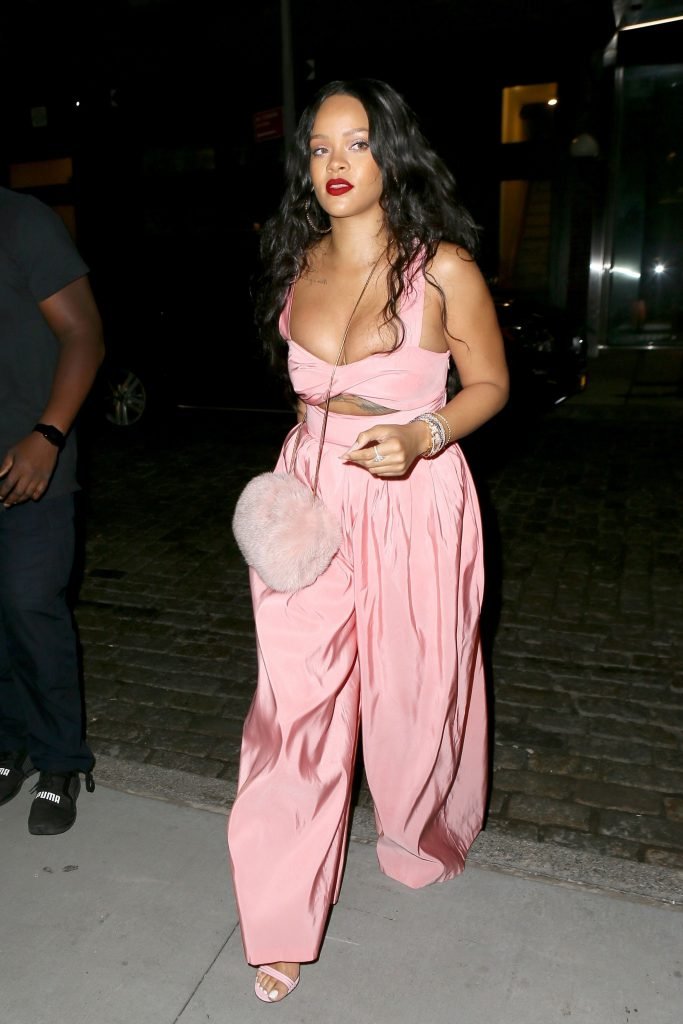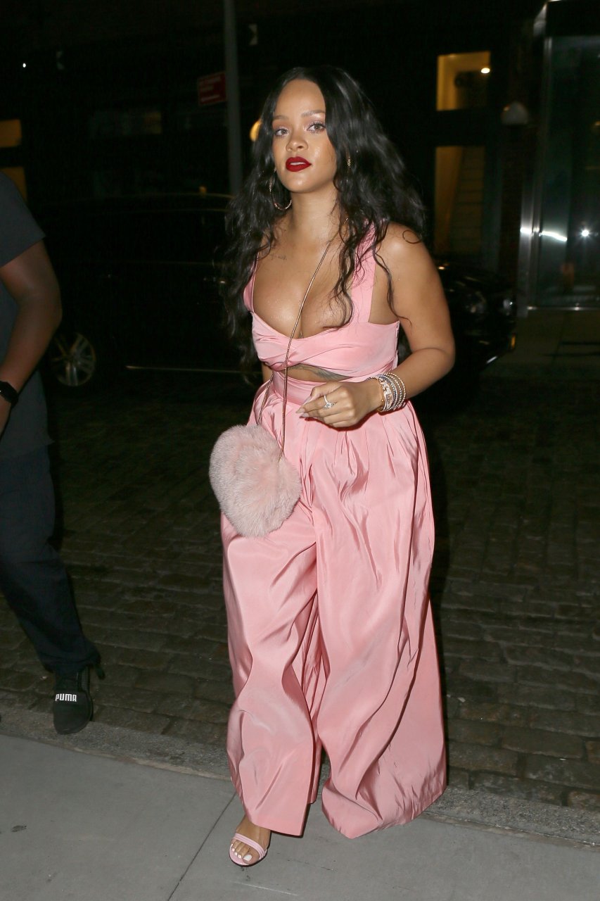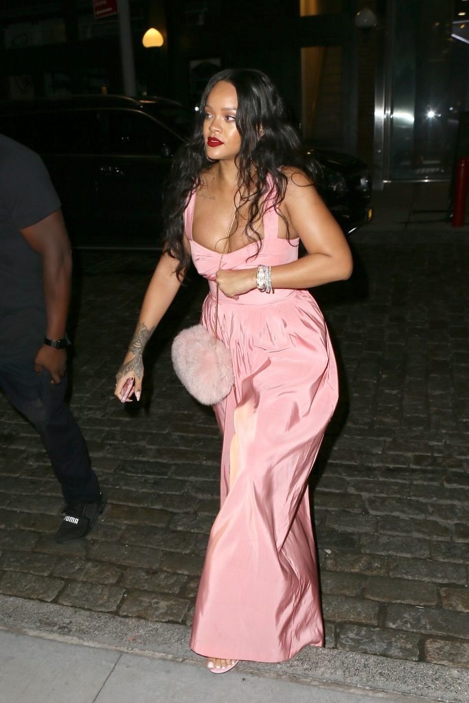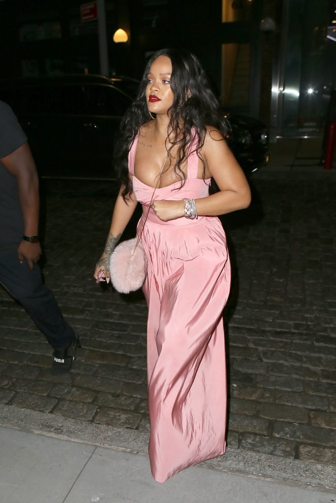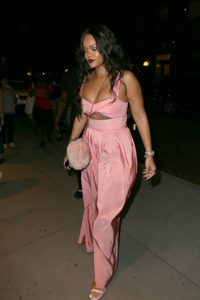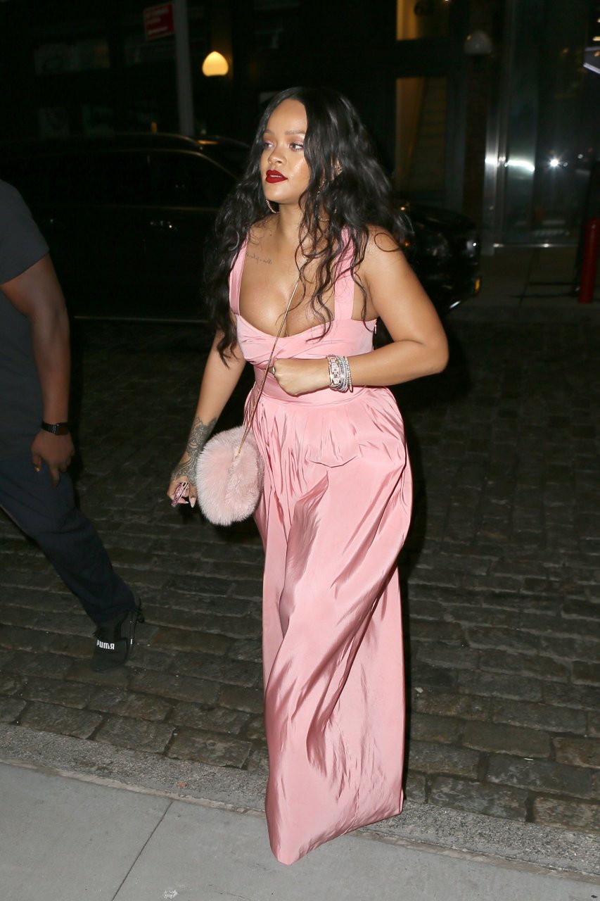 Rihanna демонстрирует обильное декольте и немного больше, когда приезжает в Дамбо, Бруклин на ужин, 16.09.2017. Рианна — барбадосская певица, автор песен, актриса. (Bates Motel). Возраст: 29.