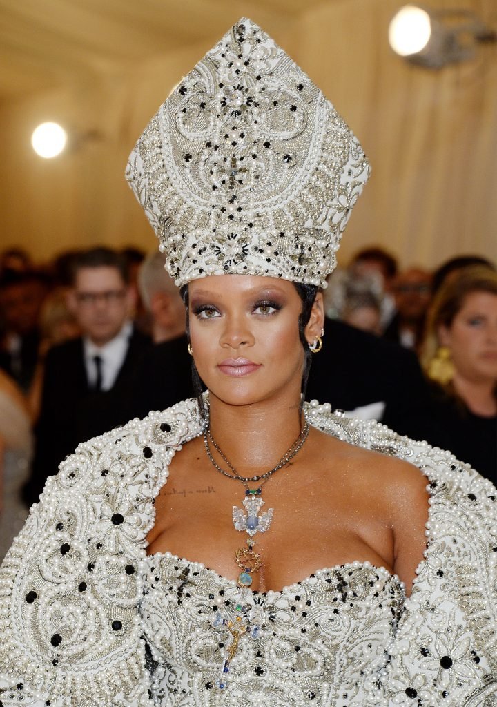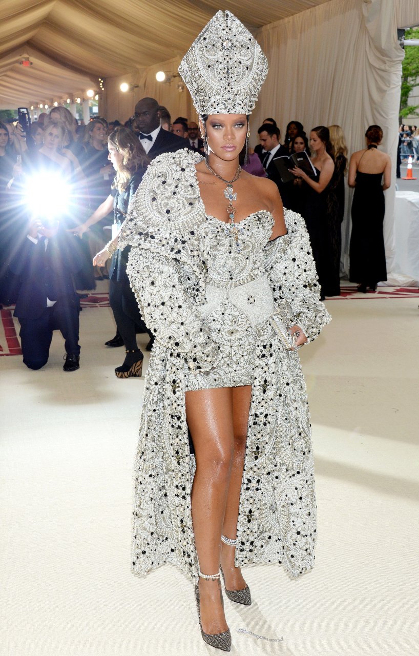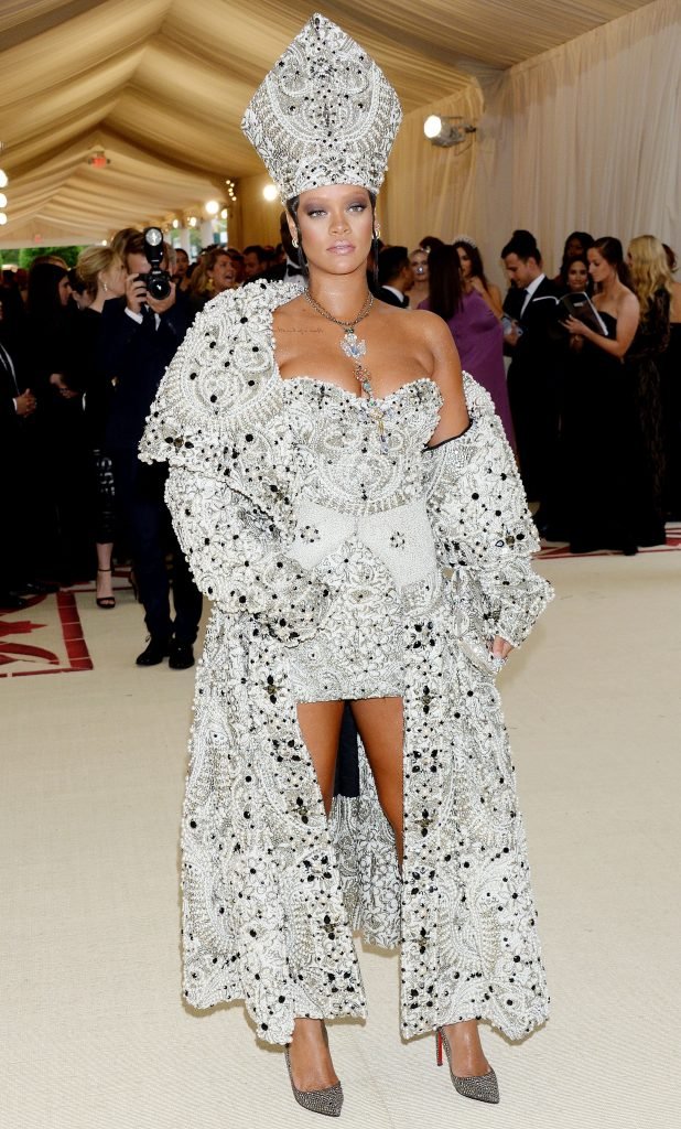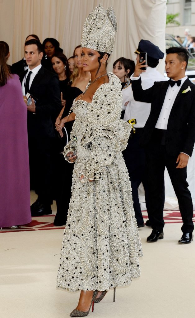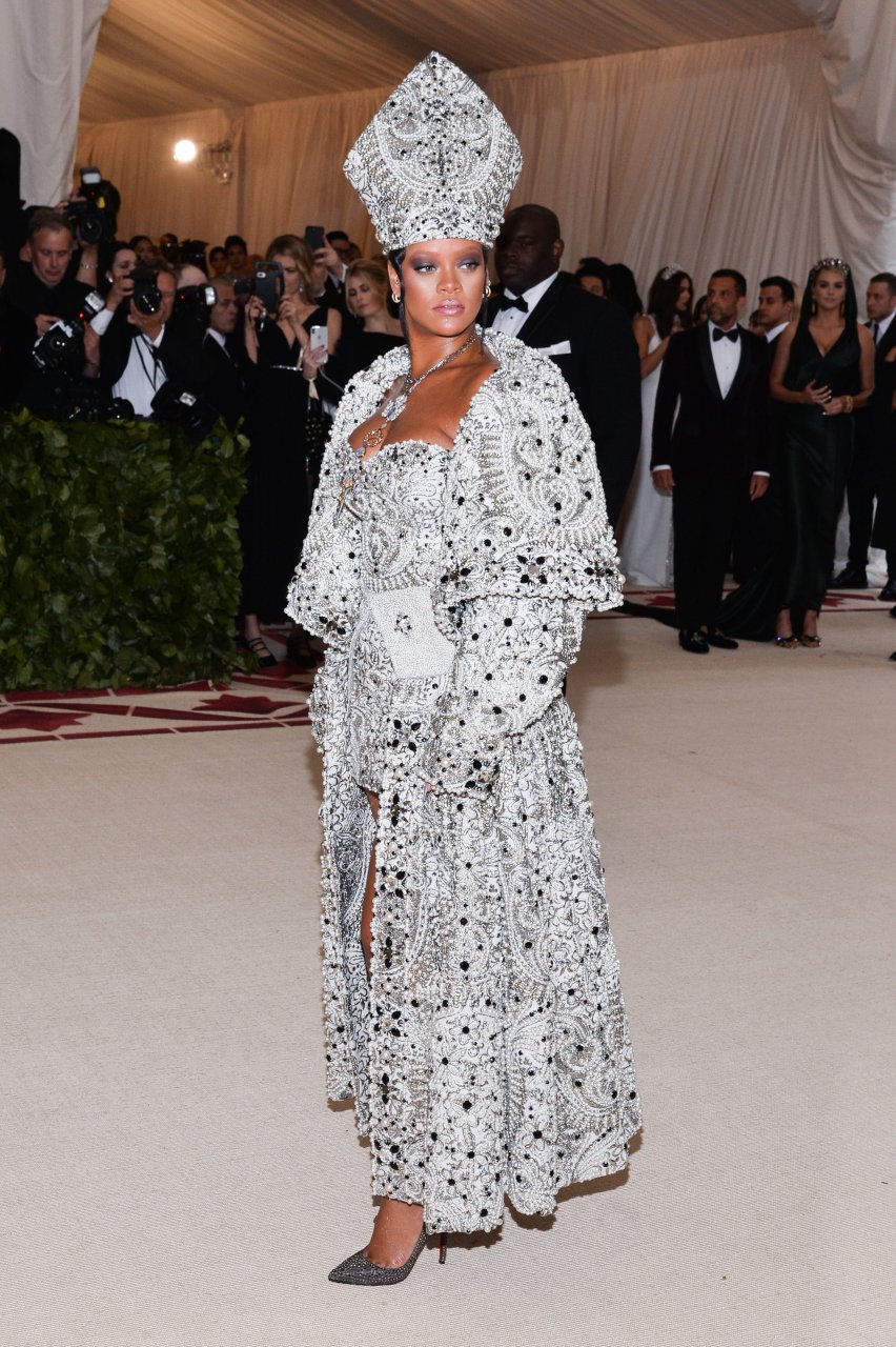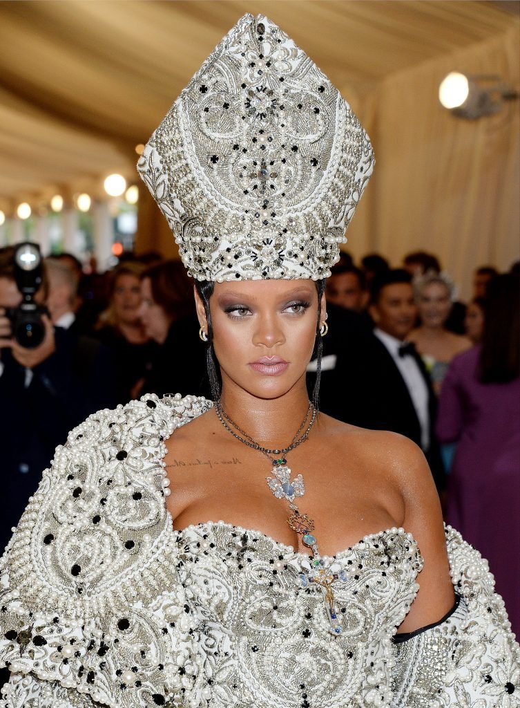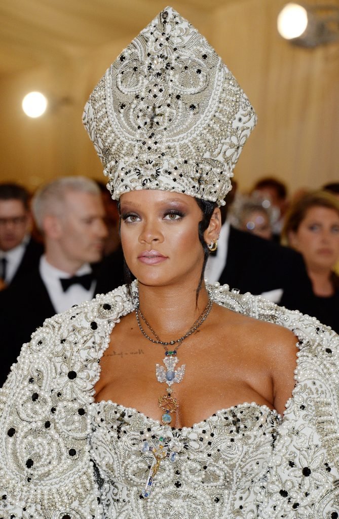 Наряд Рианны стал одним из самых обсуждаемых в социальных сетях — 30-летняя певица пришла на Met Gala в Метрополитен-музее в платье Папы Римского. Выглядит очень мощно.
