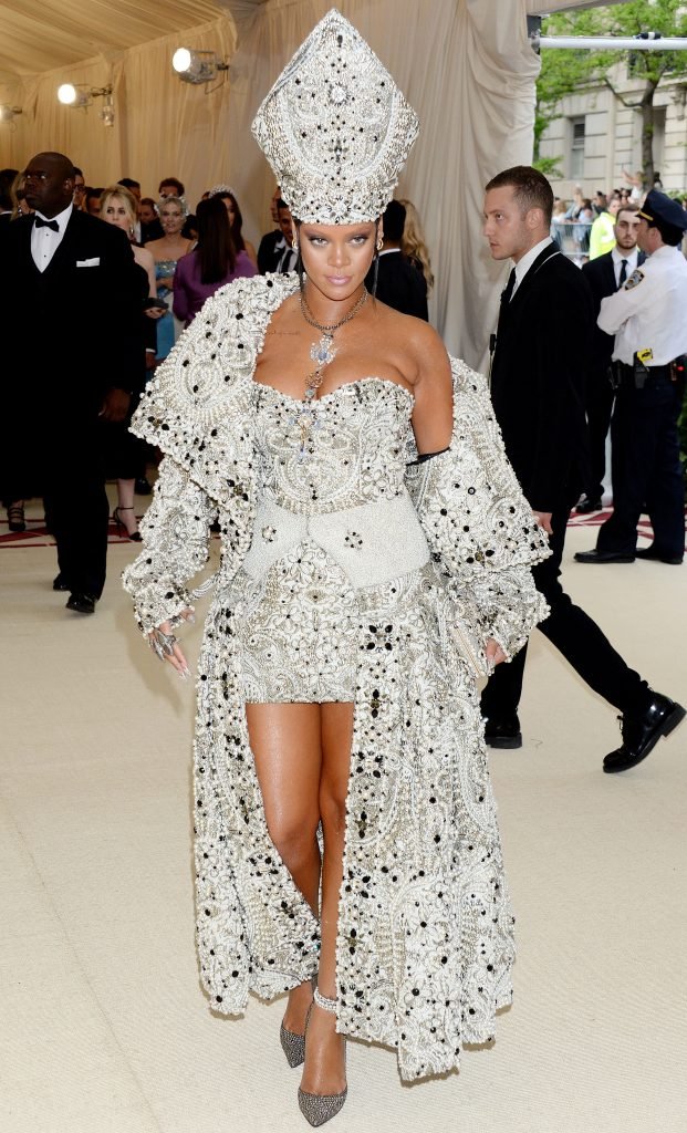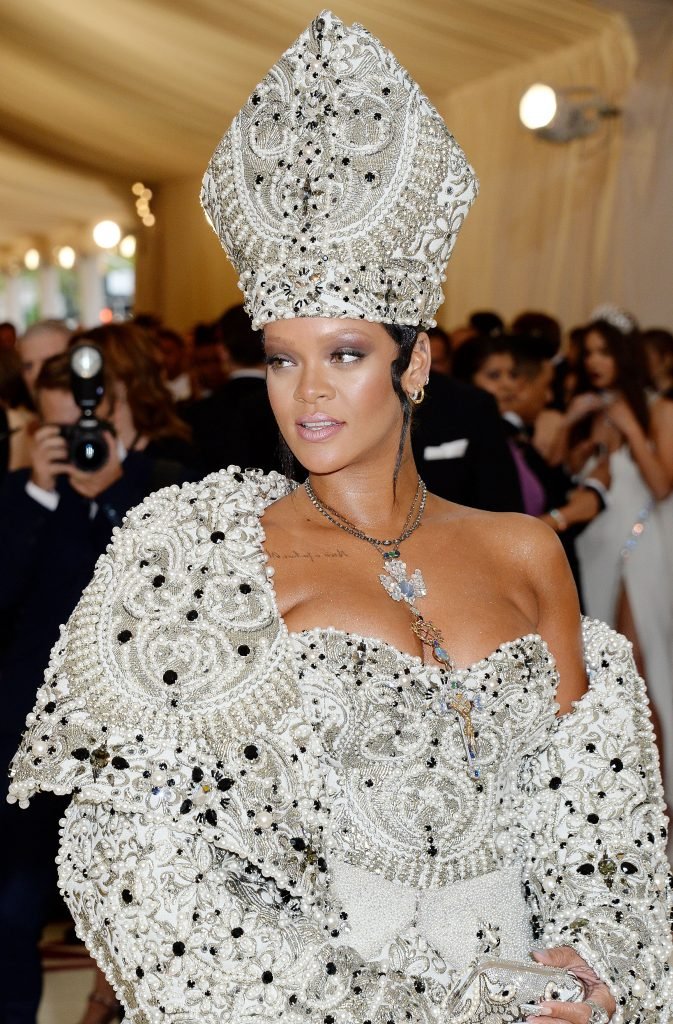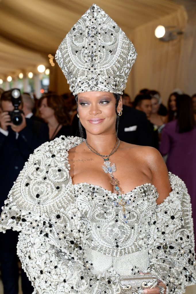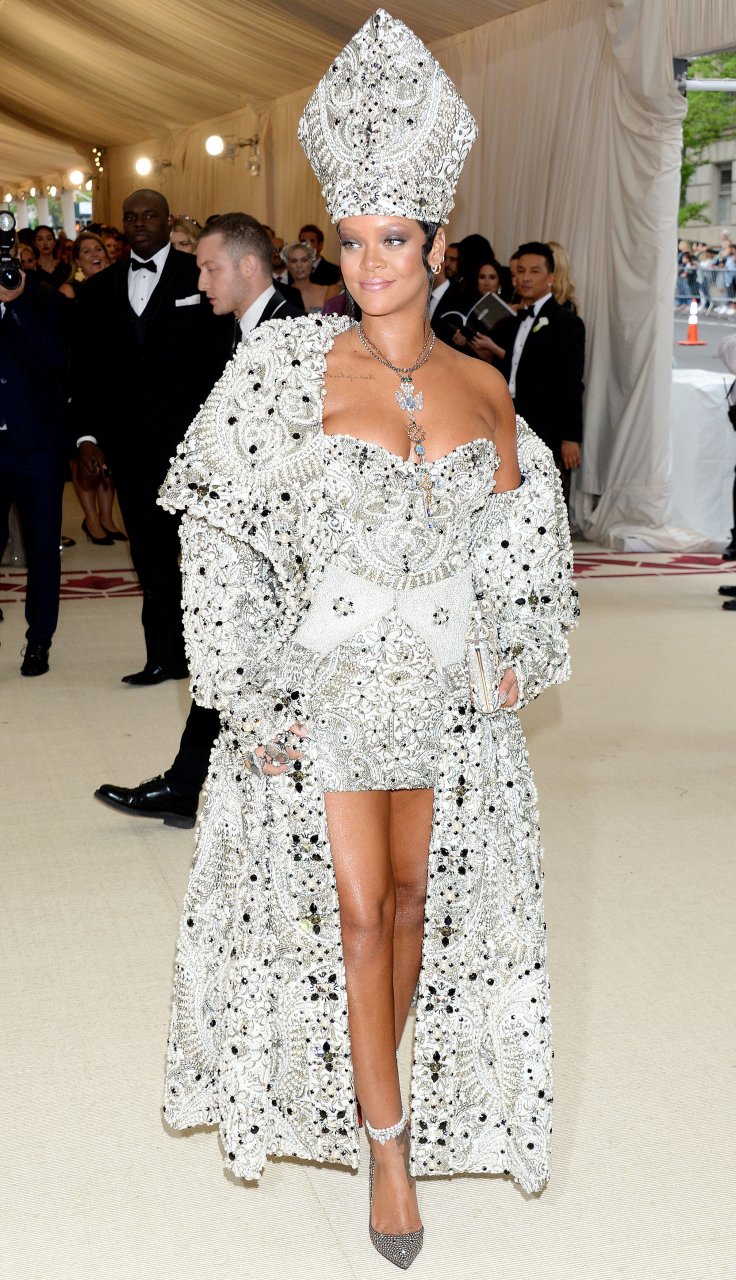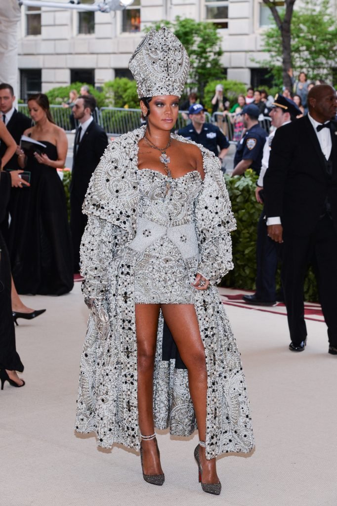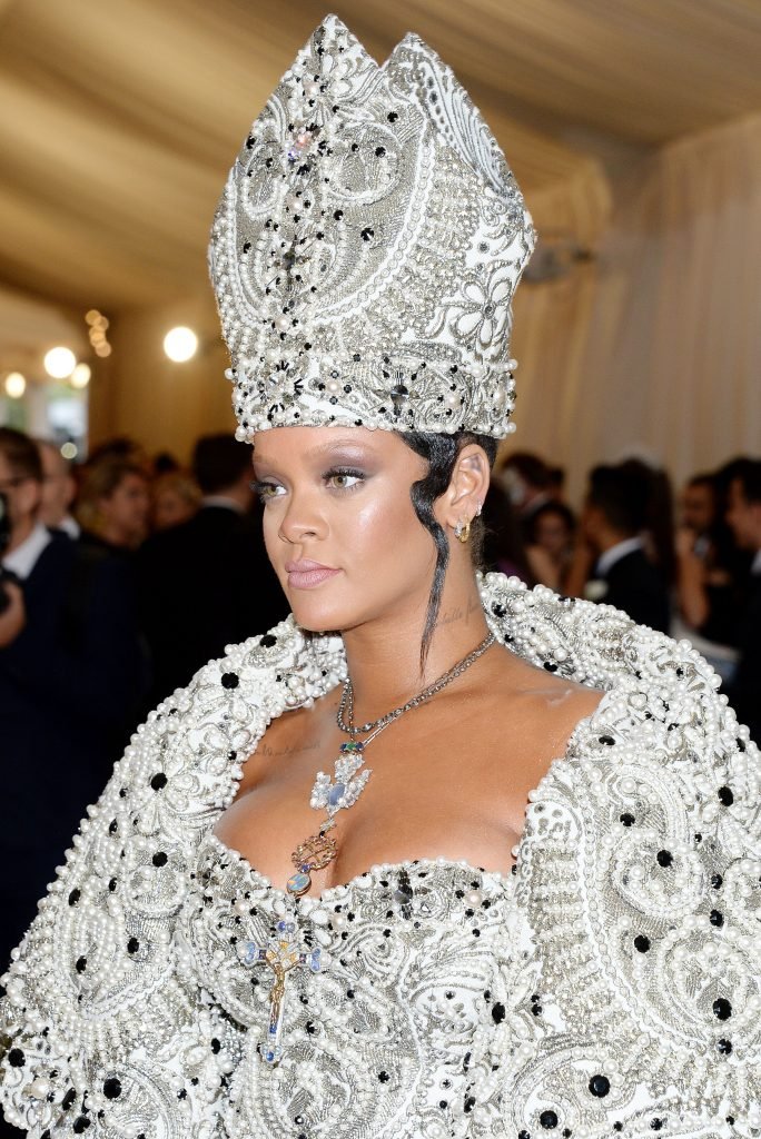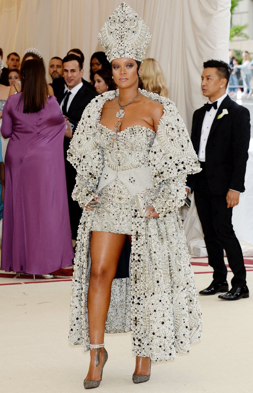 Наряд Рианны стал одним из самых обсуждаемых в социальных сетях — 30-летняя певица пришла на Met Gala в Метрополитен-музее в платье Папы Римского. Выглядит очень мощно.
