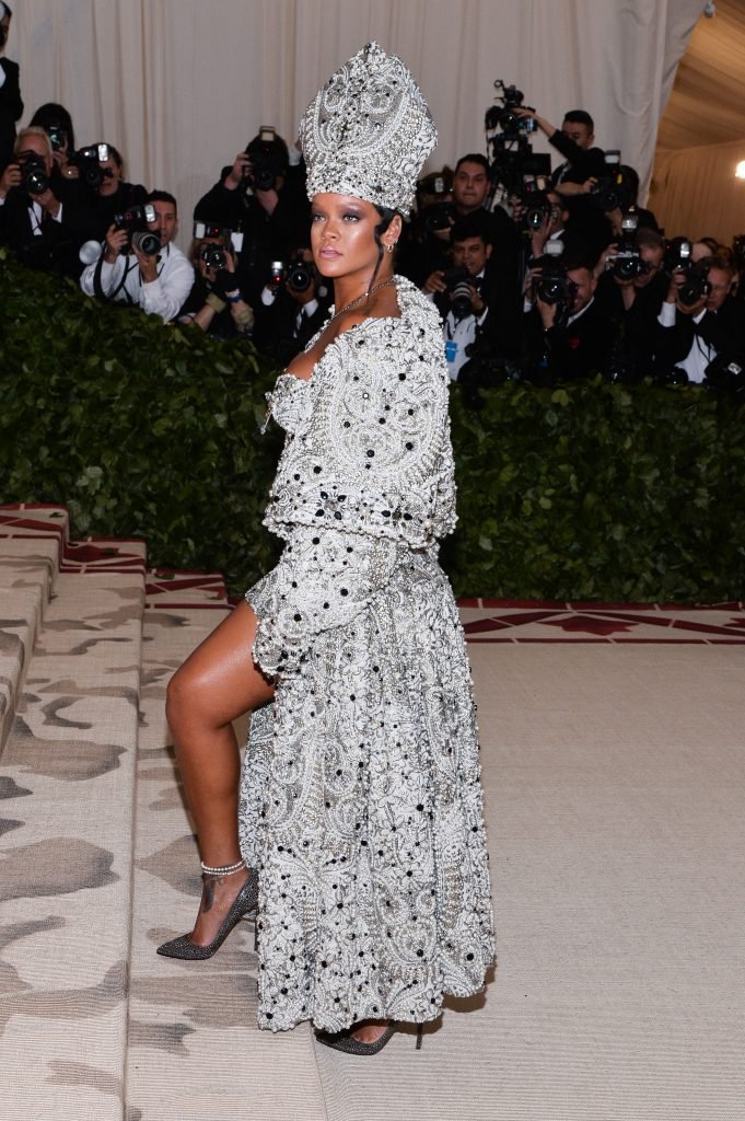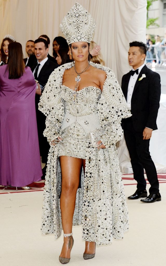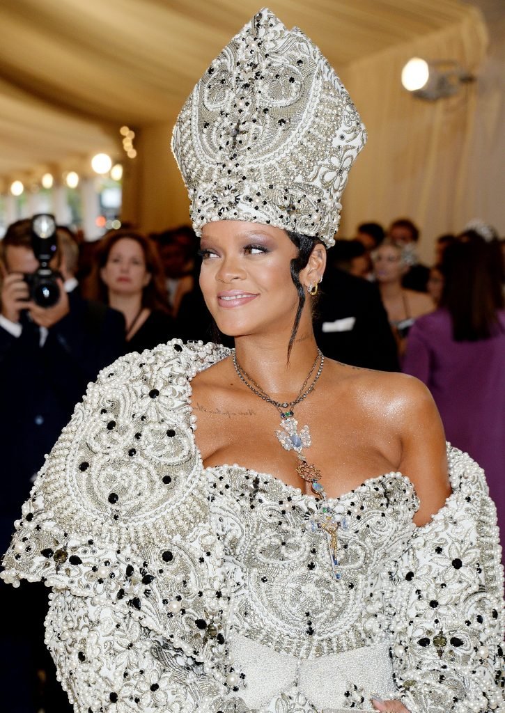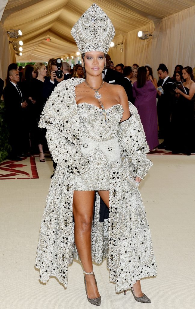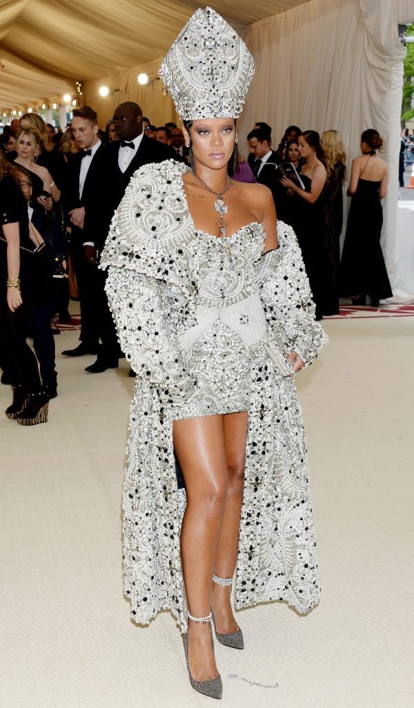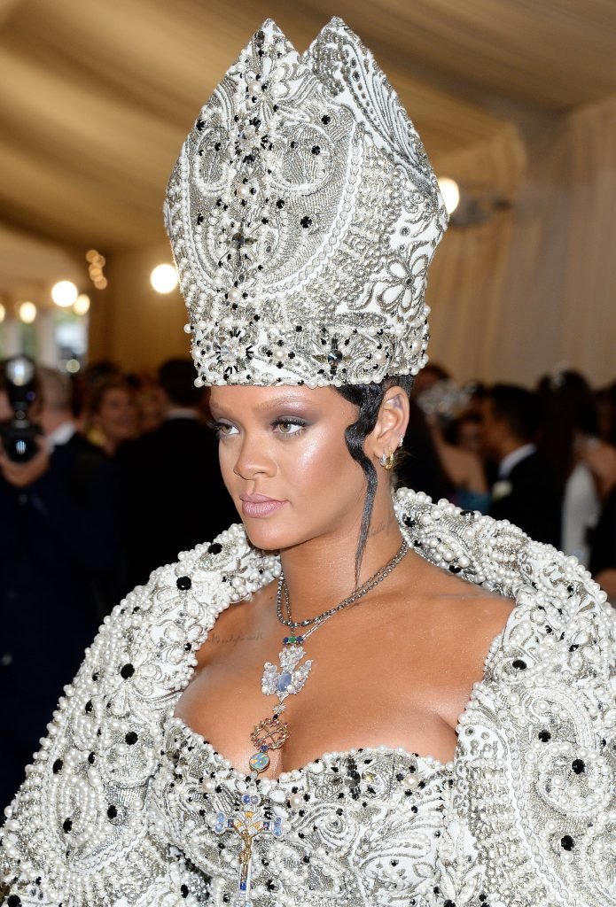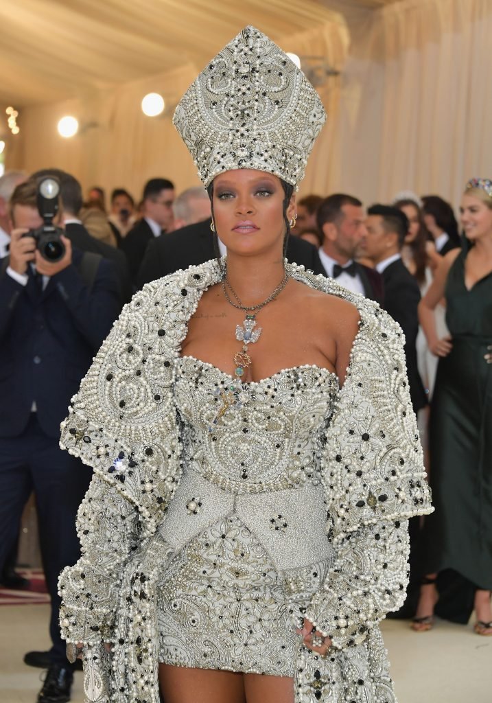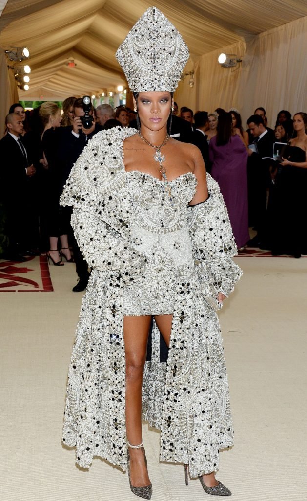 Наряд Рианны стал одним из самых обсуждаемых в социальных сетях — 30-летняя певица пришла на Met Gala в Метрополитен-музее в платье Папы Римского. Выглядит очень мощно.