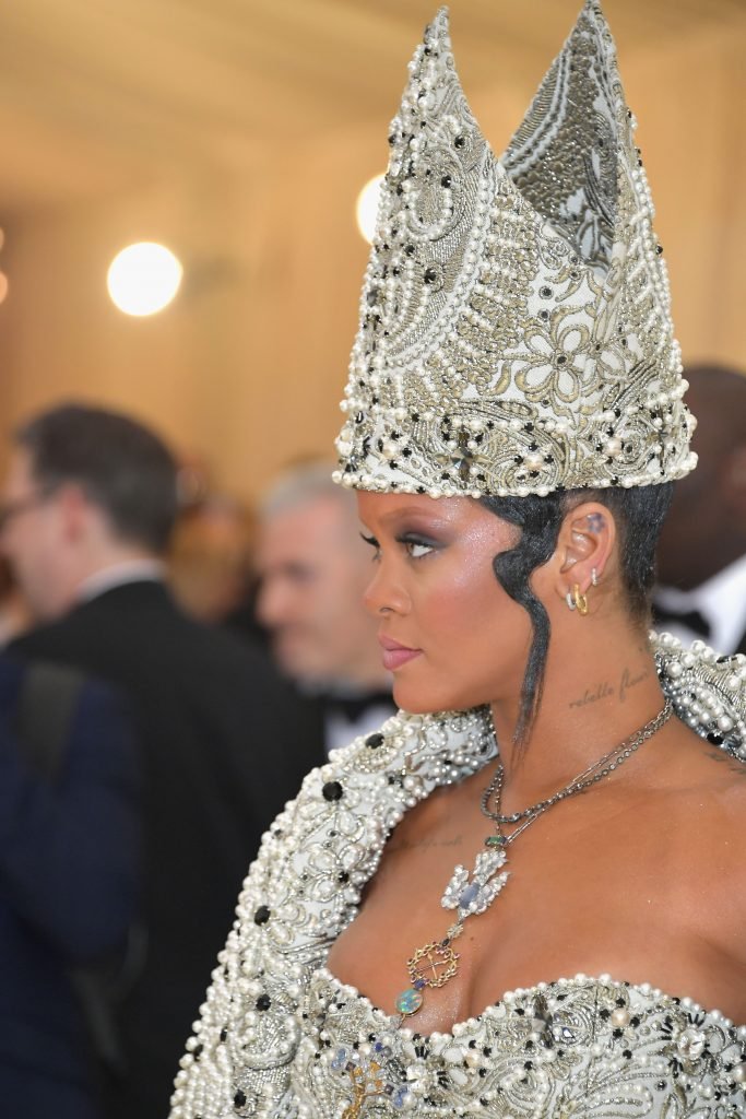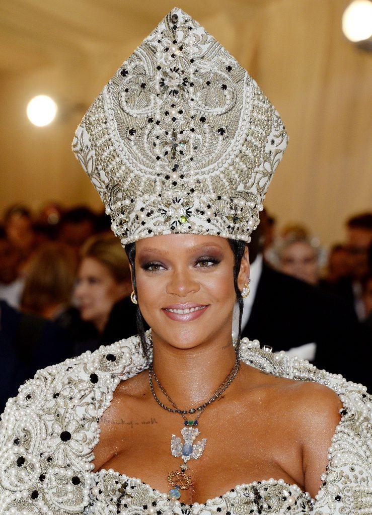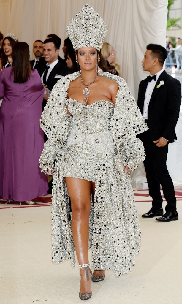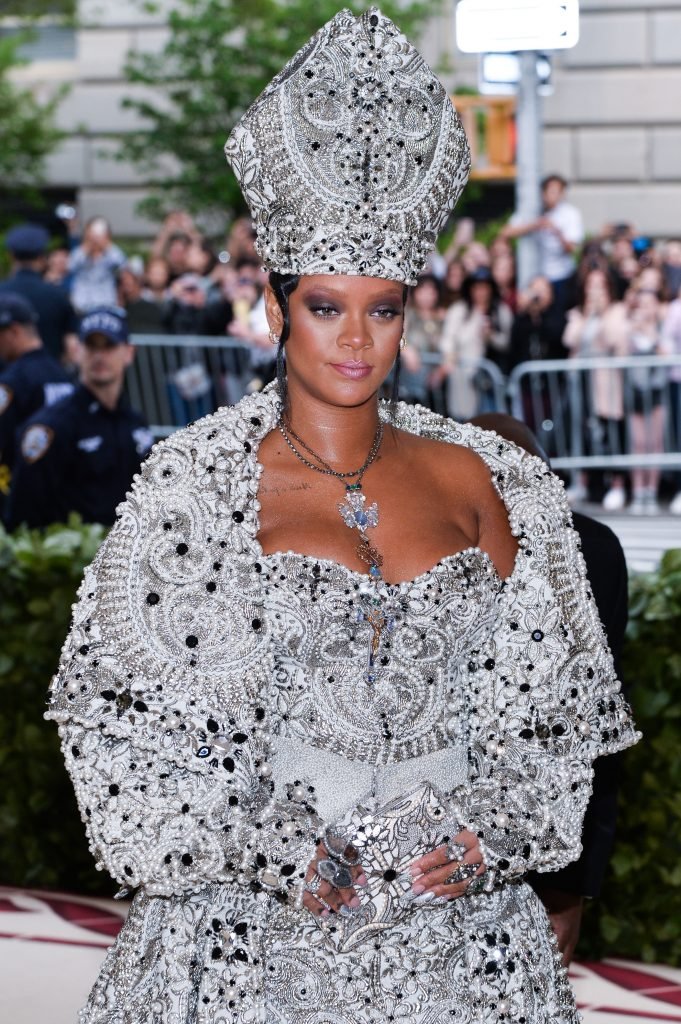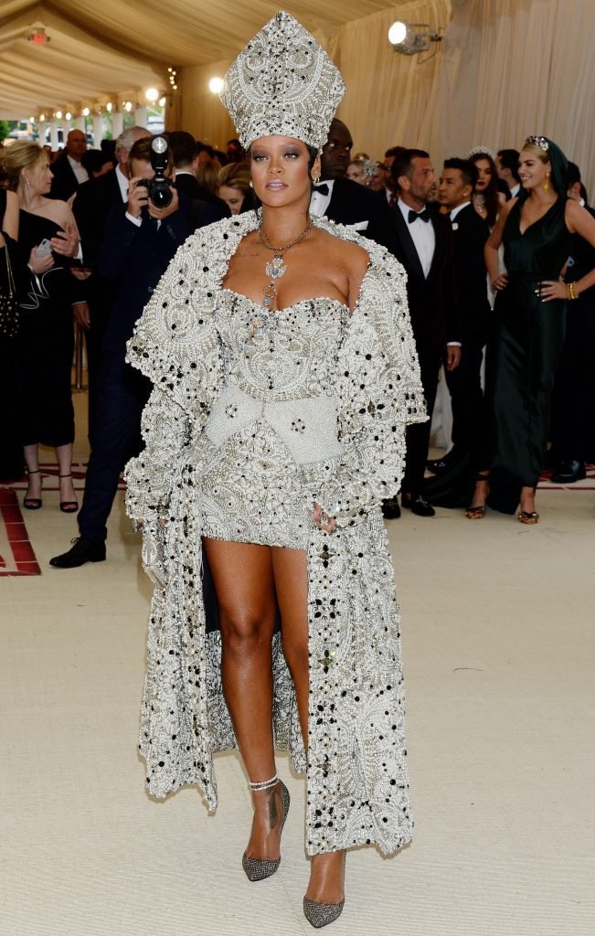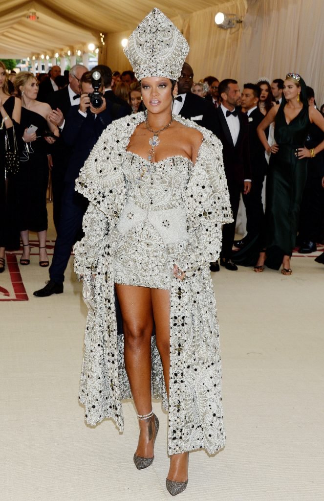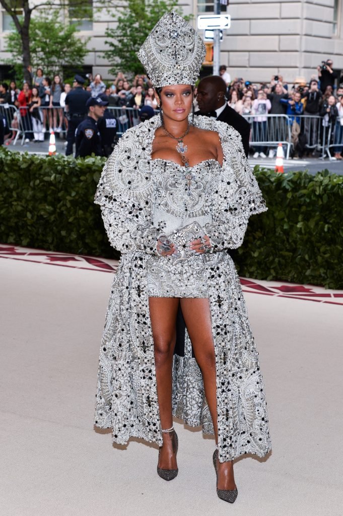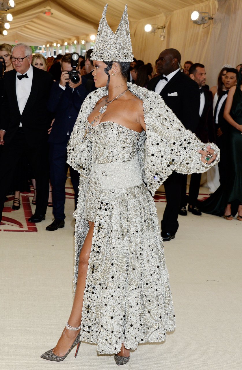 Наряд Рианны стал одним из самых обсуждаемых в социальных сетях — 30-летняя певица пришла на Met Gala в Метрополитен-музее в платье Папы Римского. Выглядит очень мощно.
