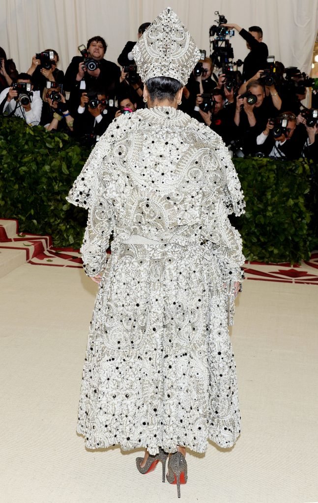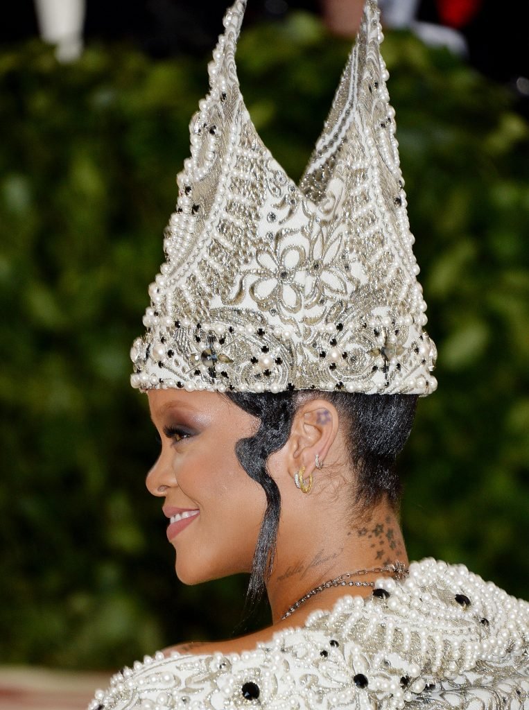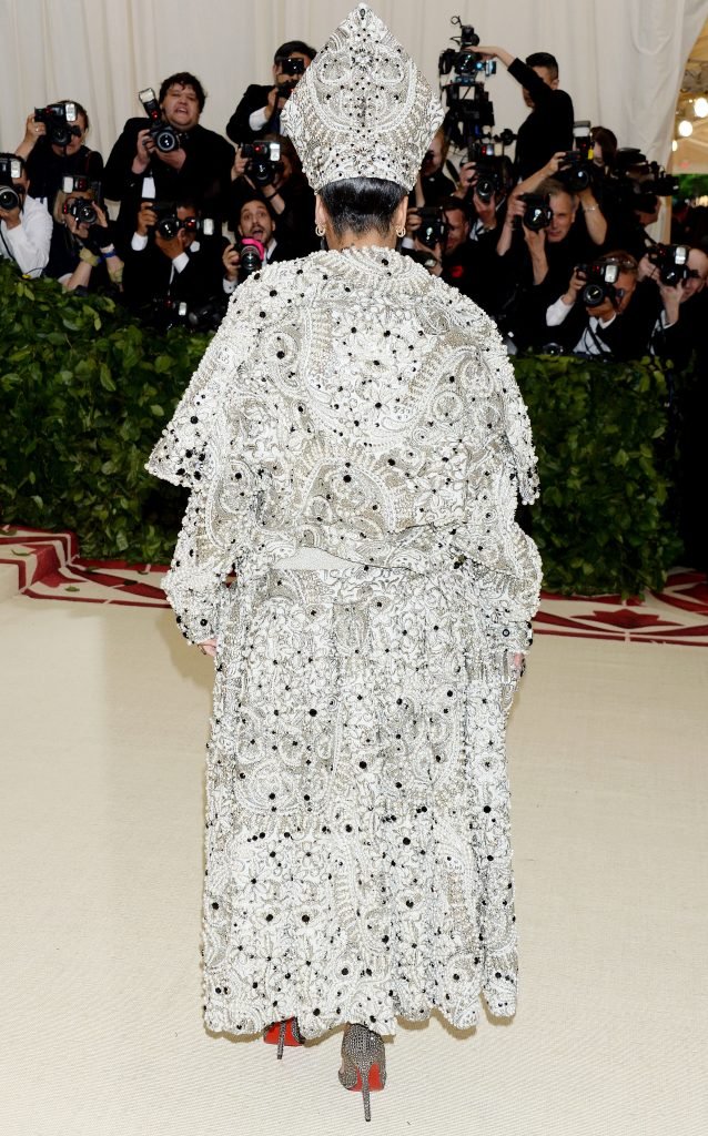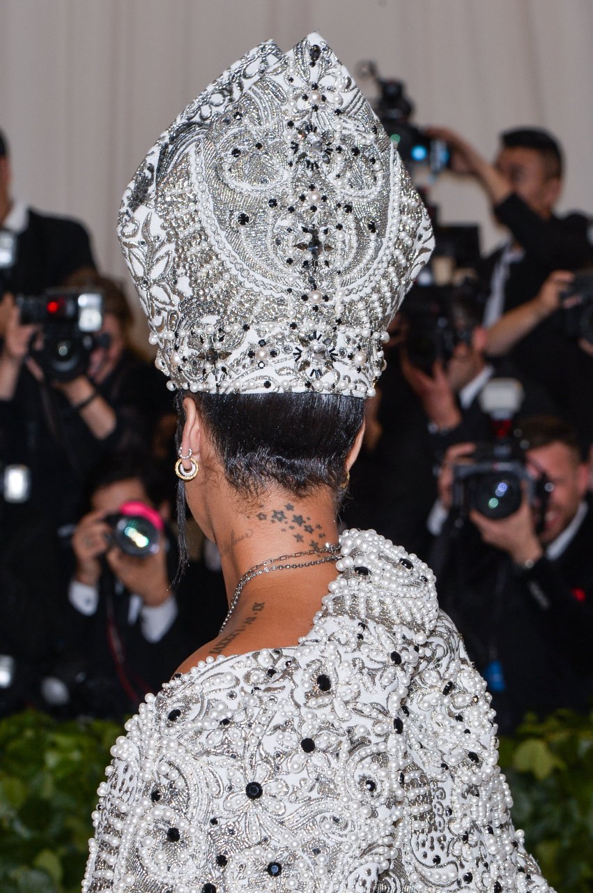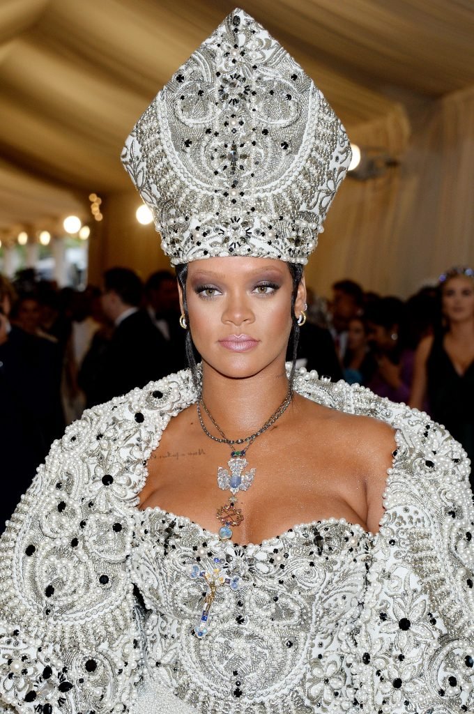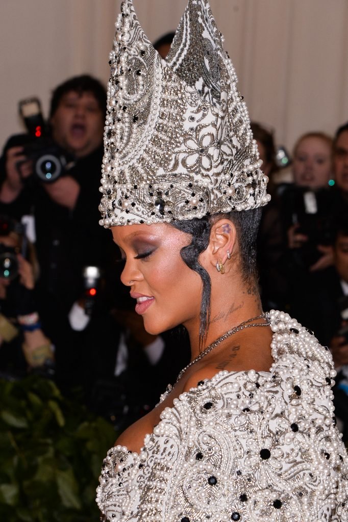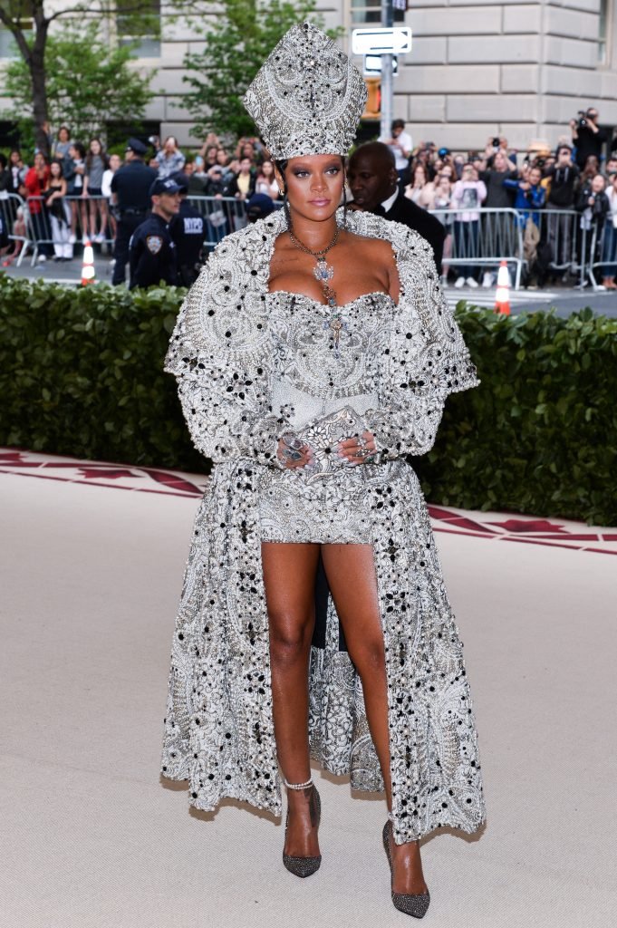 Наряд Рианны стал одним из самых обсуждаемых в социальных сетях — 30-летняя певица пришла на Met Gala в Метрополитен-музее в платье Папы Римского. Выглядит очень мощно.