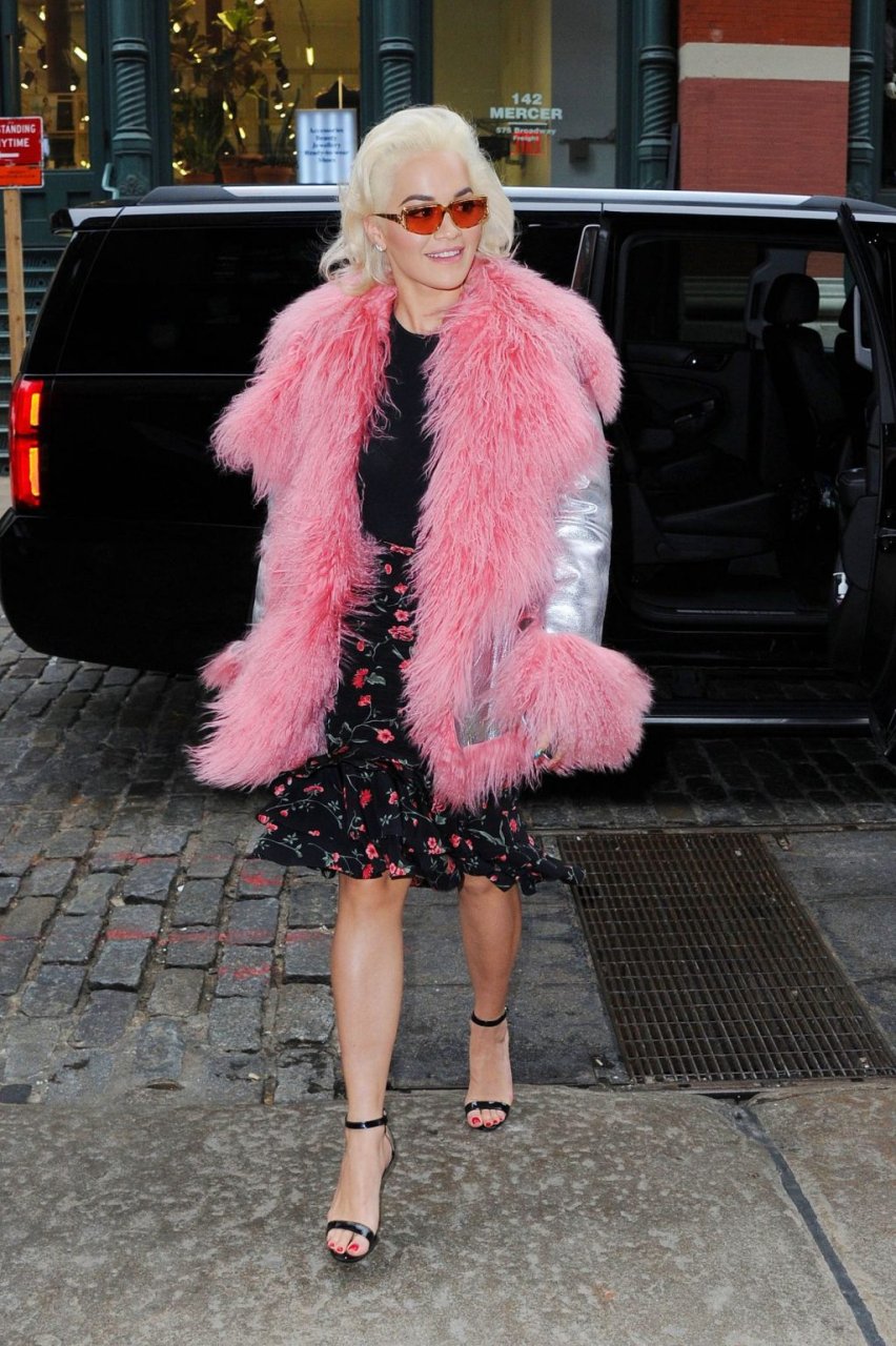 Рита Ора запечатлена после смены наряда в Нью-Йорке, 25.03.2019. 28-летняя актриса и певица была одета в серебристо-розовую куртку, черный топ, цветочную юбку и туфли на каблуках.