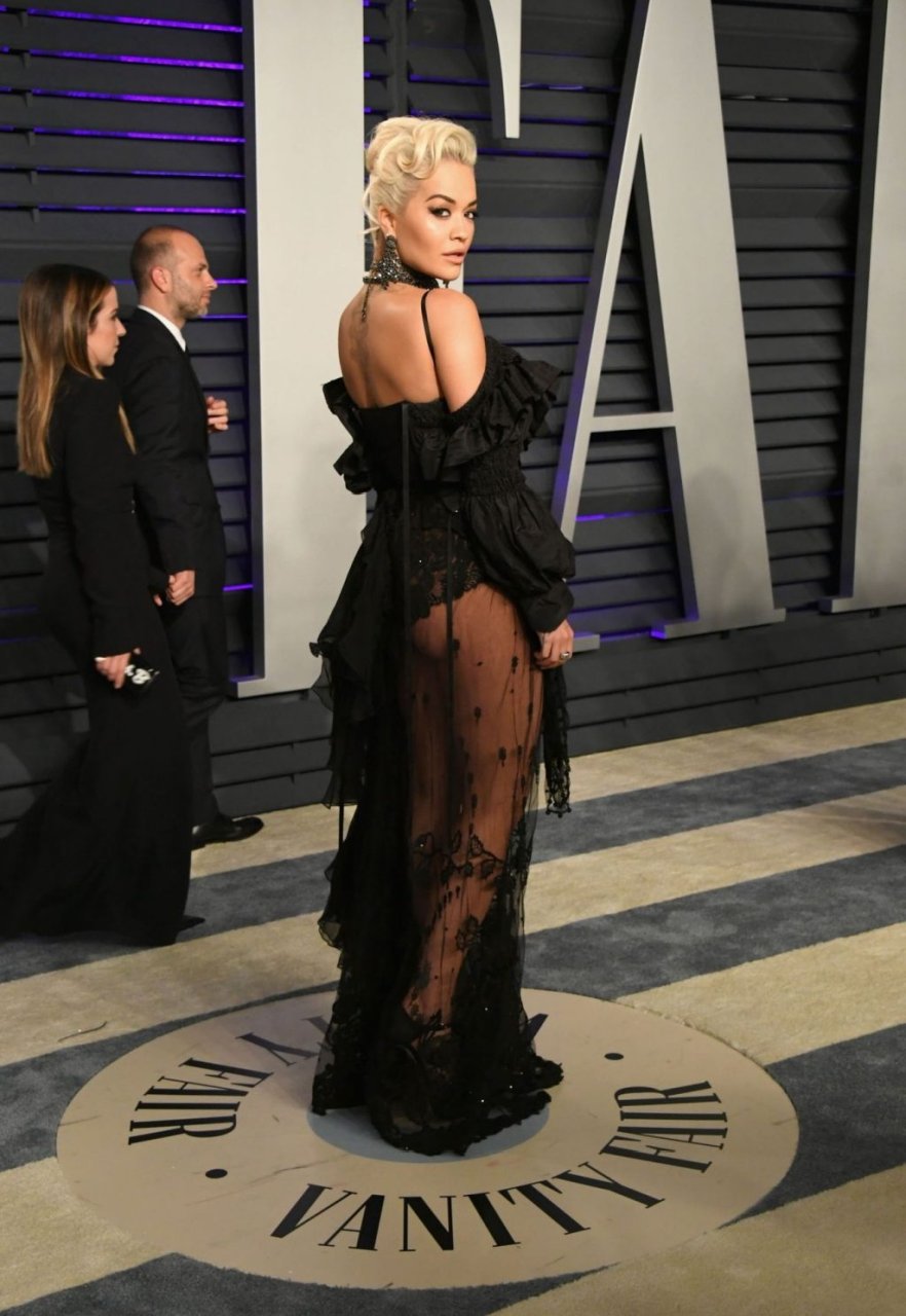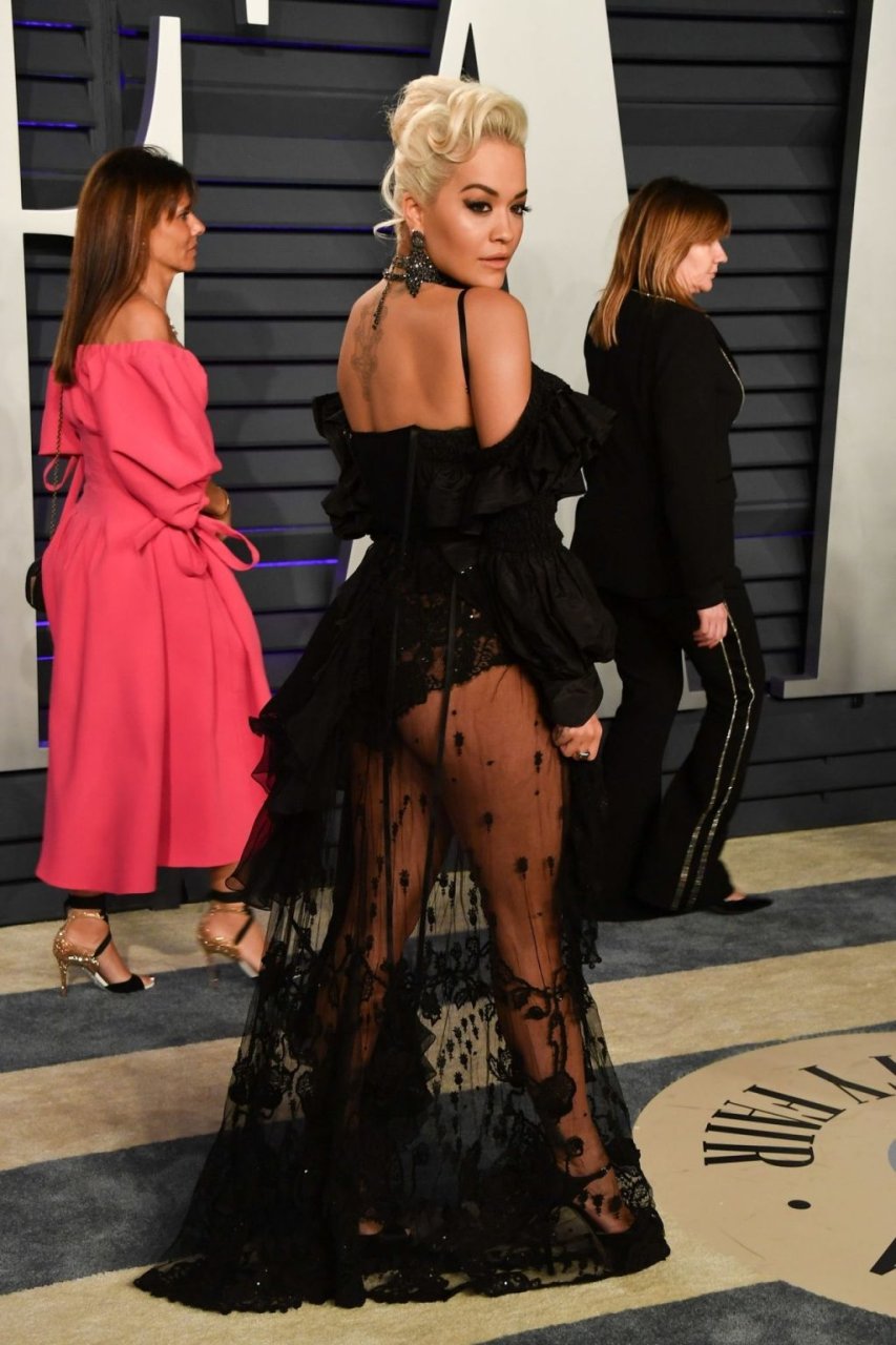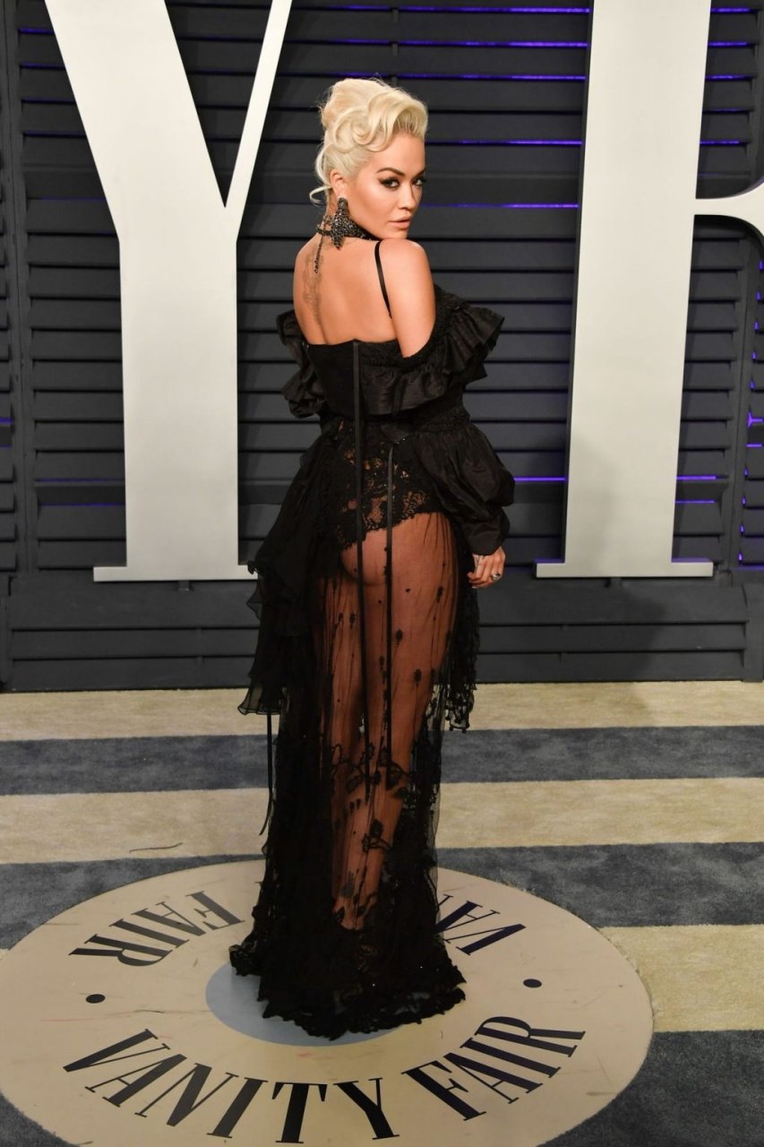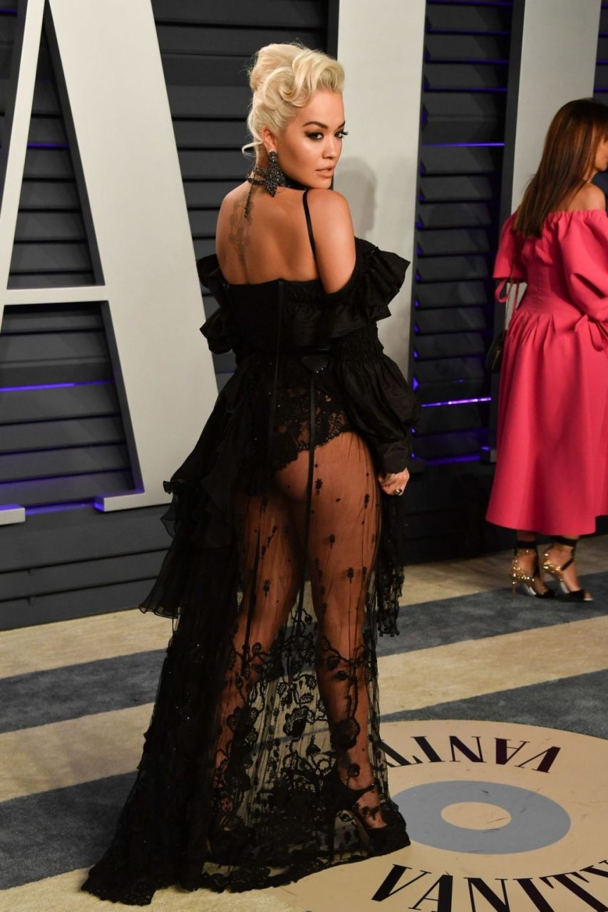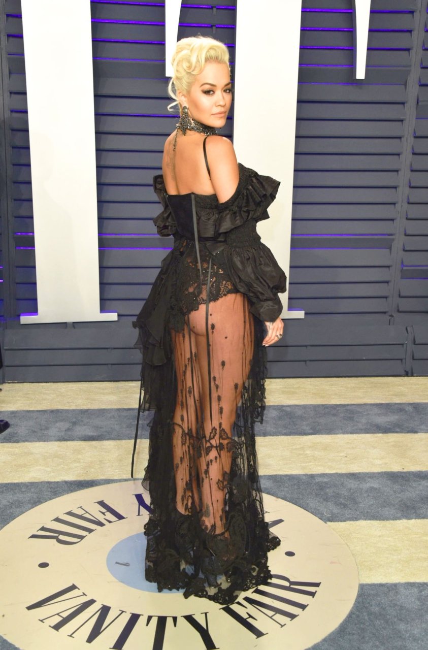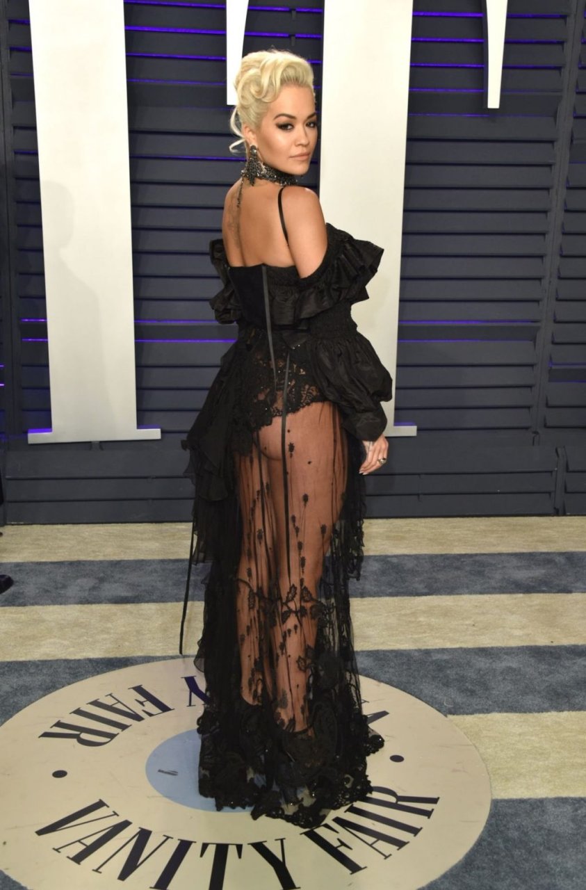 Суперзвезда Рита Ора демонстрирует декольте и ягодицы в черном платье с кружевным нижним бельем на вечеринке Vanity Fair Oscar 2019 в Беверли-Хиллз, 24.02.2019.
