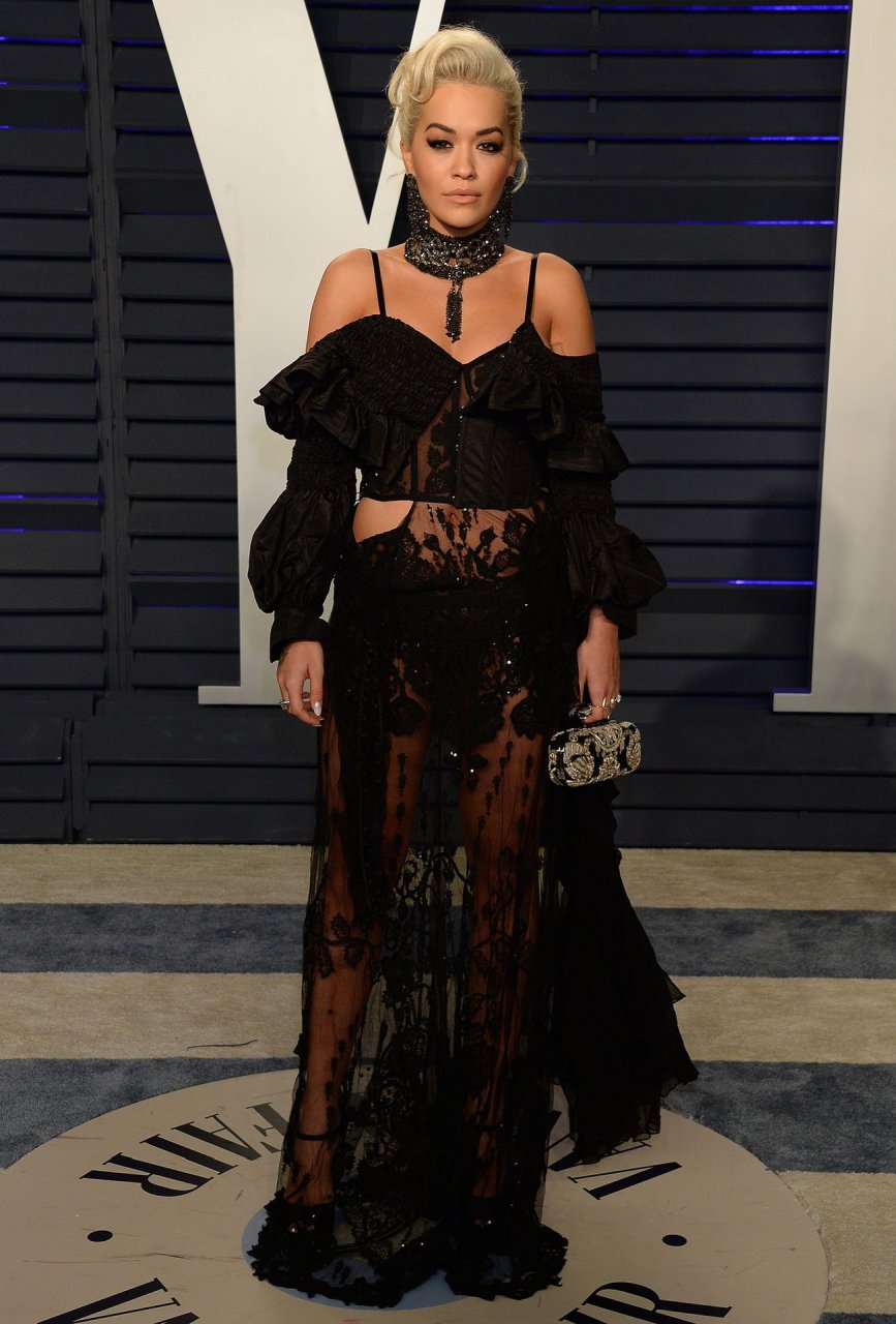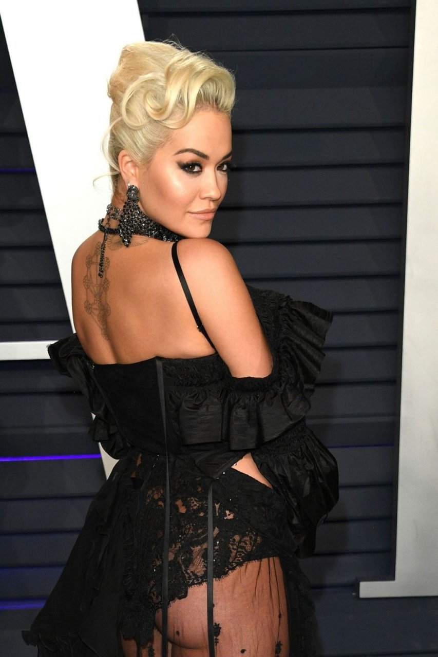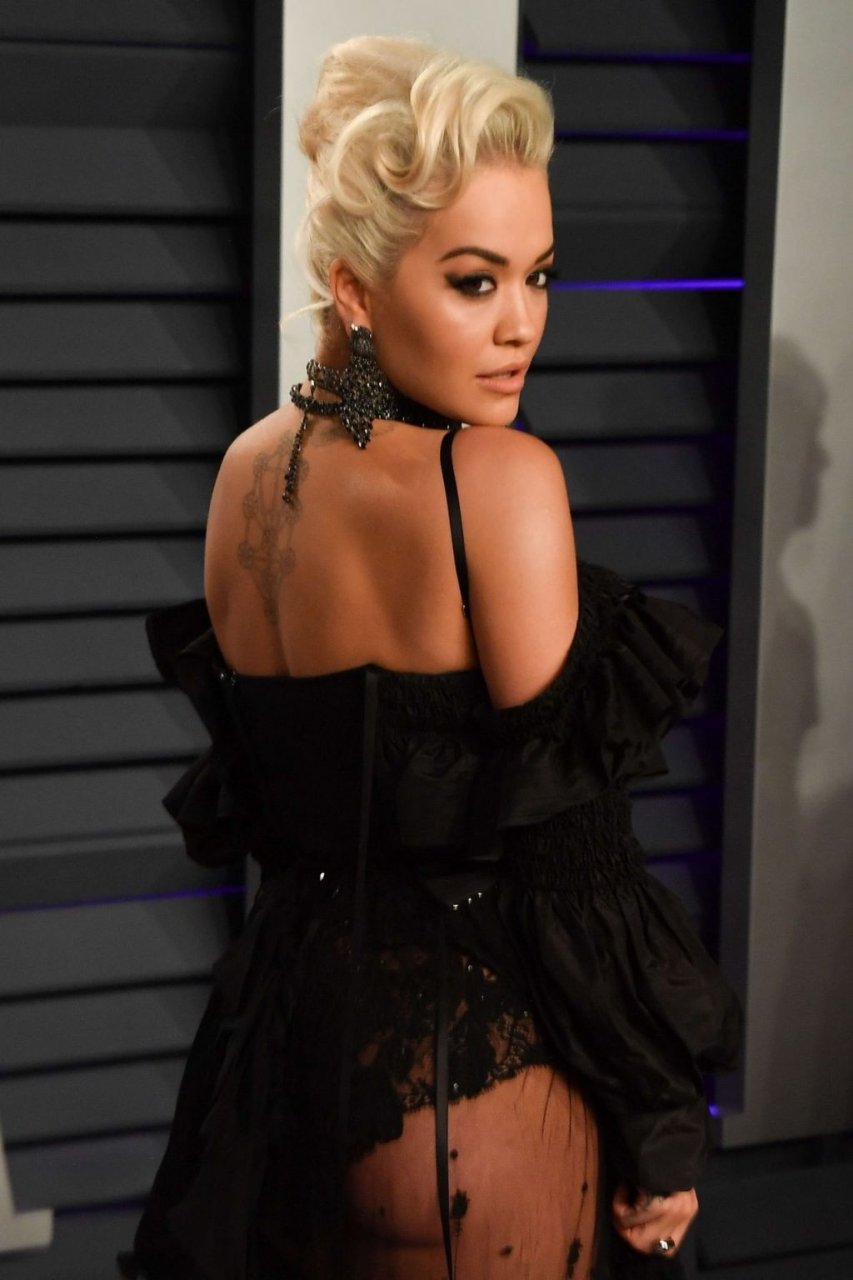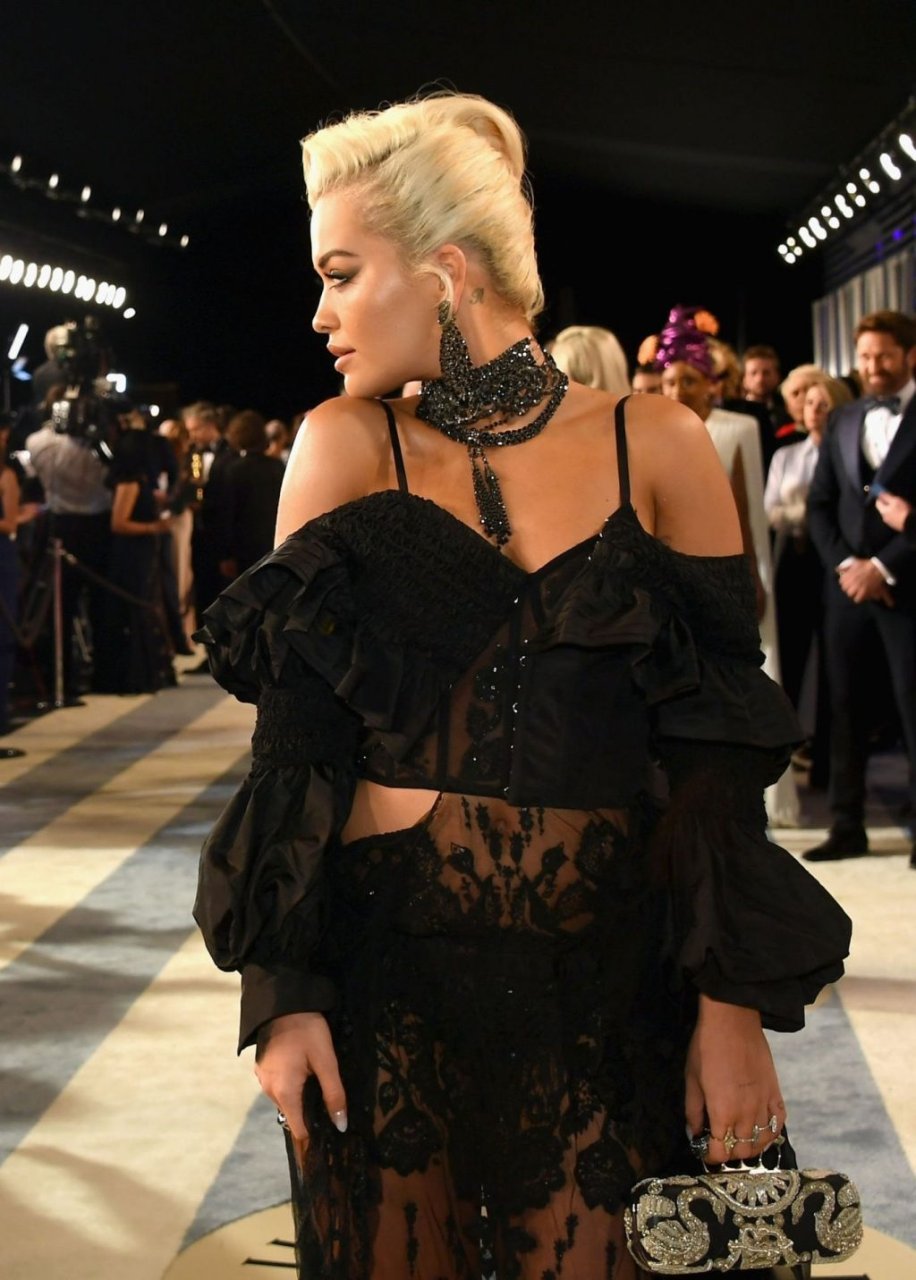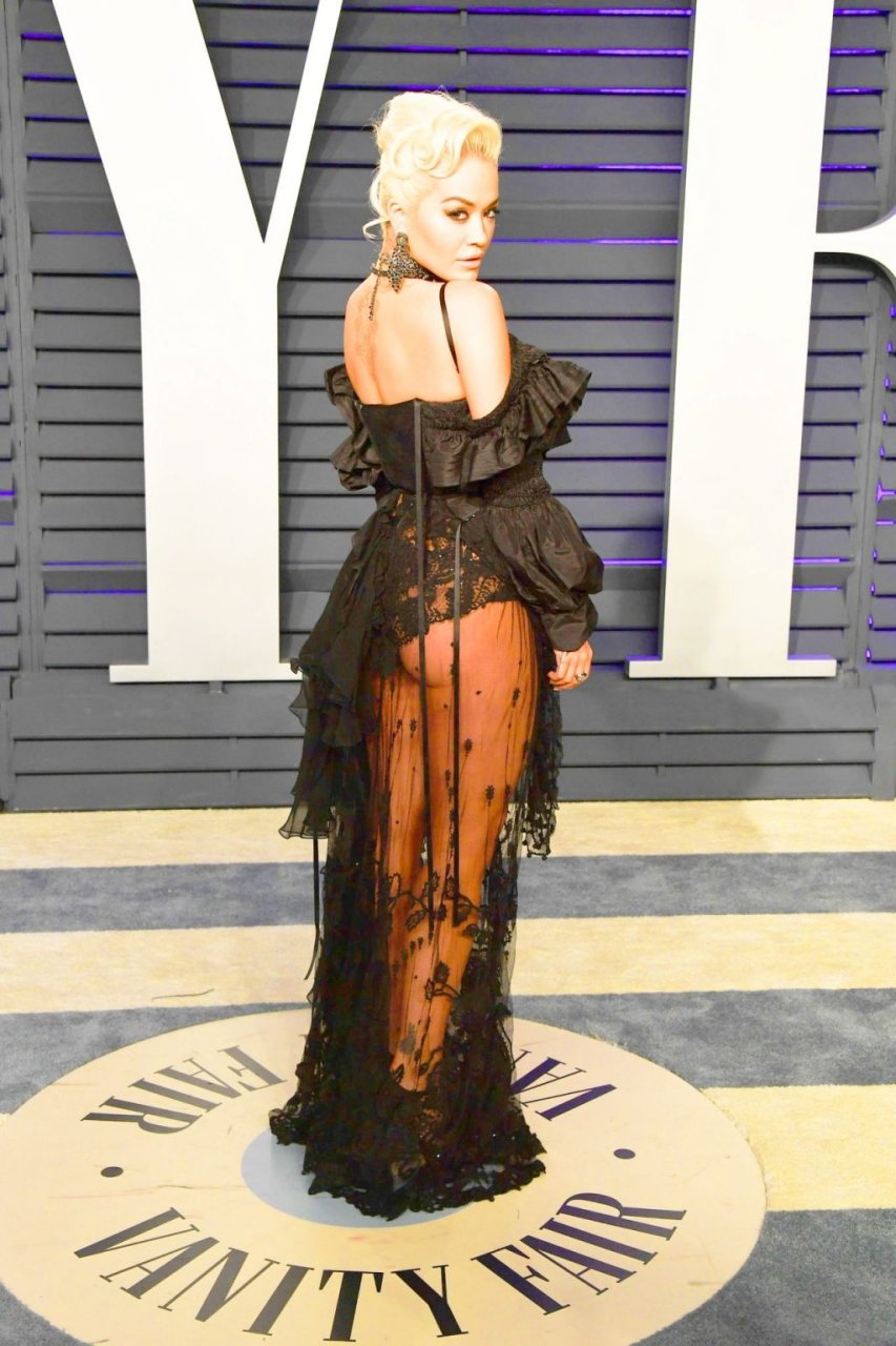 Суперзвезда Рита Ора демонстрирует декольте и ягодицы в черном платье с кружевным нижним бельем на вечеринке Vanity Fair Oscar 2019 в Беверли-Хиллз, 24.02.2019.