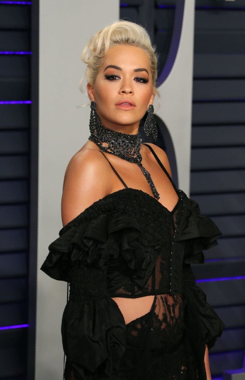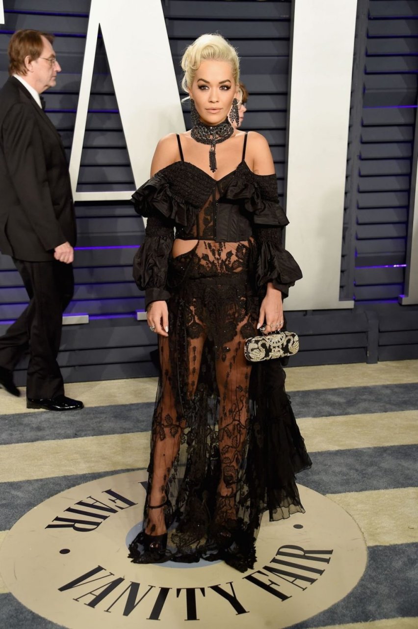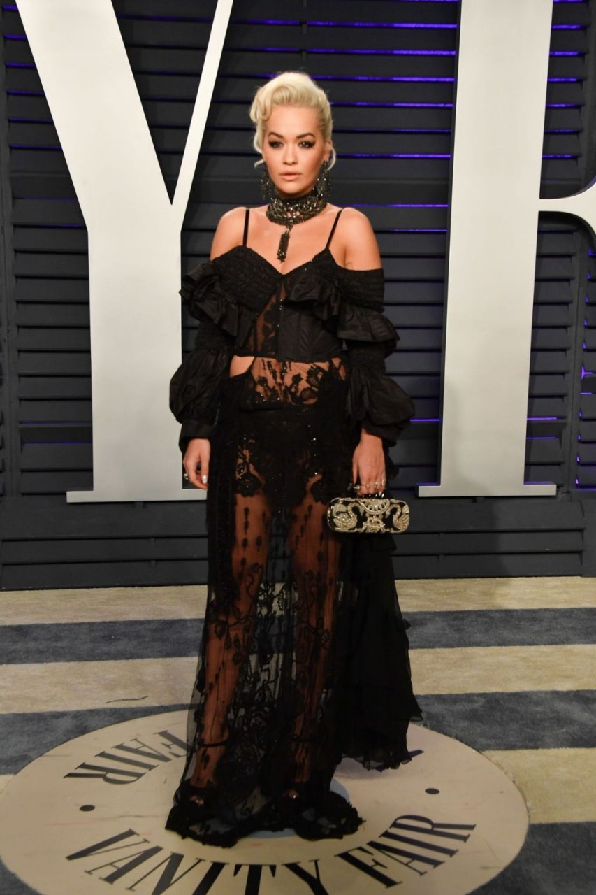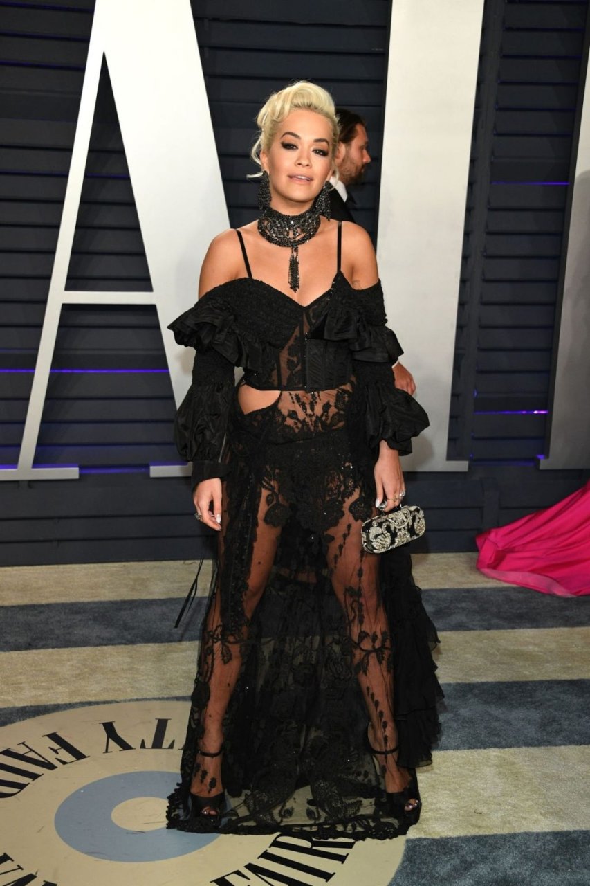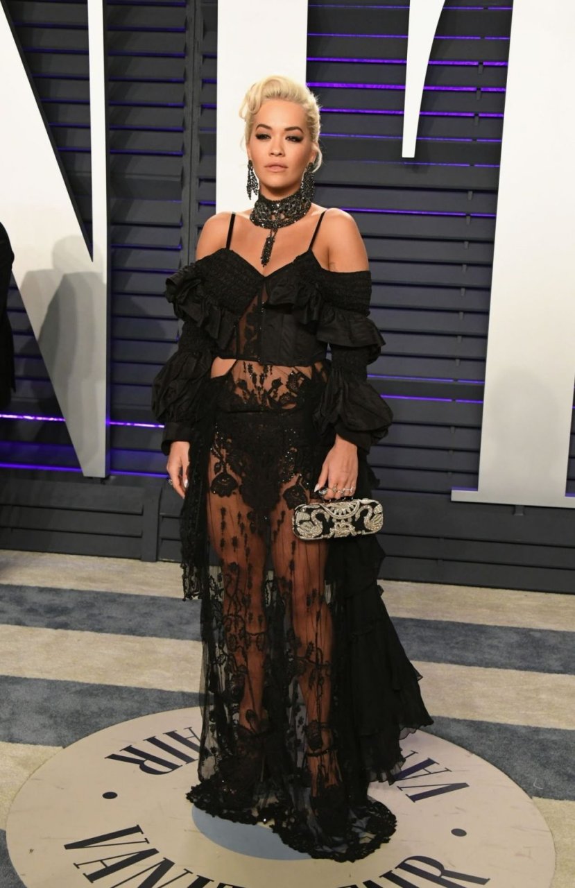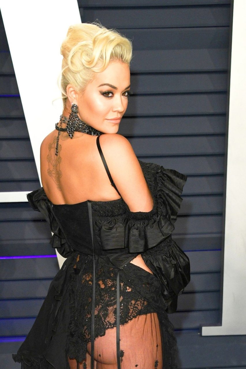 Суперзвезда Рита Ора демонстрирует декольте и ягодицы в черном платье с кружевным нижним бельем на вечеринке Vanity Fair Oscar 2019 в Беверли-Хиллз, 24.02.2019.