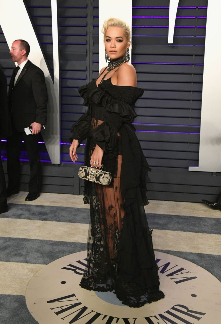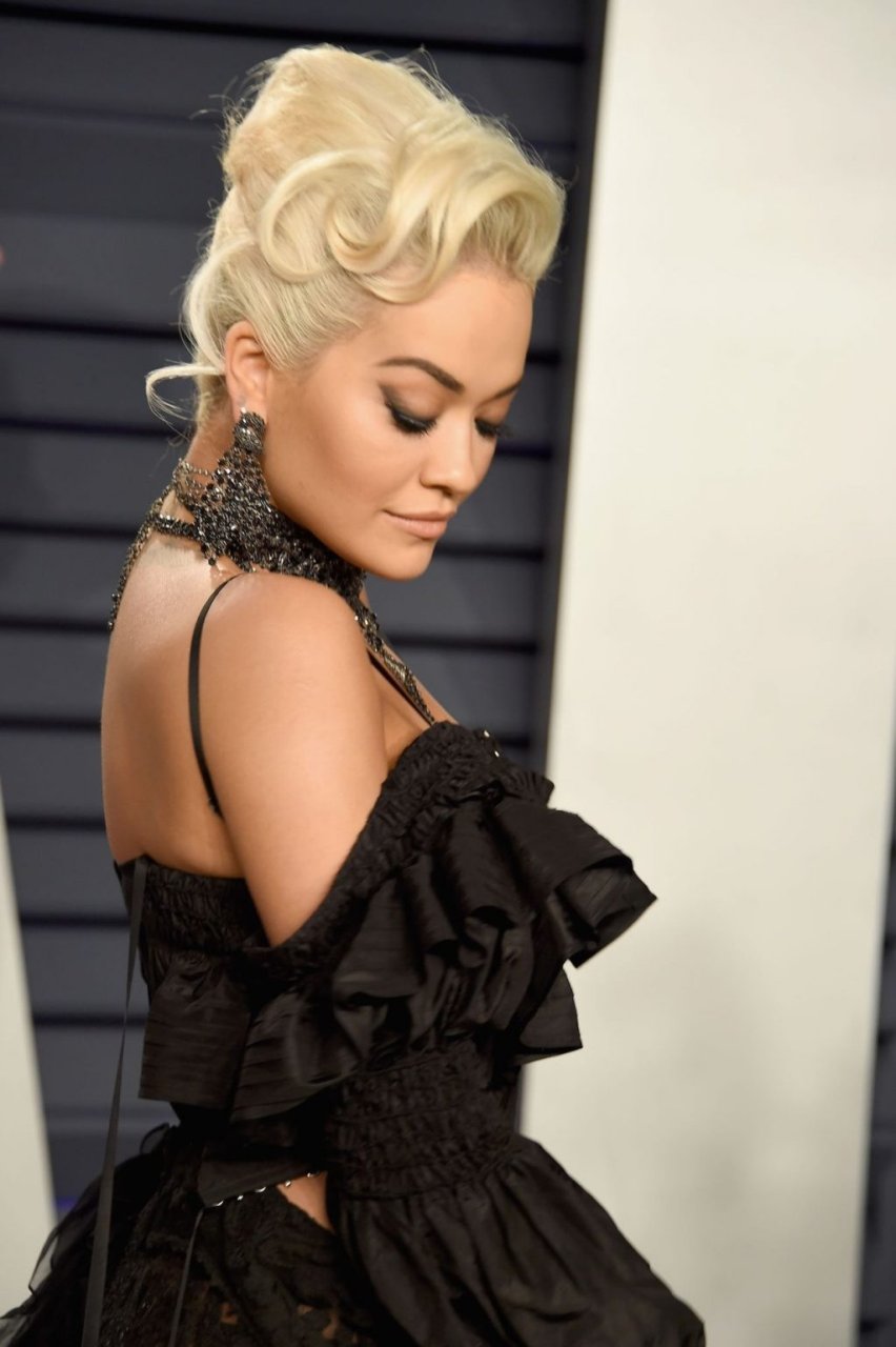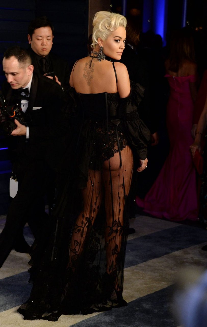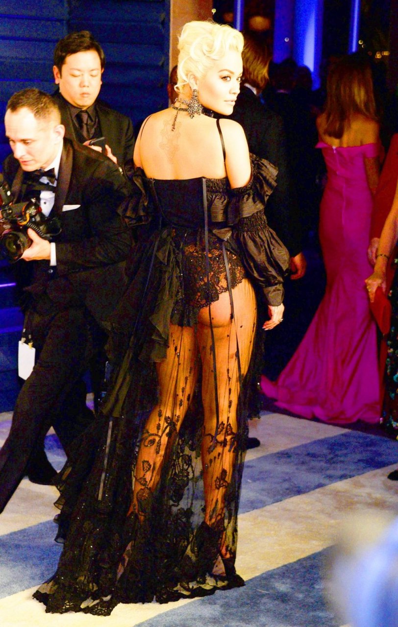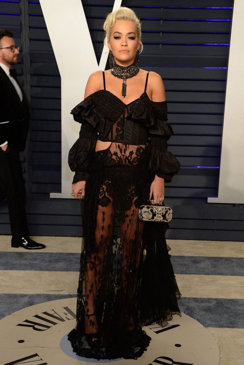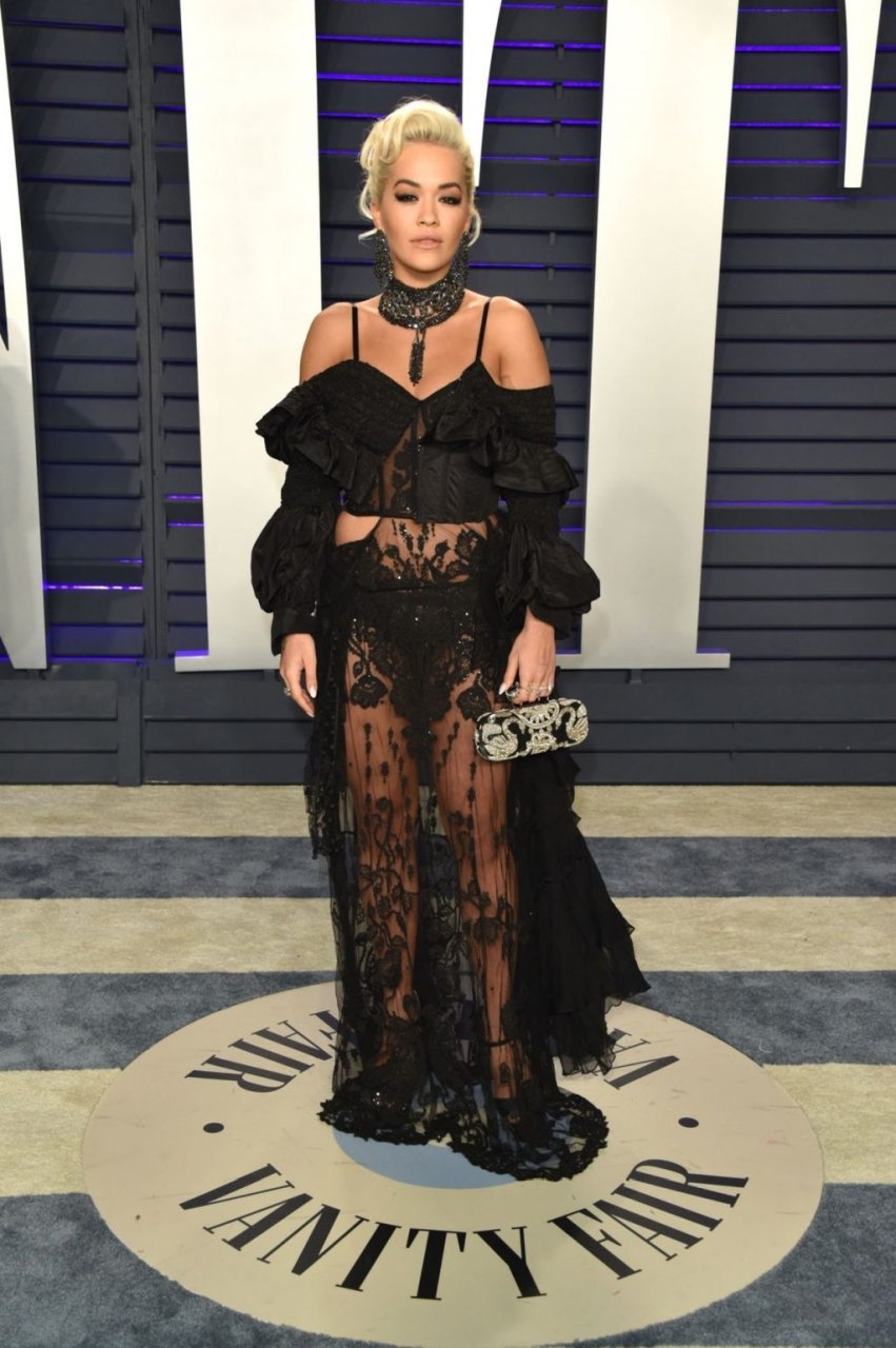 Суперзвезда Рита Ора демонстрирует декольте и ягодицы в черном платье с кружевным нижним бельем на вечеринке Vanity Fair Oscar 2019 в Беверли-Хиллз, 24.02.2019.