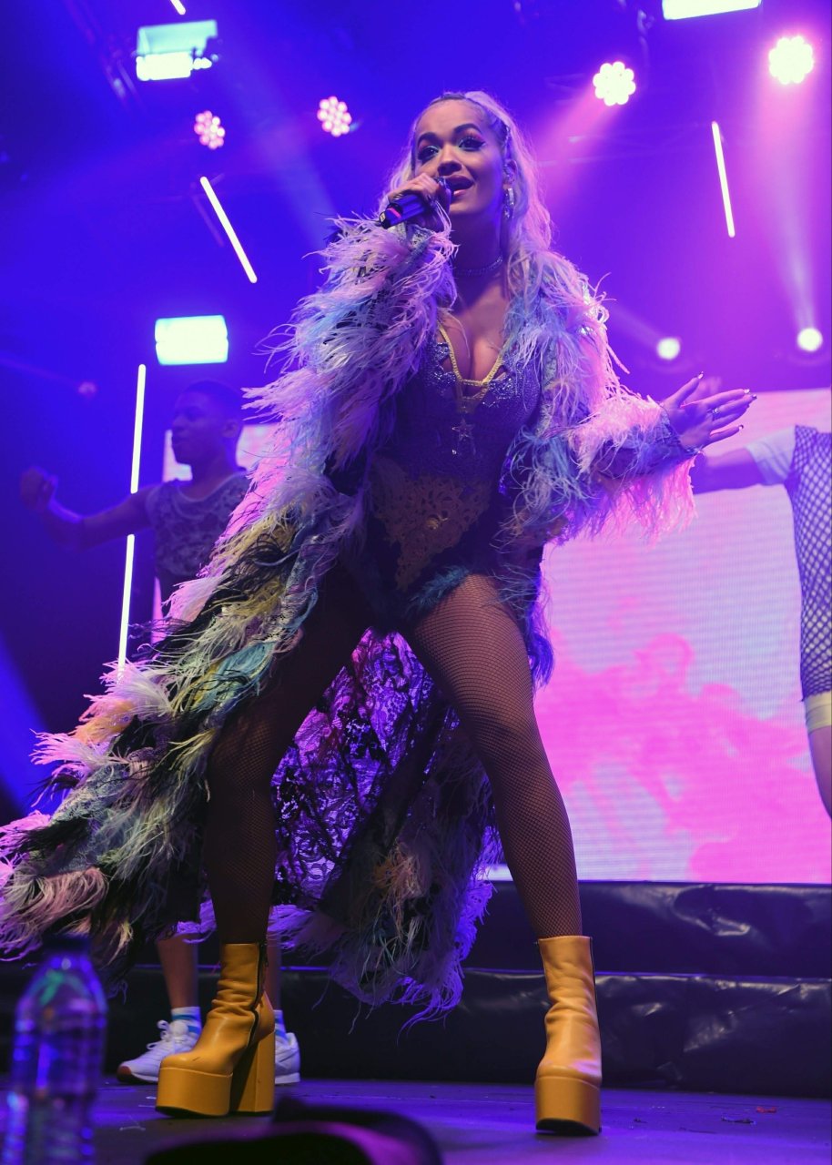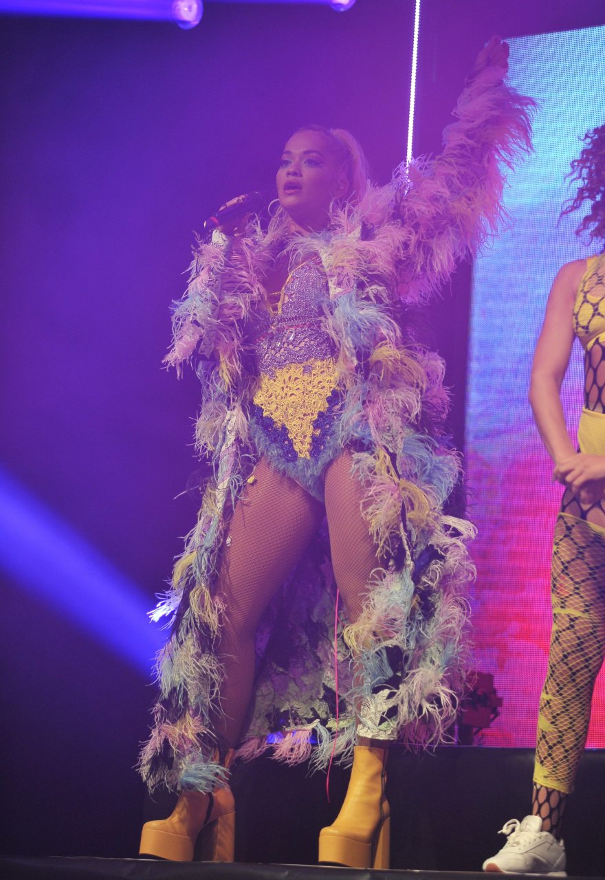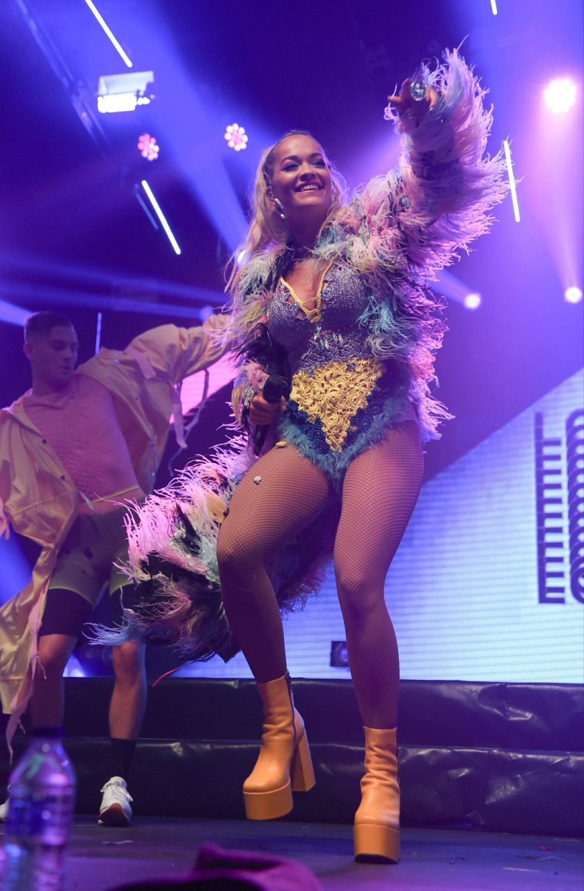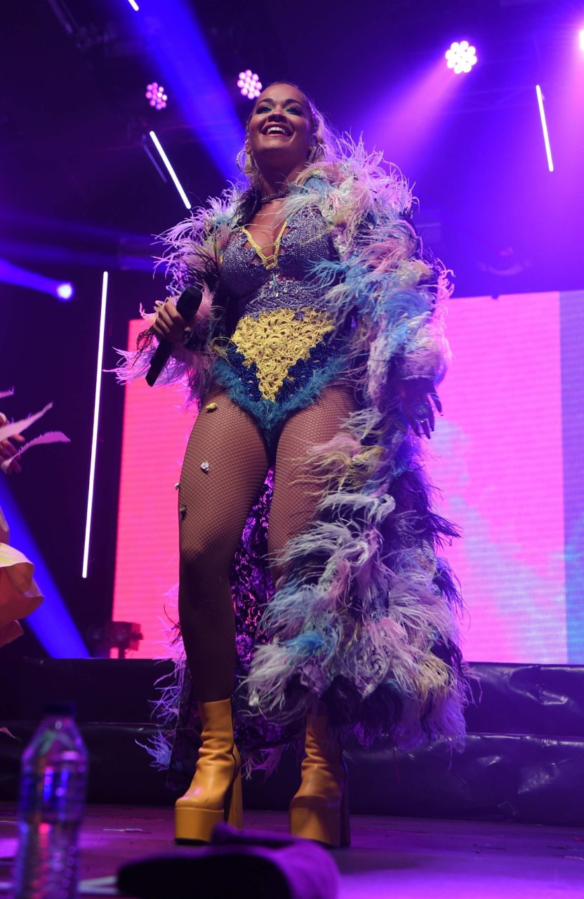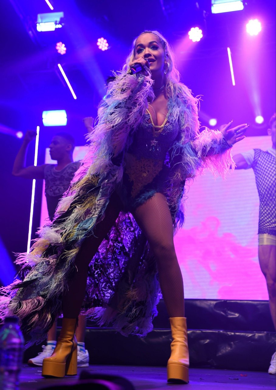 Рита Ора выступает на Главной сцене на Big Weekend Manchester Pride 2018 в Лондоне, 26.08.2018. 27-летняя британская певица выбрала наряд с перьями и сетчатыми колготками.