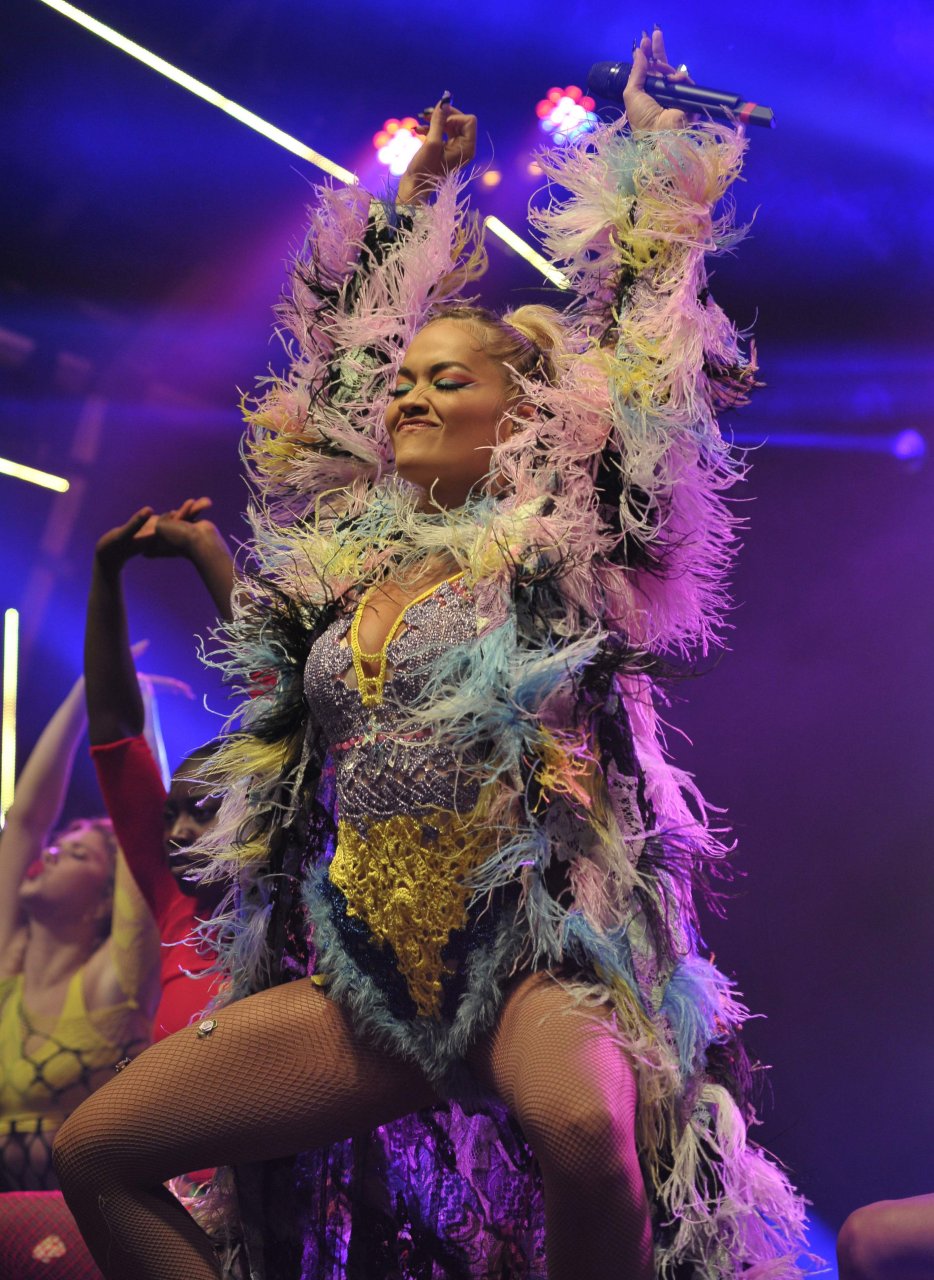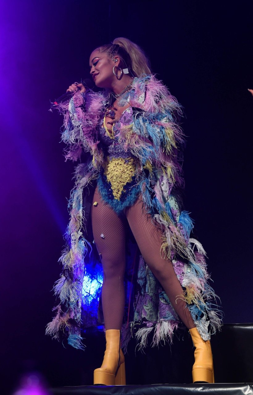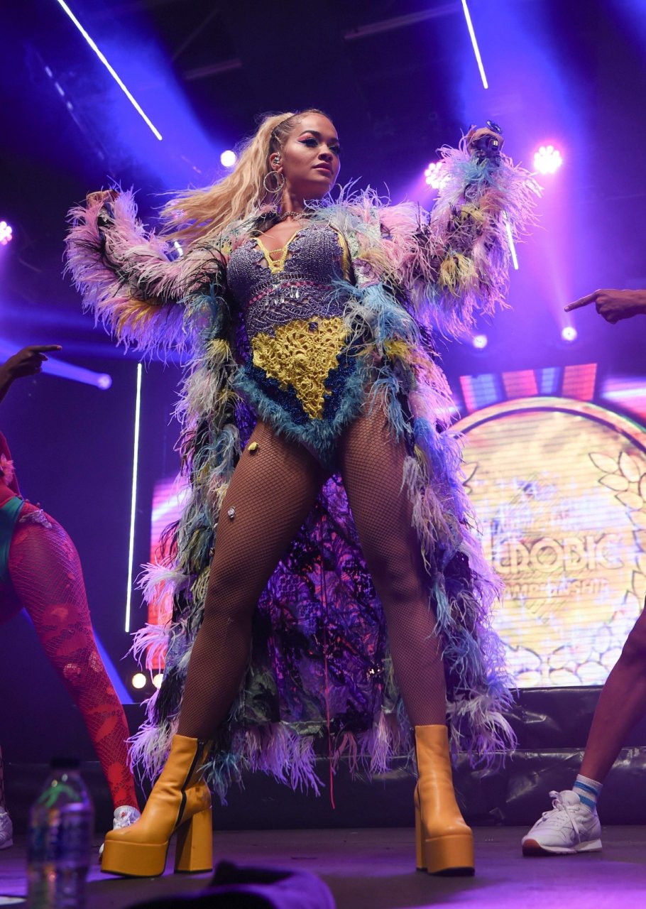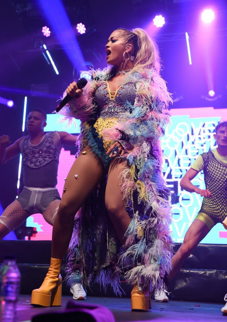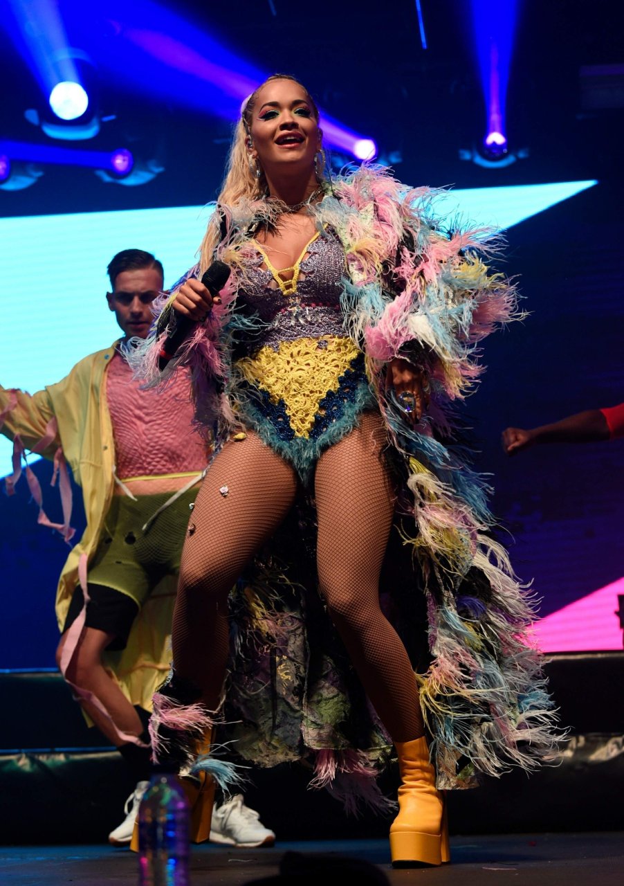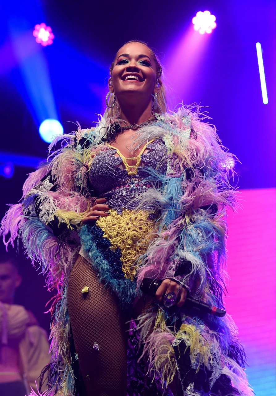 Рита Ора выступает на Главной сцене на Big Weekend Manchester Pride 2018 в Лондоне, 26.08.2018. 27-летняя британская певица выбрала наряд с перьями и сетчатыми колготками.