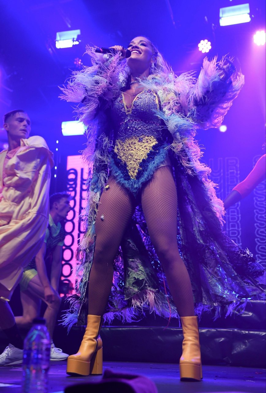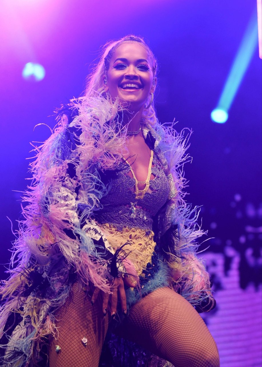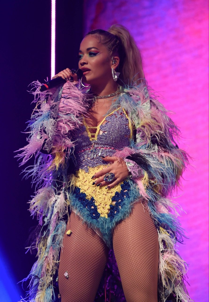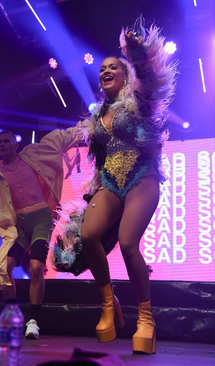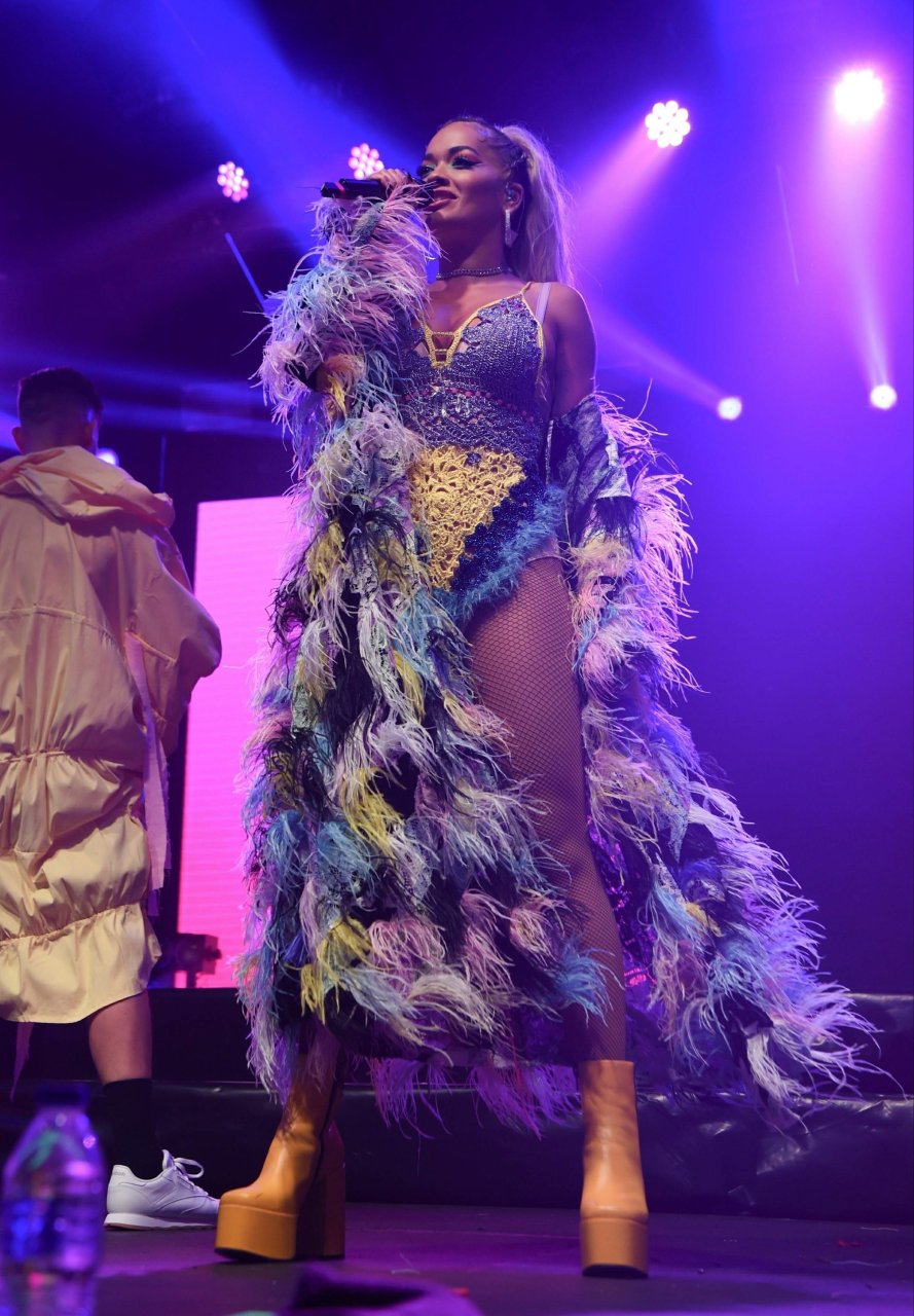 Рита Ора выступает на Главной сцене на Big Weekend Manchester Pride 2018 в Лондоне, 26.08.2018. 27-летняя британская певица выбрала наряд с перьями и сетчатыми колготками.