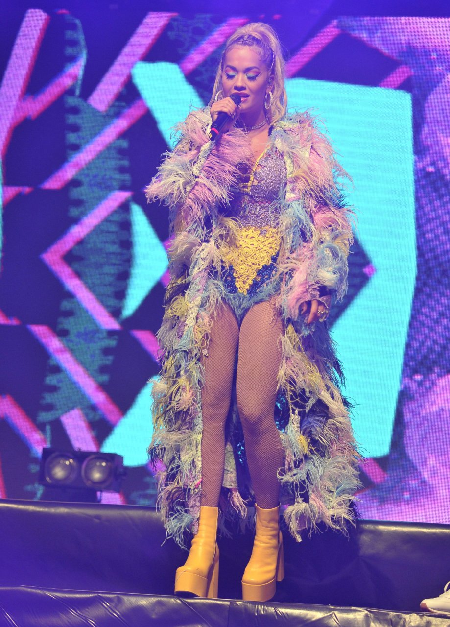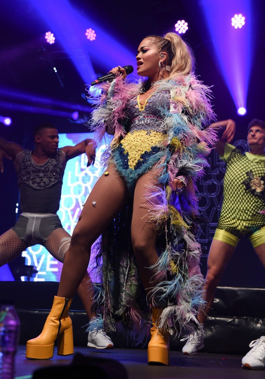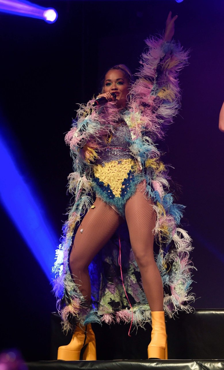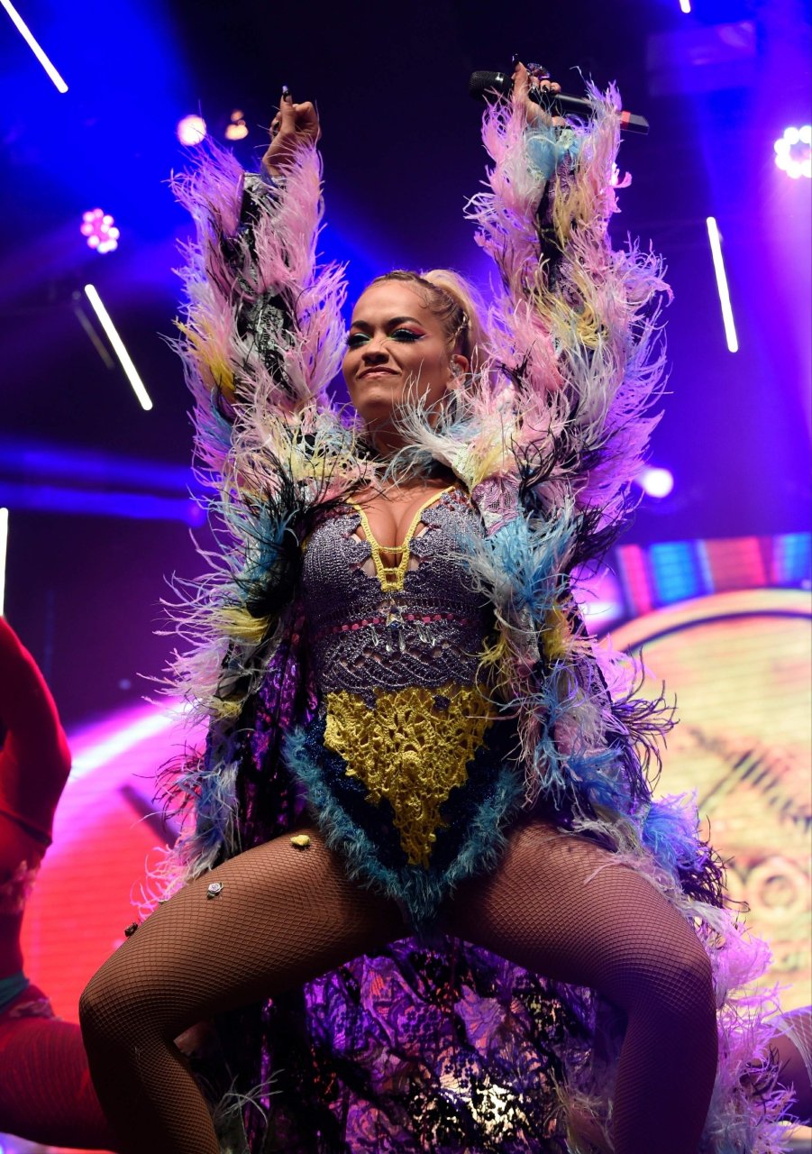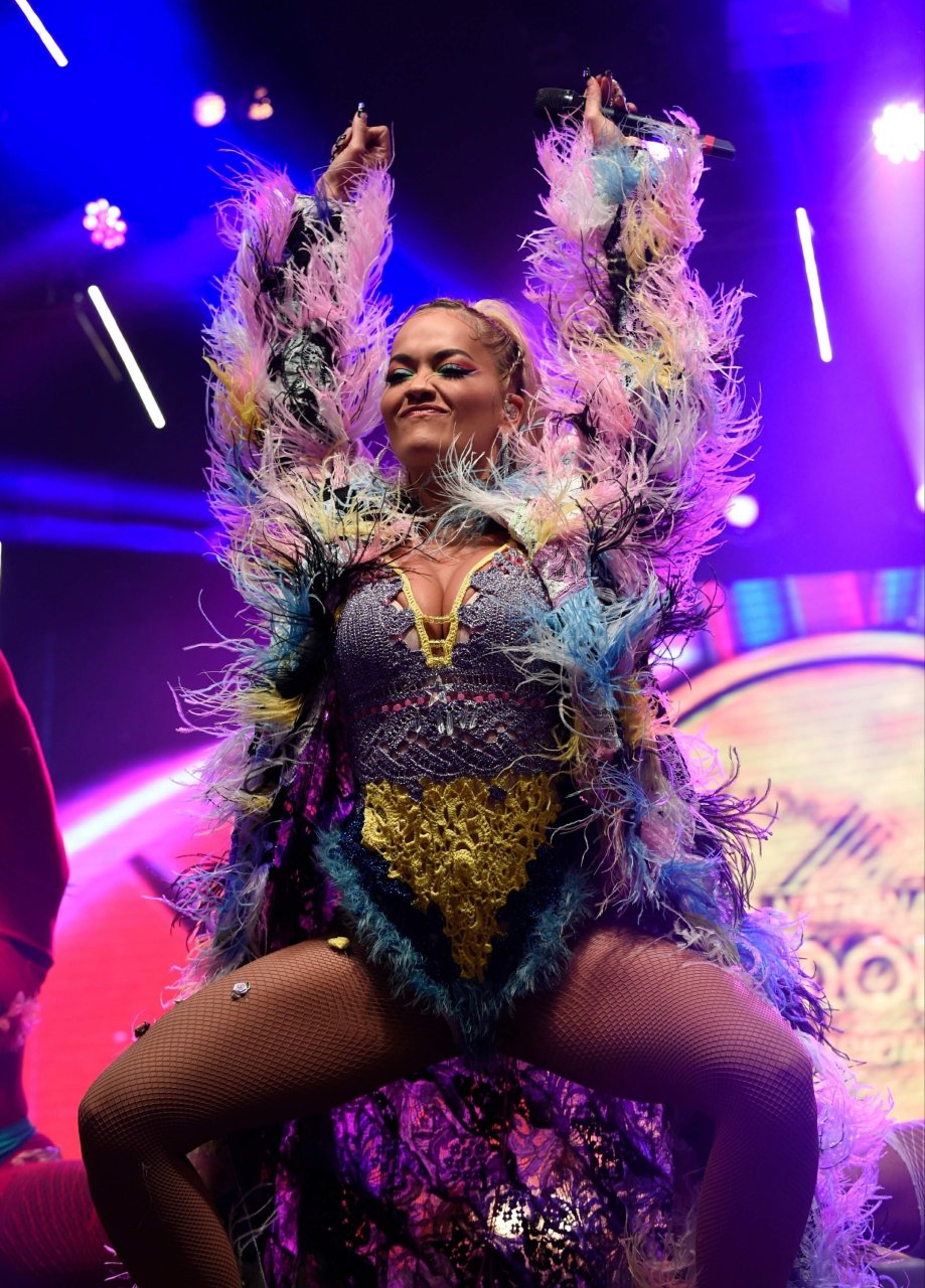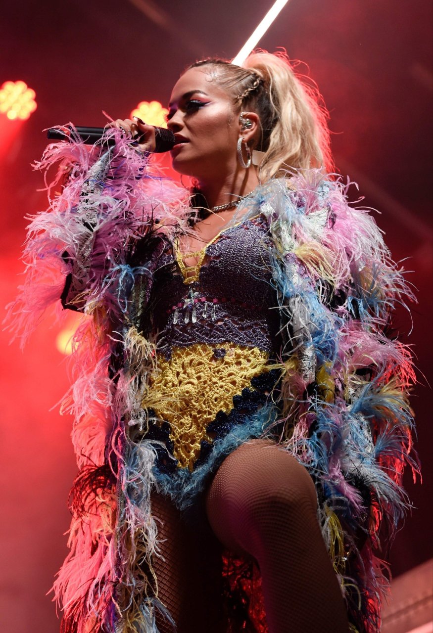 Рита Ора выступает на Главной сцене на Big Weekend Manchester Pride 2018 в Лондоне, 26.08.2018. 27-летняя британская певица выбрала наряд с перьями и сетчатыми колготками.