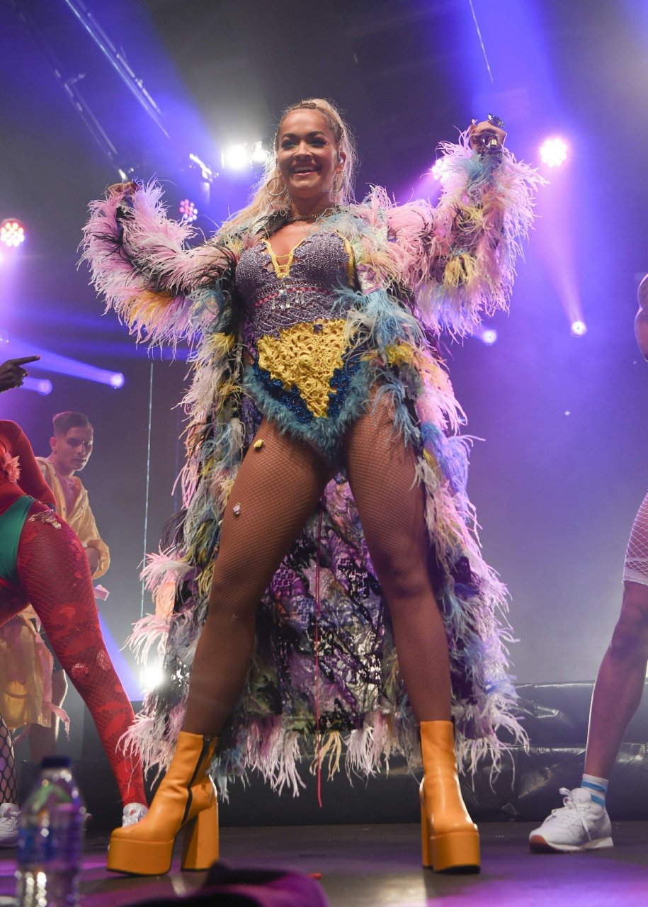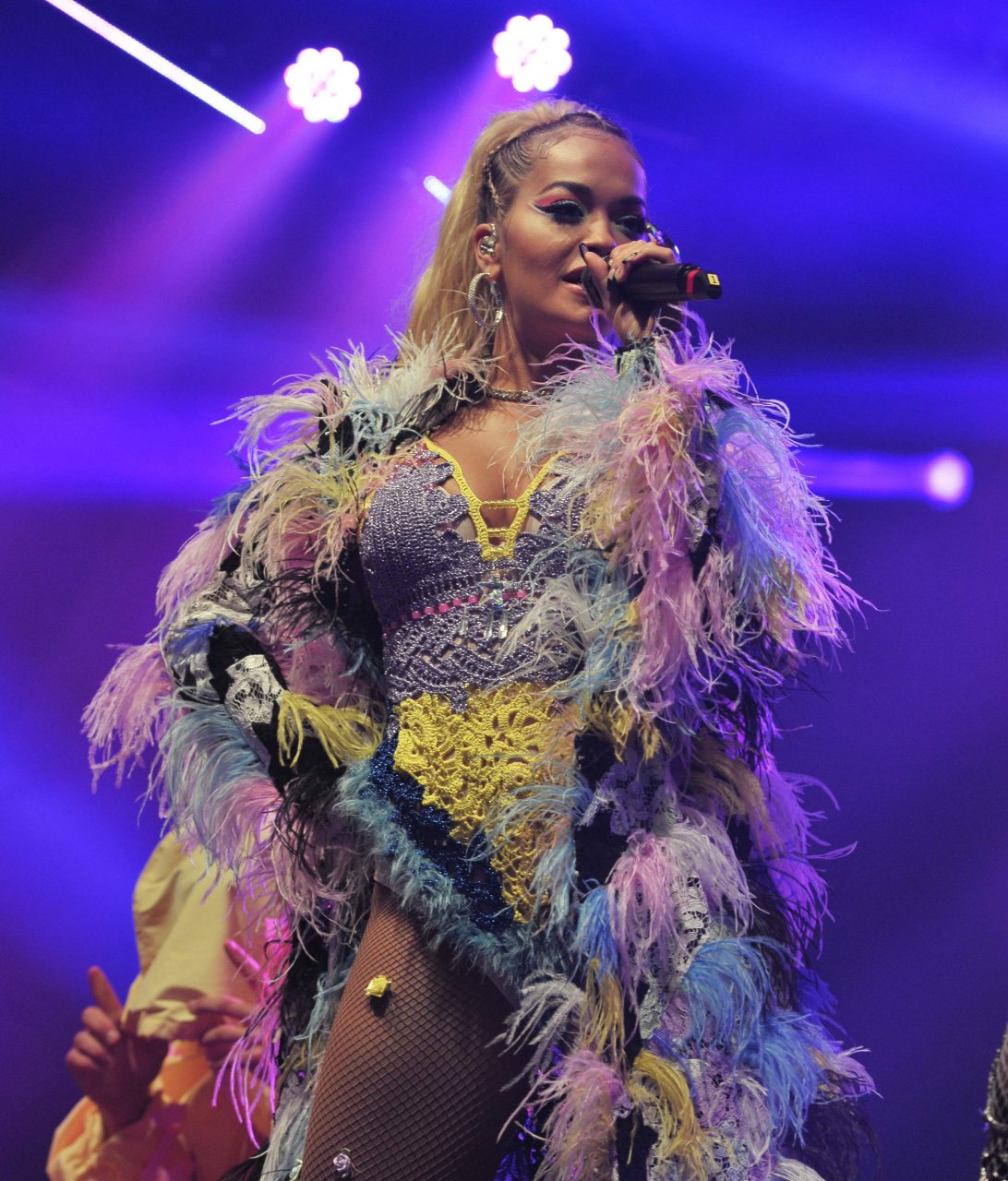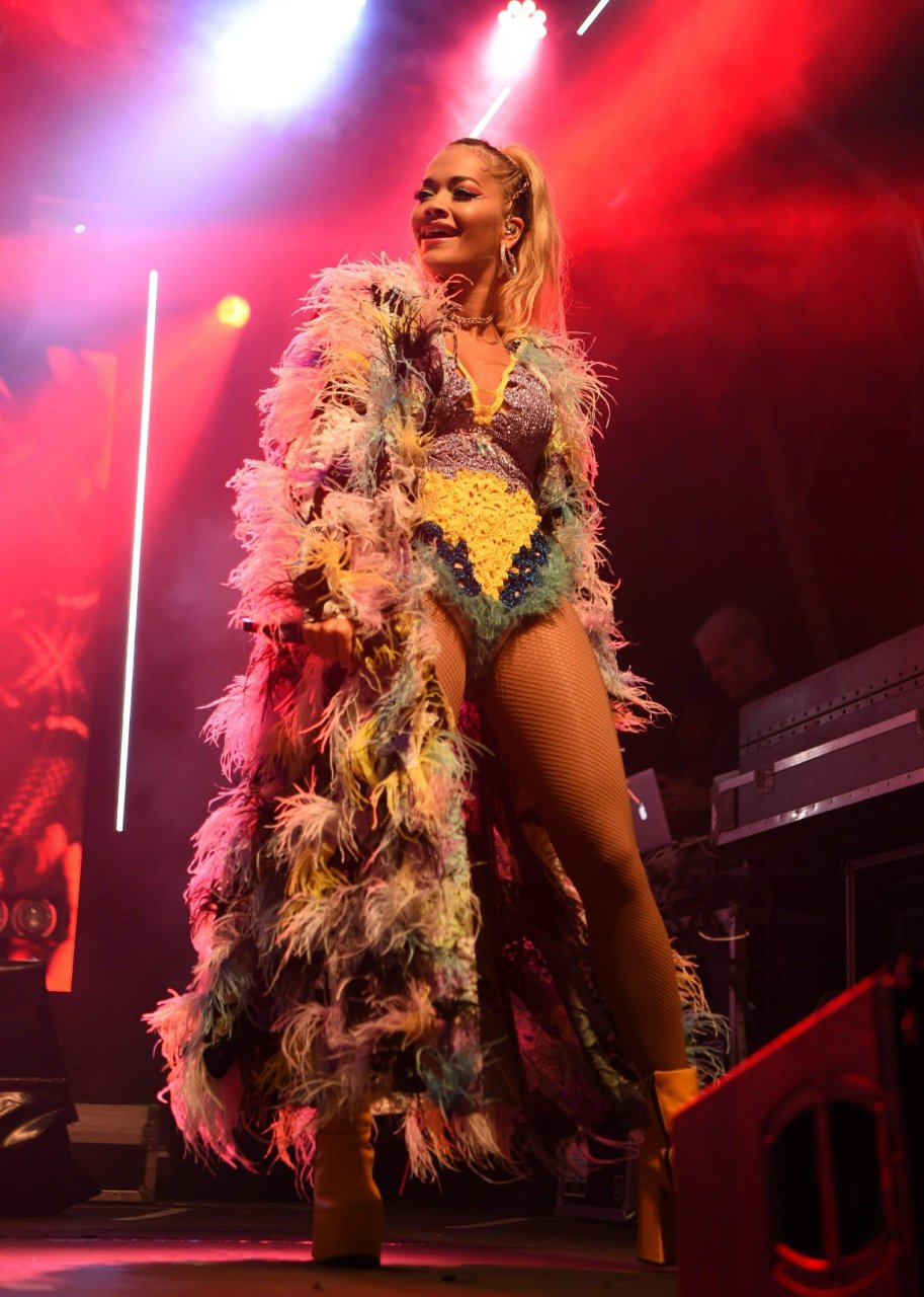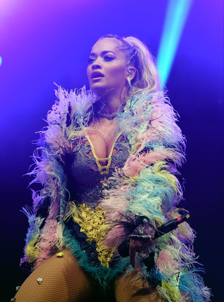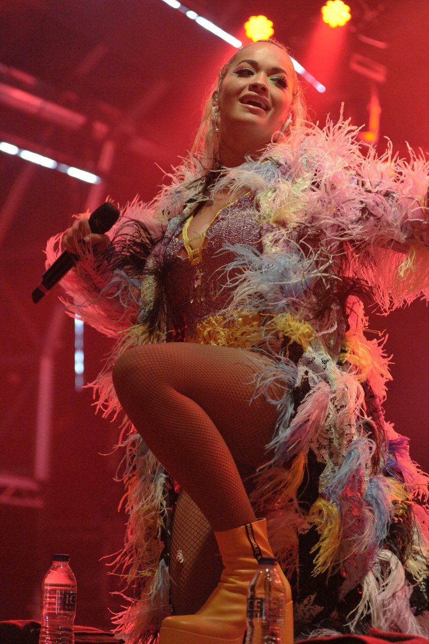 Рита Ора выступает на Главной сцене на Big Weekend Manchester Pride 2018 в Лондоне, 26.08.2018. 27-летняя британская певица выбрала наряд с перьями и сетчатыми колготками.