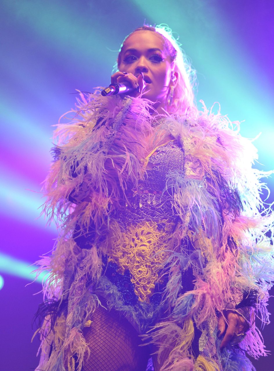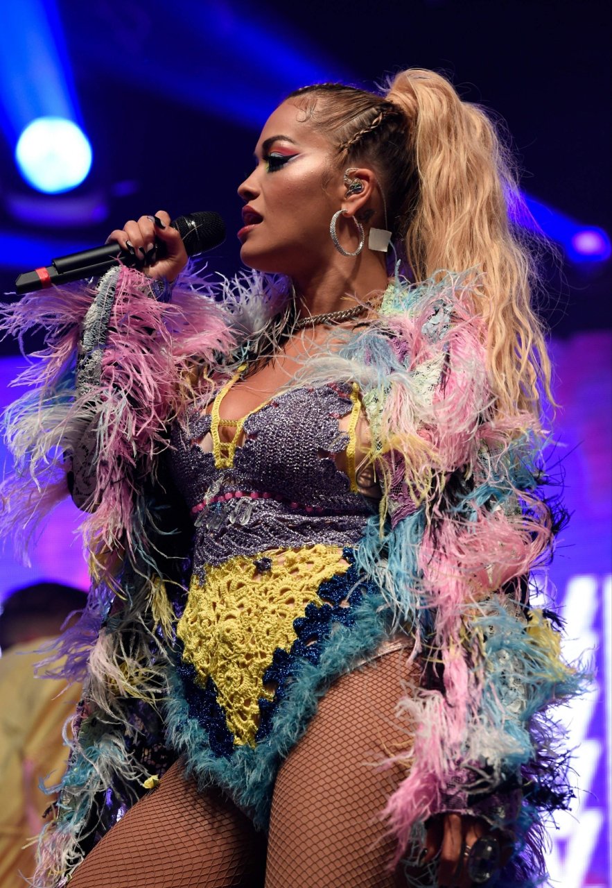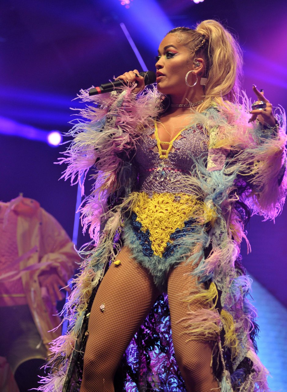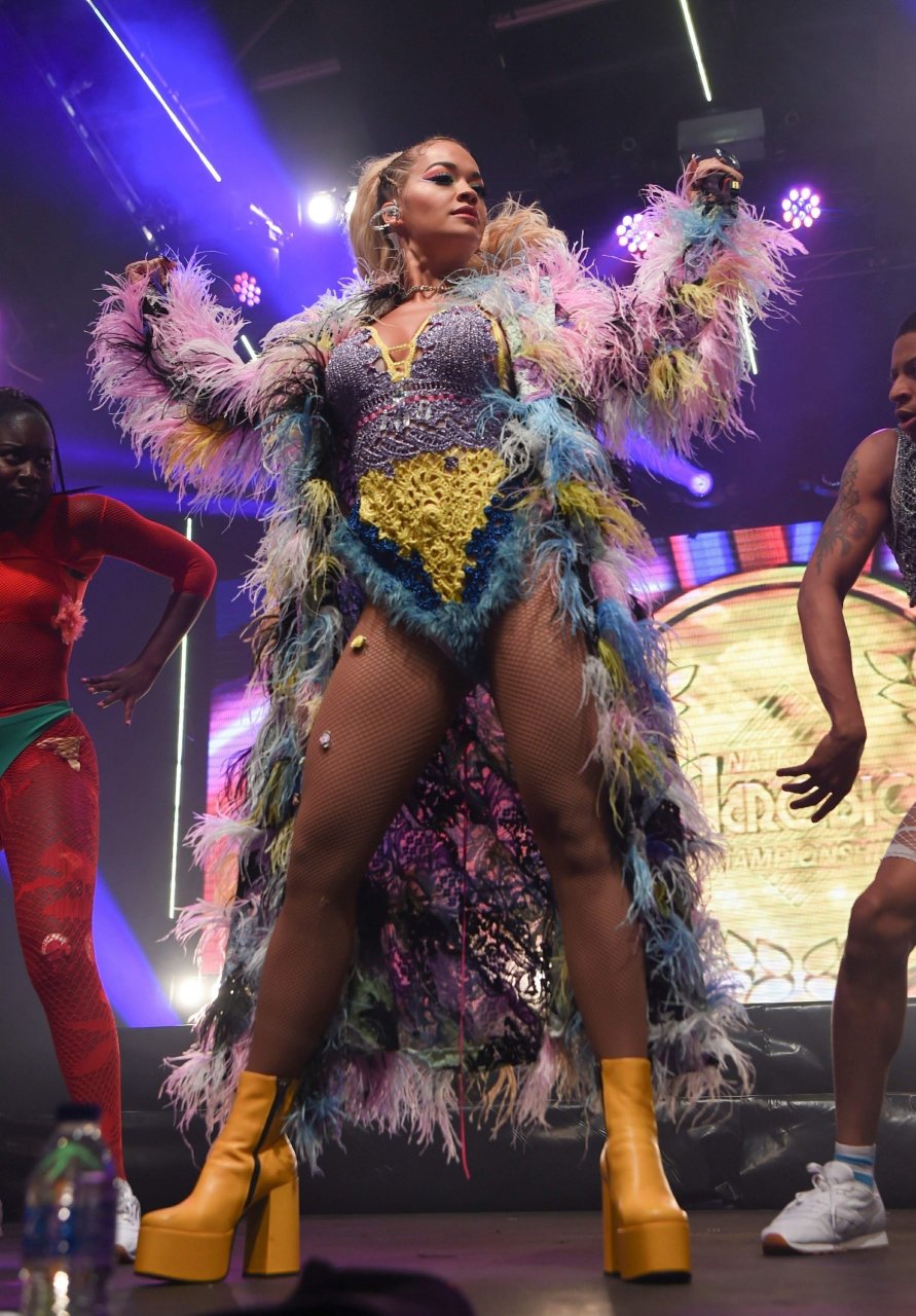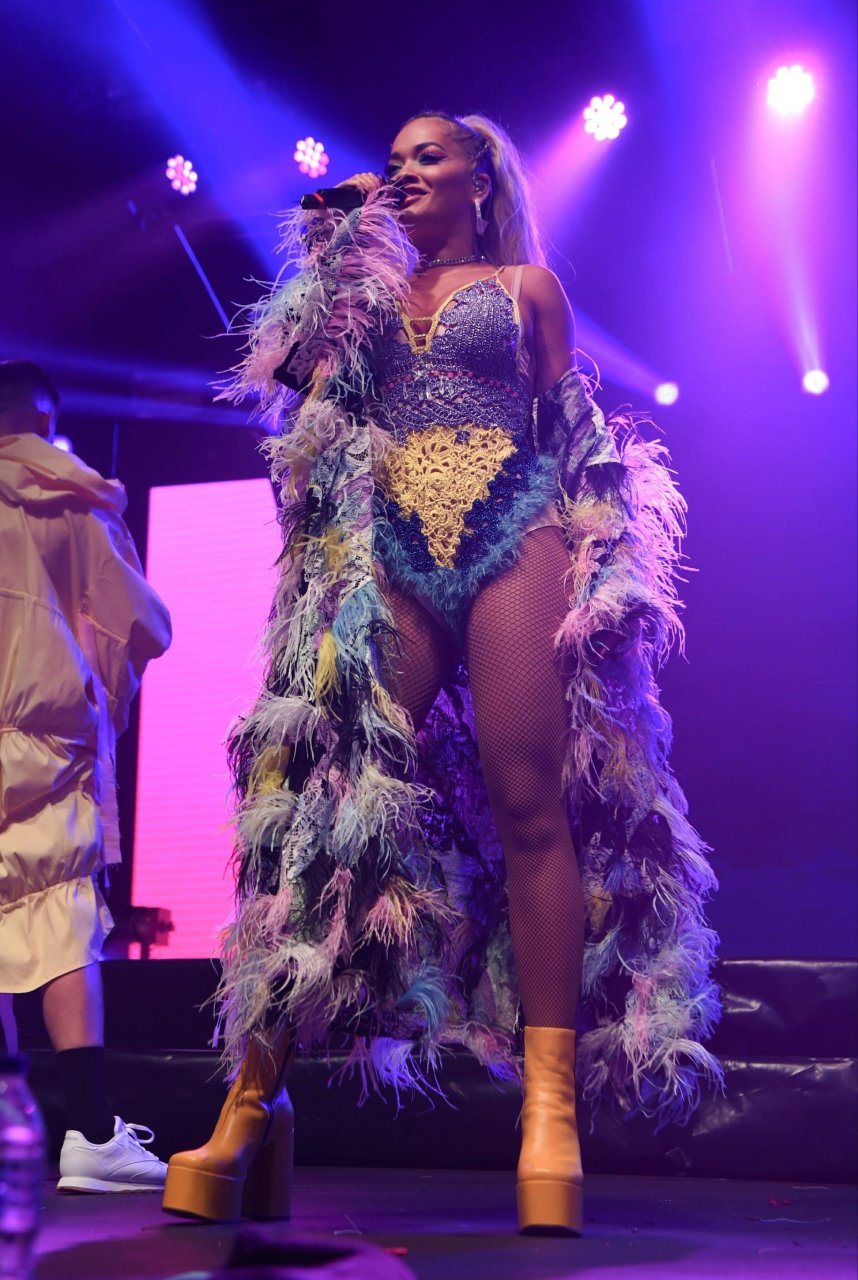 Рита Ора выступает на Главной сцене на Big Weekend Manchester Pride 2018 в Лондоне, 26.08.2018. 27-летняя британская певица выбрала наряд с перьями и сетчатыми колготками.