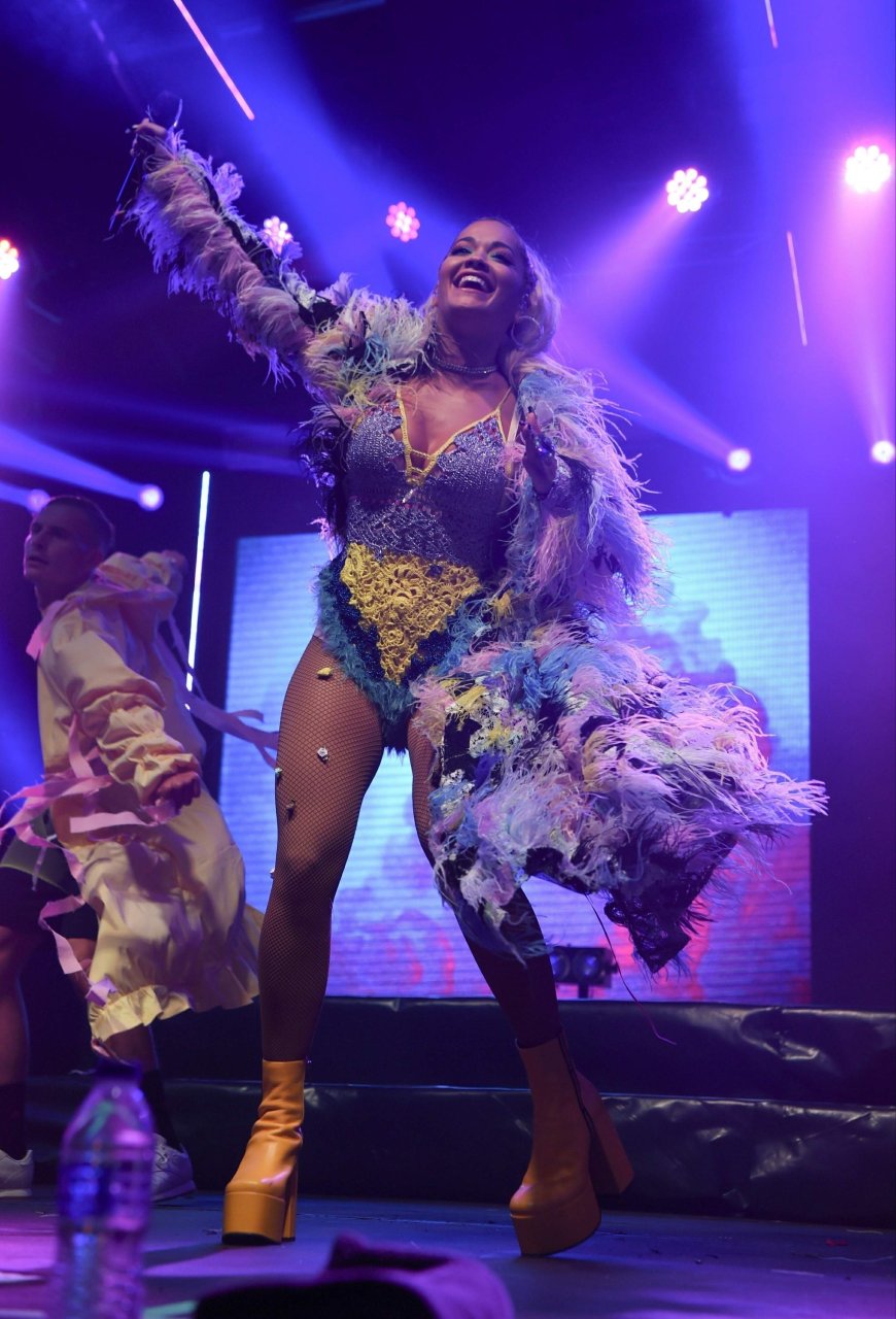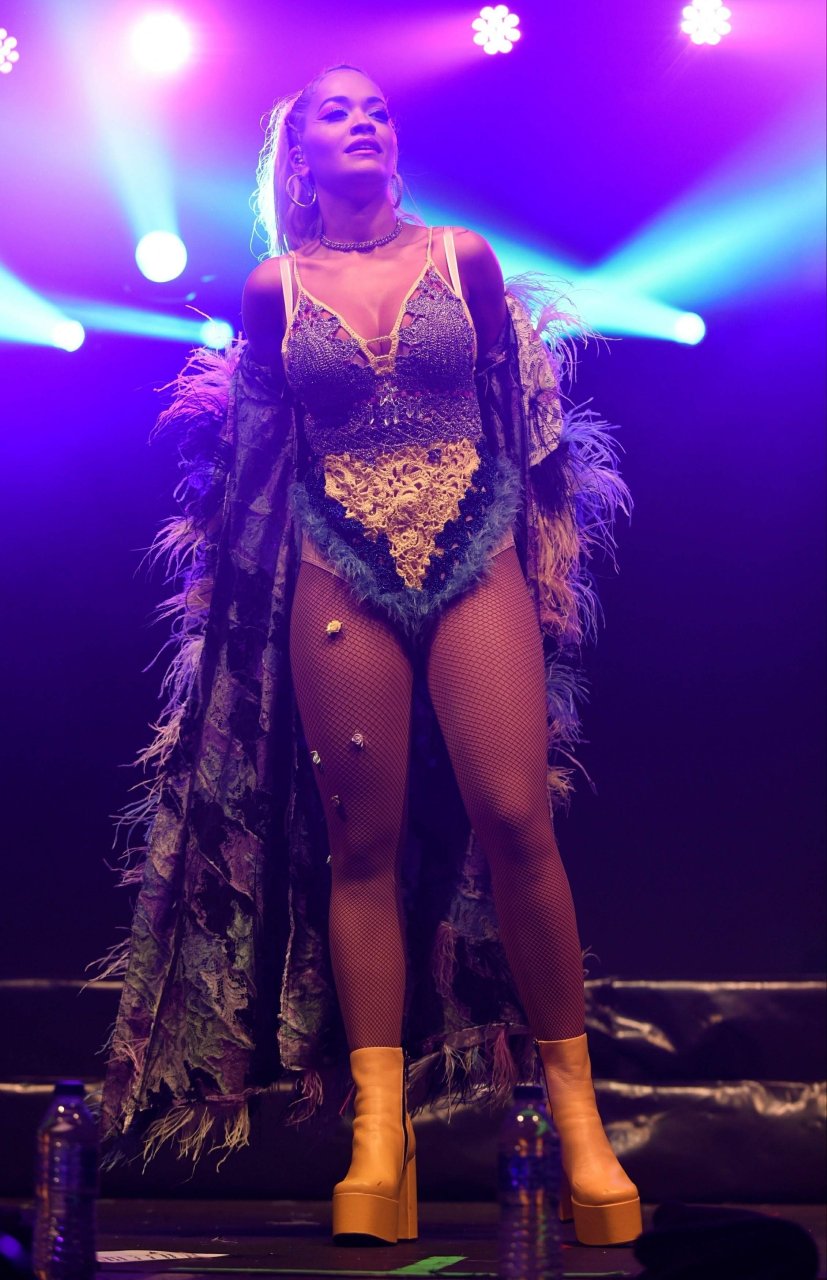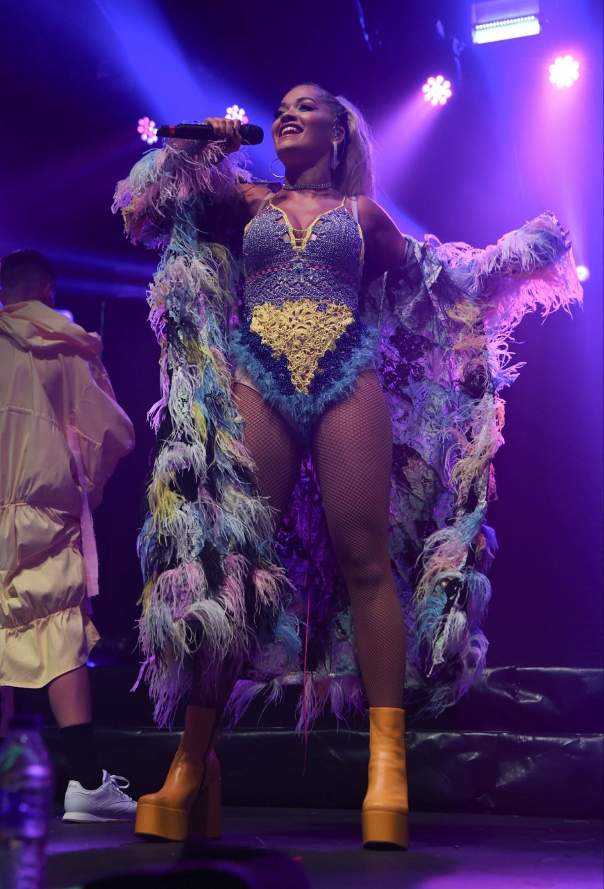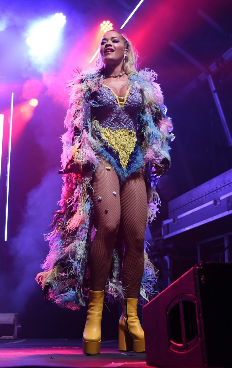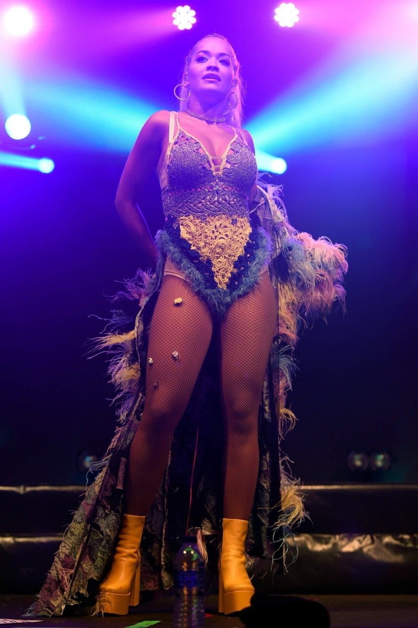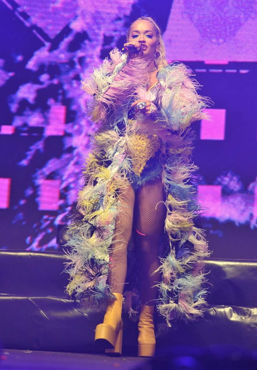Рита Ора выступает на Главной сцене на Big Weekend Manchester Pride 2018 в Лондоне, 26.08.2018. 27-летняя британская певица выбрала наряд с перьями и сетчатыми колготками.