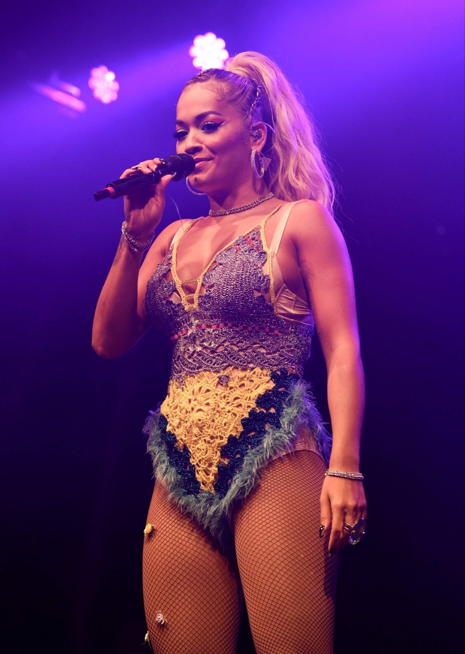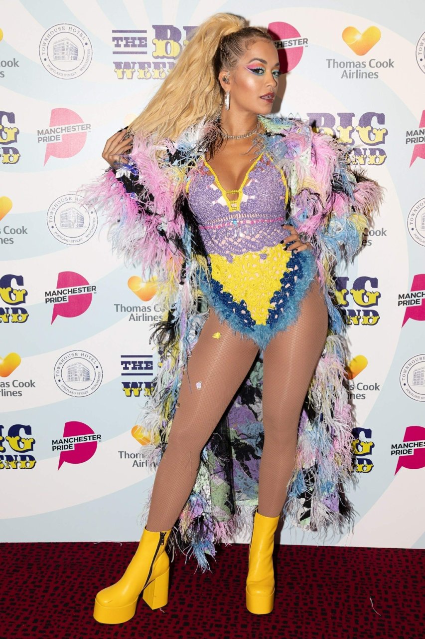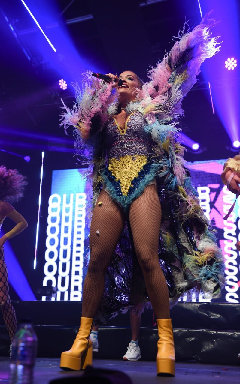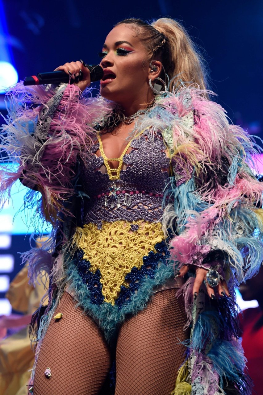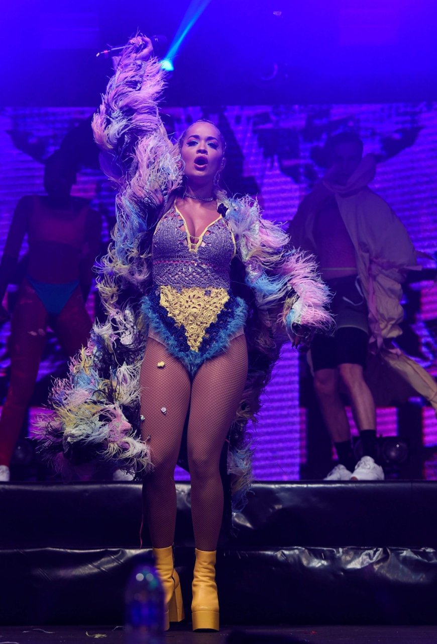 Рита Ора выступает на Главной сцене на Big Weekend Manchester Pride 2018 в Лондоне, 26.08.2018. 27-летняя британская певица выбрала наряд с перьями и сетчатыми колготками.