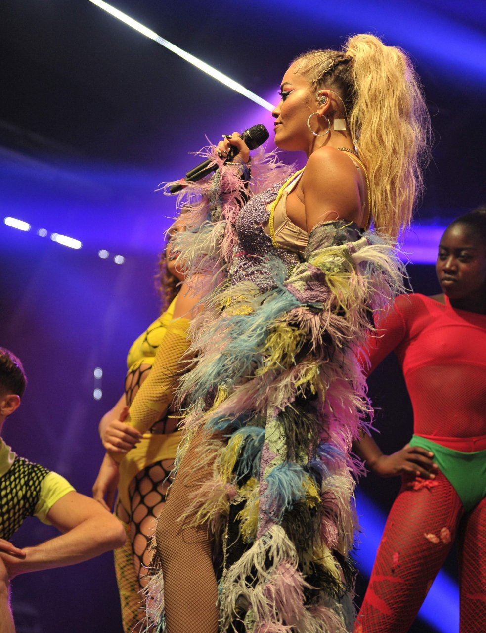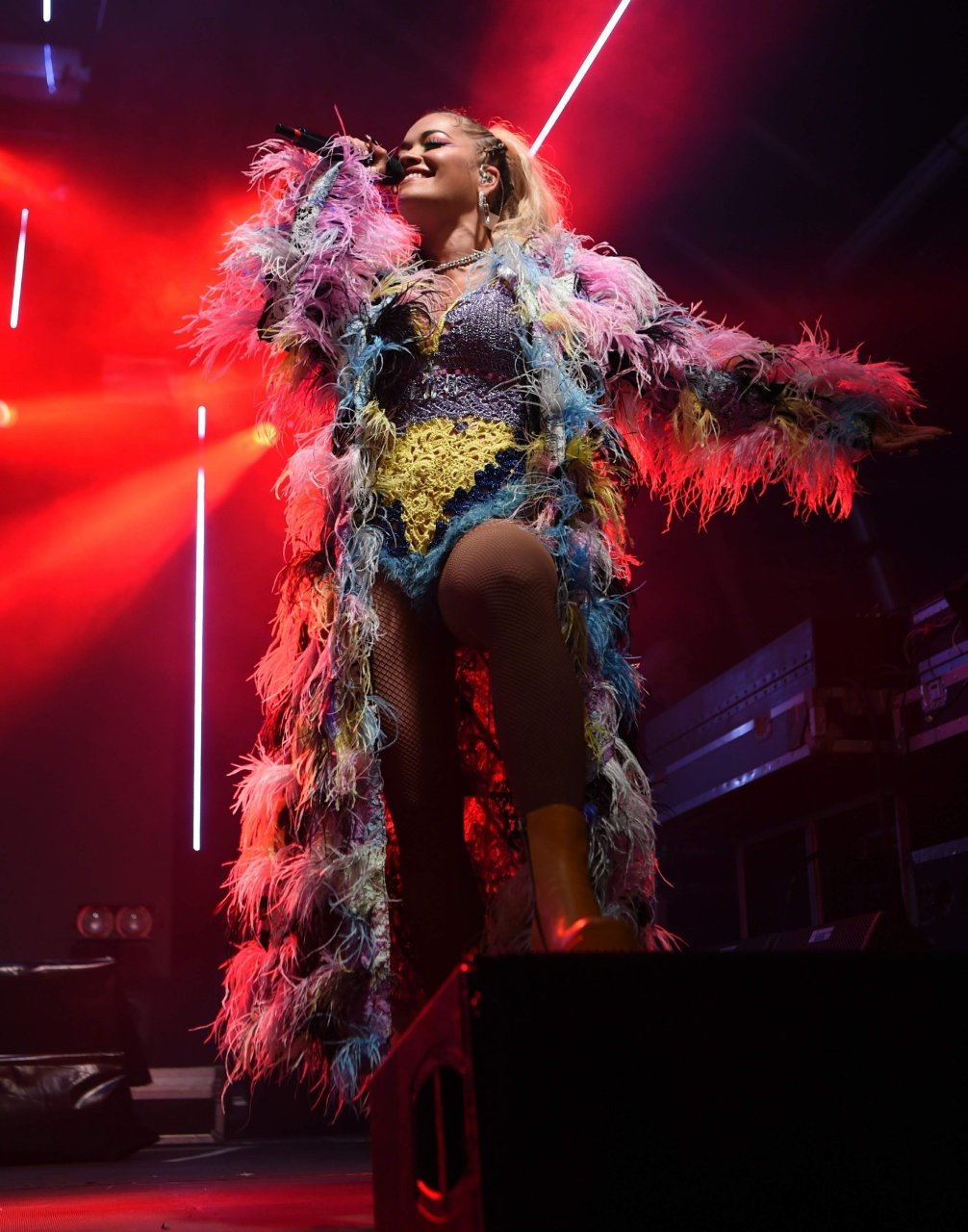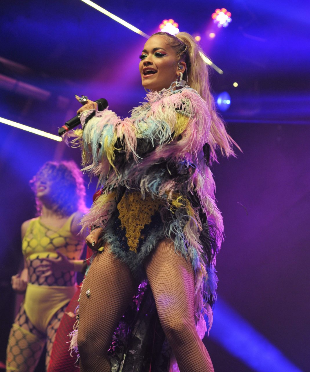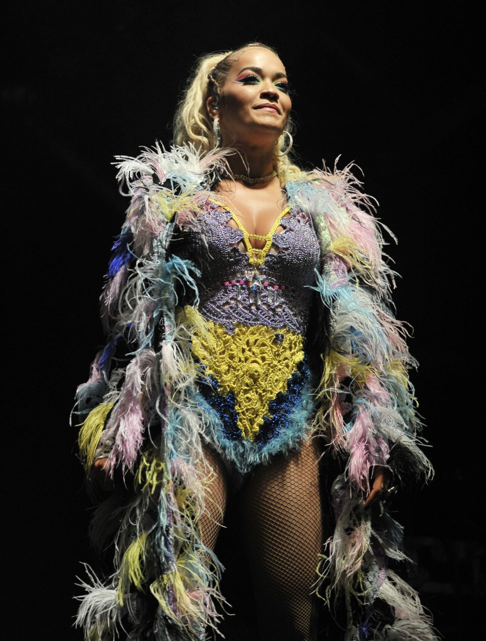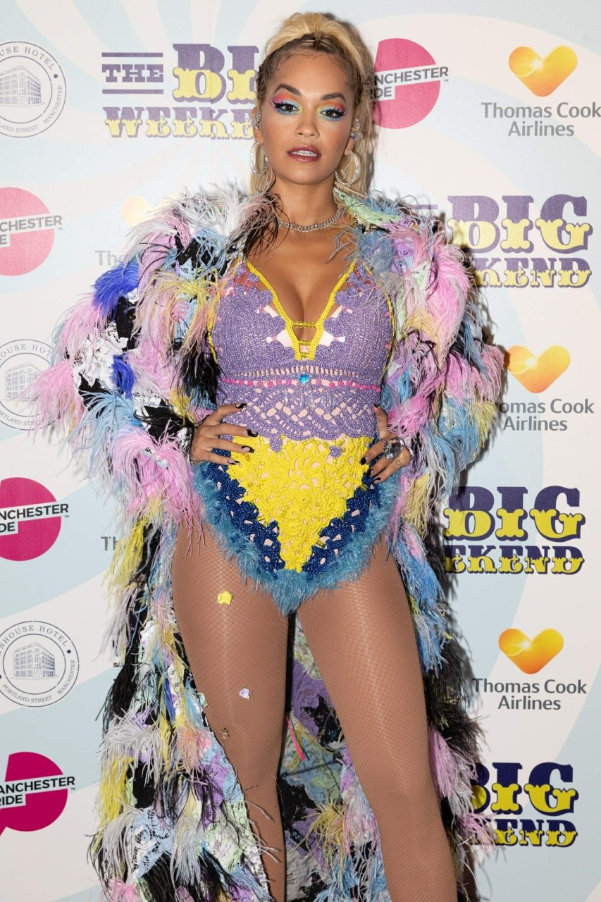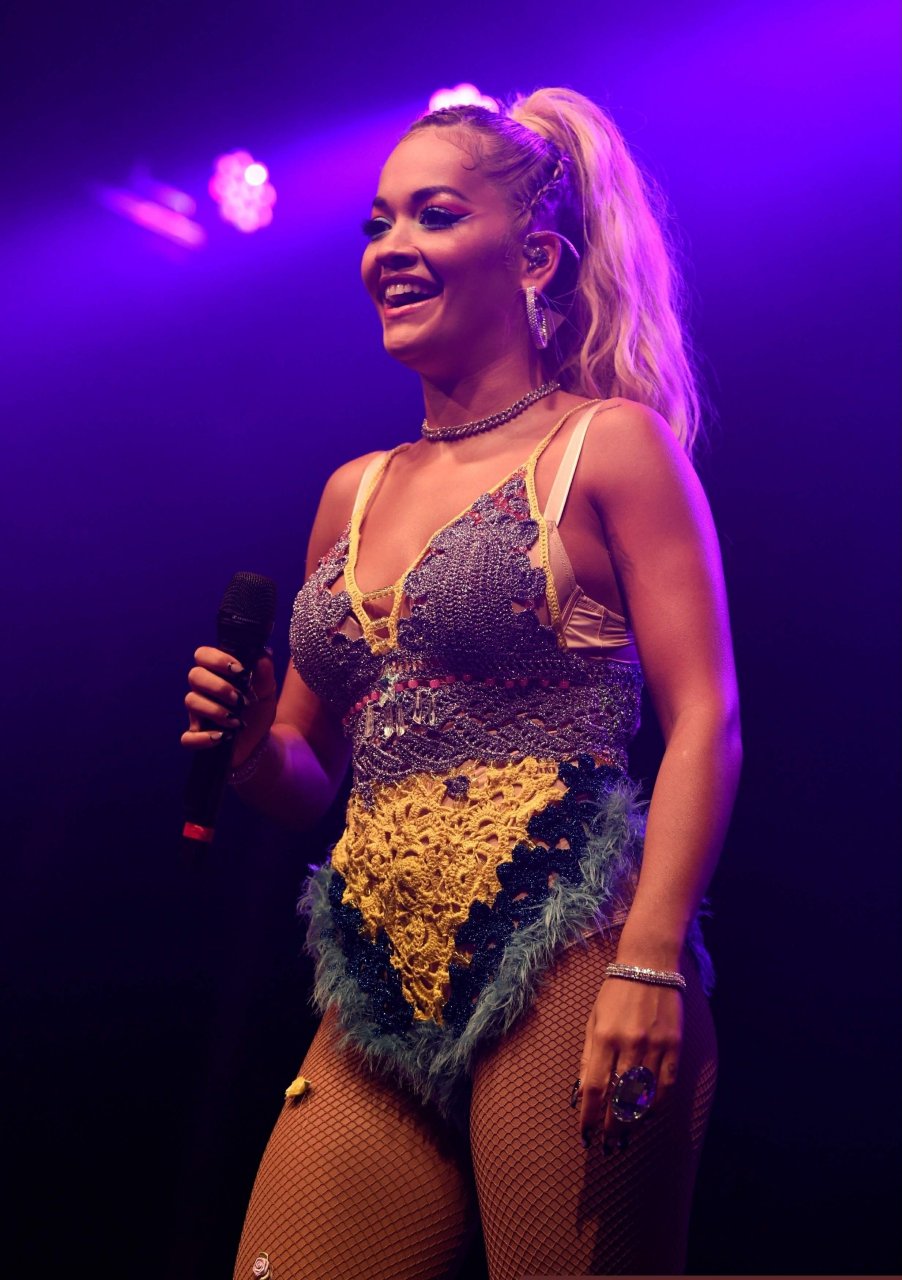 Рита Ора выступает на Главной сцене на Big Weekend Manchester Pride 2018 в Лондоне, 26.08.2018. 27-летняя британская певица выбрала наряд с перьями и сетчатыми колготками.