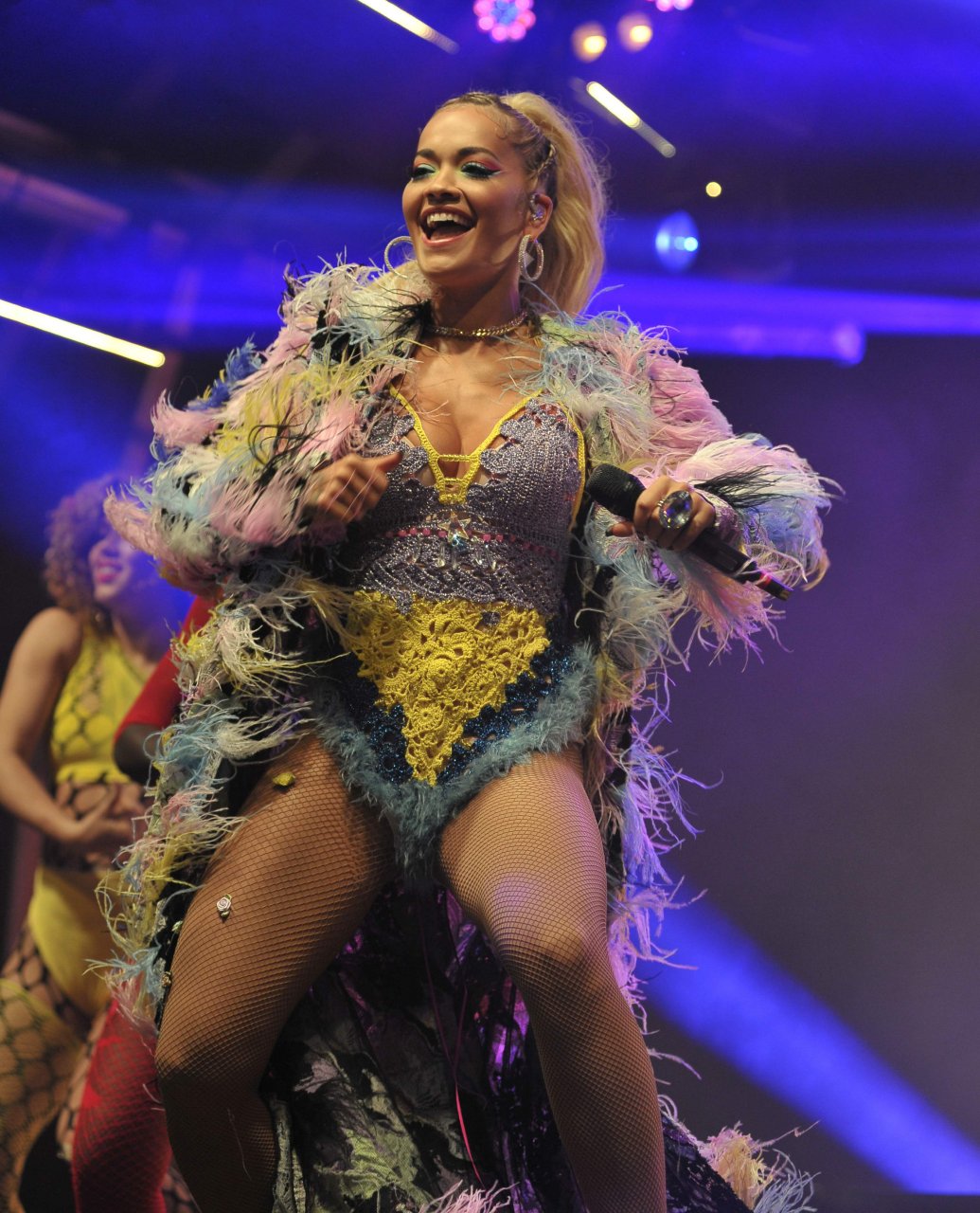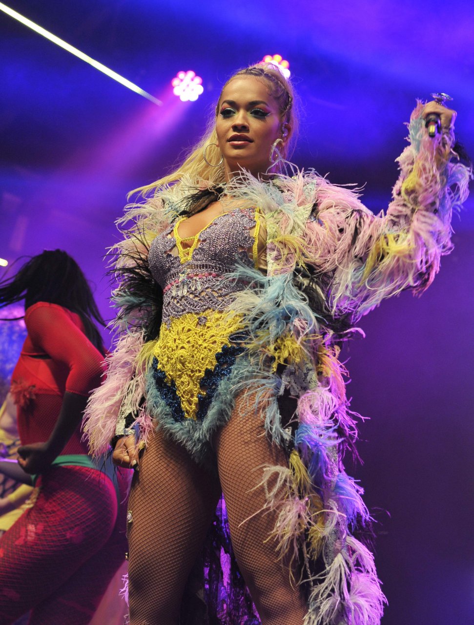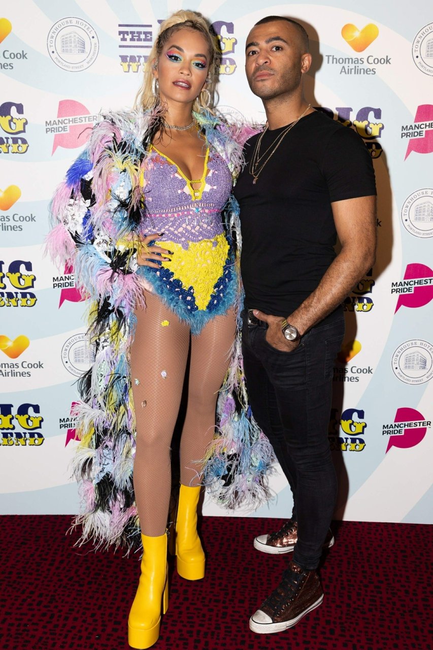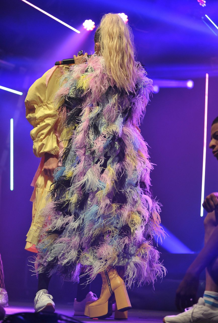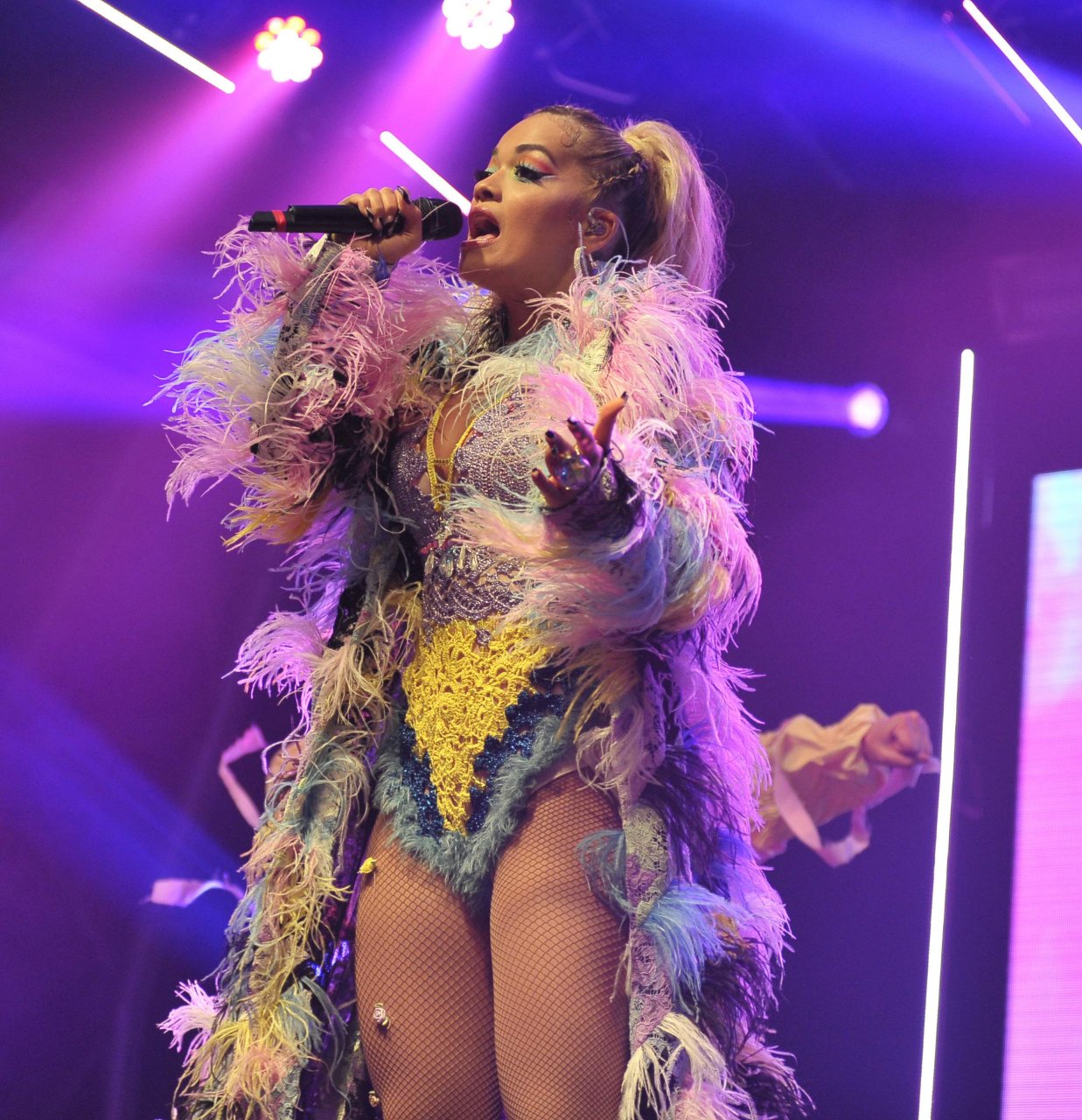 Рита Ора выступает на Главной сцене на Big Weekend Manchester Pride 2018 в Лондоне, 26.08.2018. 27-летняя британская певица выбрала наряд с перьями и сетчатыми колготками.